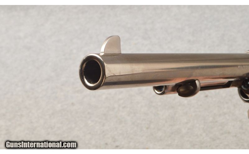 Description: This Taylor & Company Model 1873 S.A. Cattleman is in excellent(ANIB) as new in box condition. The polished nickel plated barrel and frame are excellent. The 7 1/2" nickel plated barrel is excellent with sharp clear rifling in its bore. The curved smooth single action trigger has been Taylor & Co. 'tuned' to be smooth and responsive. The one piece medium dark walnut hand grips are excellent with no flaws. This Model 1873 is produced by A. Uberti Company in Italy for Taylor & Company. This is truly a beautiful work of functional art. This Model 1873 Cattleman comes with the factory cardboard box, black soft zipper bag, instruction manual and cable lock. .45 Long Colt SOLD Metal Condition: Excellent Wood Condition: Excellent Bore Condition: Excellent Barrels: 7 1/2" Nickel Plated Triggers: Single Action Curved Smooth Stock Dimensions: LOP 3 3/4" Height 5 1/2" Length 13 1/4 Weight: 39 OZ. Sights: Front Fixed Blade with Rear Fixed Frame Notch Item Location: West Chester, OH |