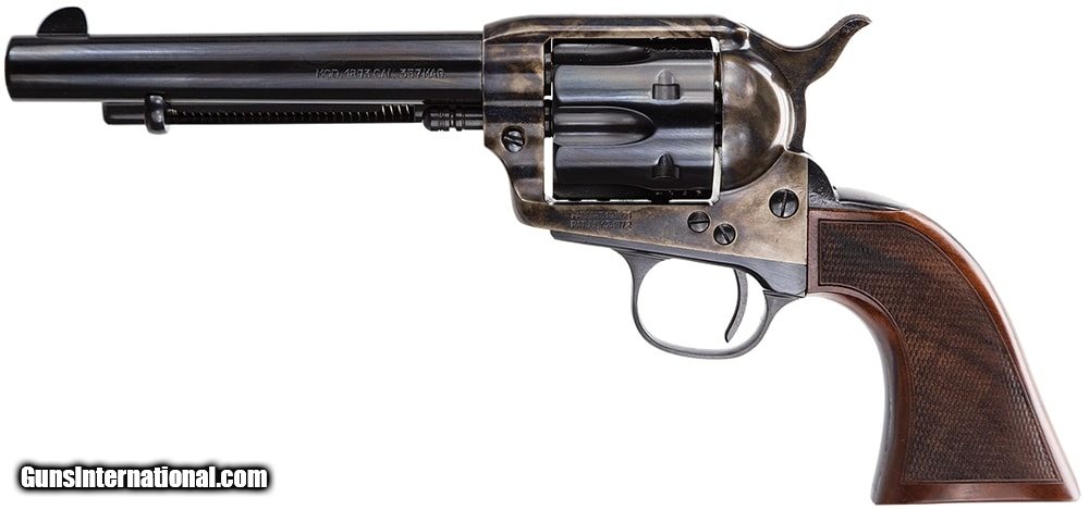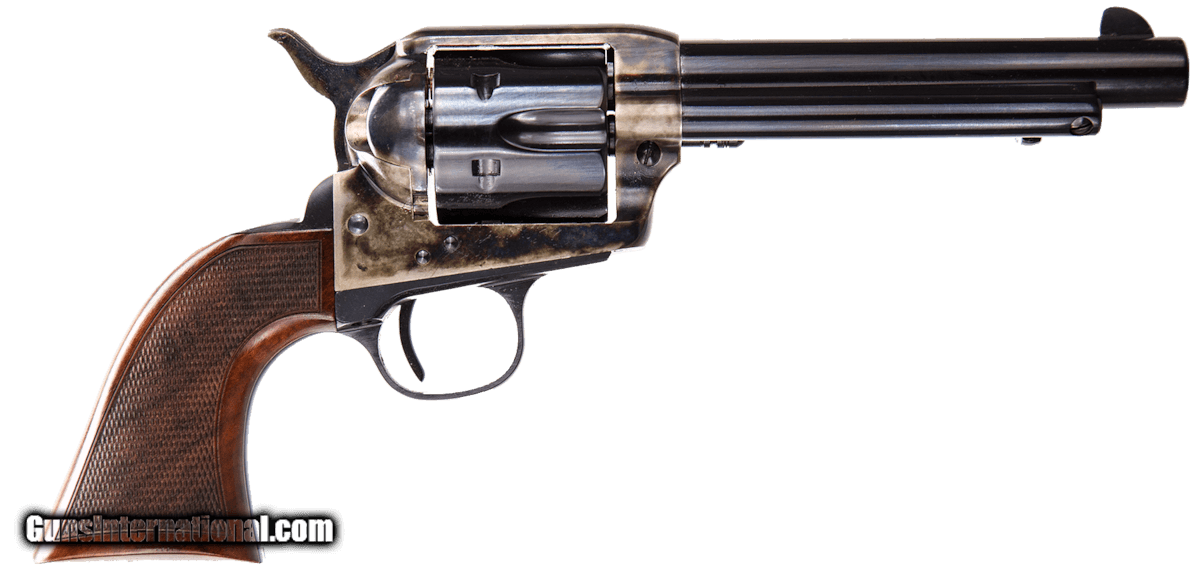 Description: Guns Listing ID: 949 The Taylors Company The Smoke Wagon is a six-shot revolver chambered in 357 Mag 44-40 Win or 45 LC. Barrels are available at 3.5 4.75 or 5.5 in length each of which are adorned by a fixed blade front sight and an in-frame notch rear sight. The Smoke Wagons frame features a blued case-hardened finish. Thin checkered walnut grips ensure a steady grasp with each shot fired. Details Barrel Length 5.5 Inch - Caliber .357 Mag. - Capacity 6 - Weight 2.50 lbs. - Finish Blue Finish with Case Hardened Frame - GripStock Checkered Walnut - Sights Widened Sight Channel Widened Front Blade - Overall Length 11.1 Inches SOLD Manufacturer: TAYLOR'S & CO. Model: SMOKE WAGON DELUXE Caliber Info: 357 MAGNUM Condition: new Barrels: 5.5 BARREL |