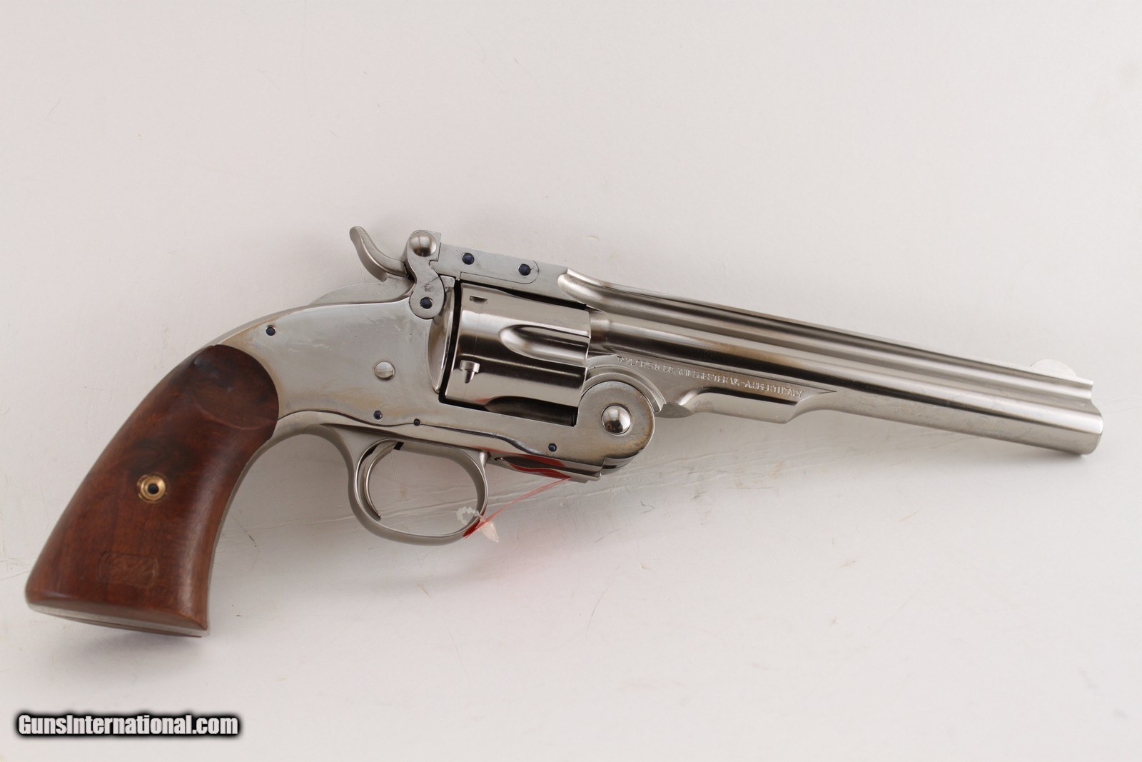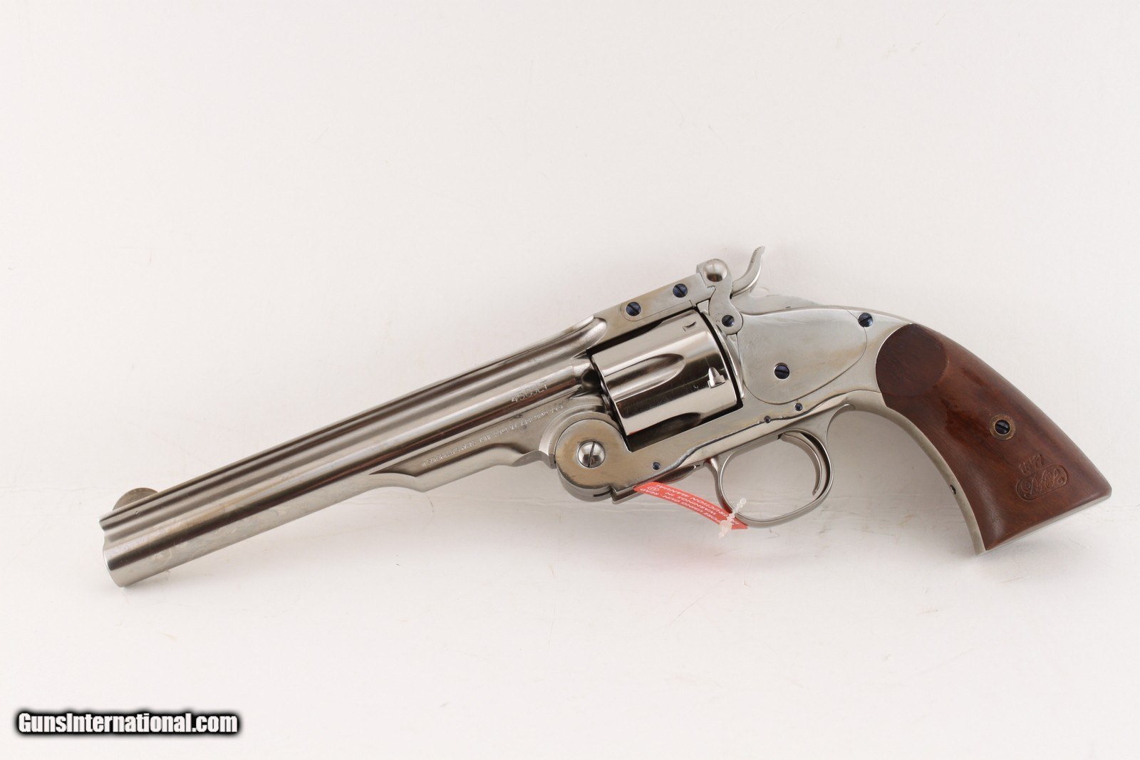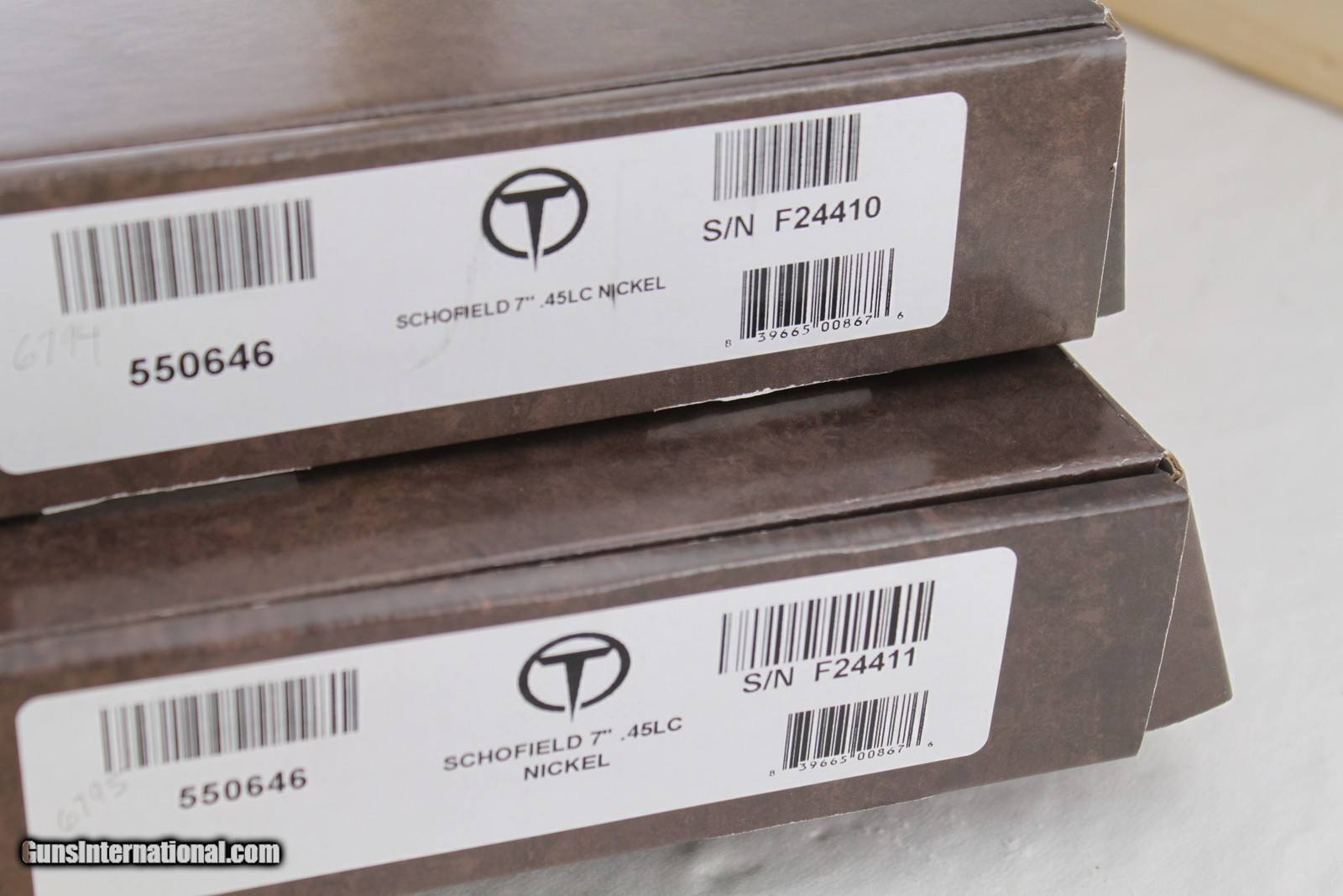 Description: Taylor's & Co Uberti Schofield, Consecutive Pair, 45 Colt, 7 inch barrel, nickel finish, NIB. Please click "Buy Now" to purchase or give us a call. We will need you to make arrangements with your local dealer to provide us with a copy of his FFL. We accept payments via Certified Funds or Visa/Mastercard (2% ) plus shipping. We do not charge sales tax unless you live in Kansas. SOLD Handgun Caliber: .45 Colt Manufacturer: Uberti Model: Schofield |