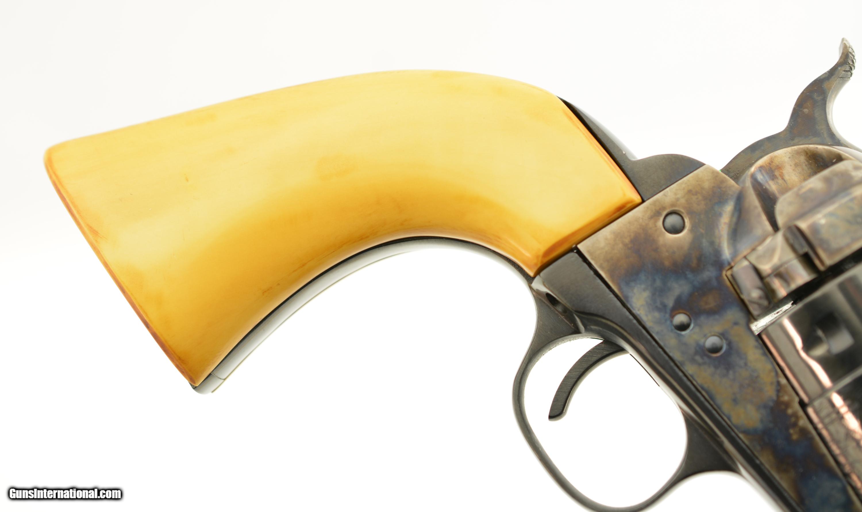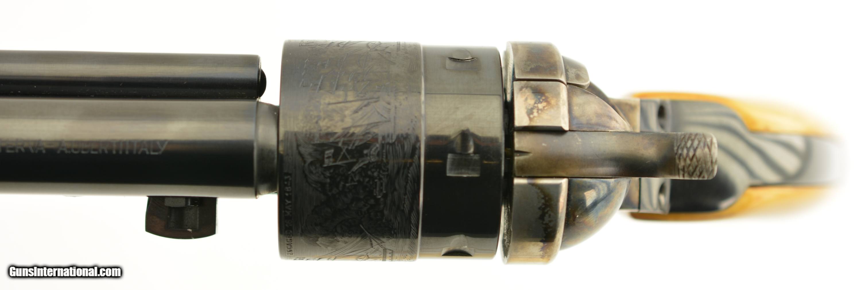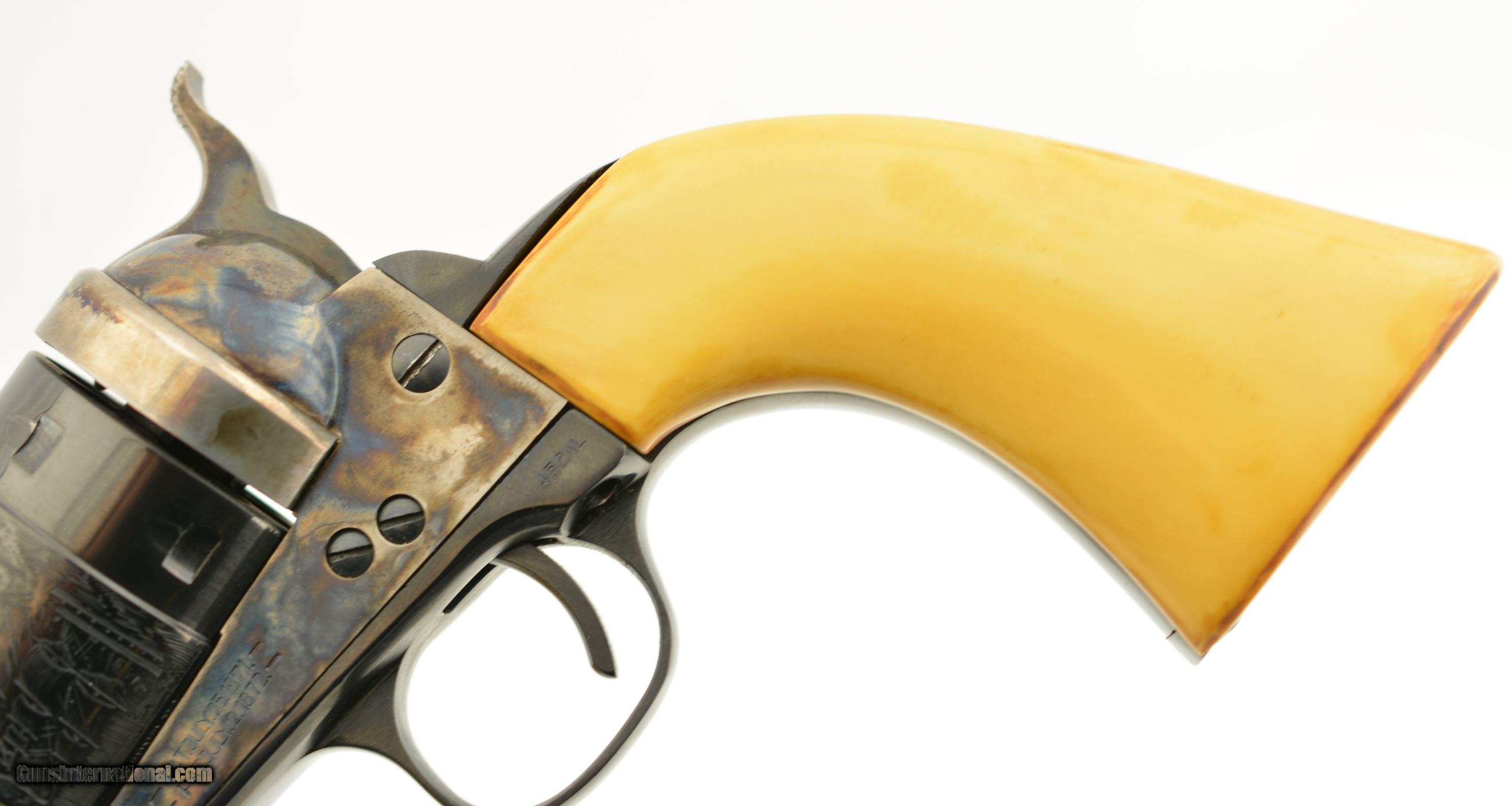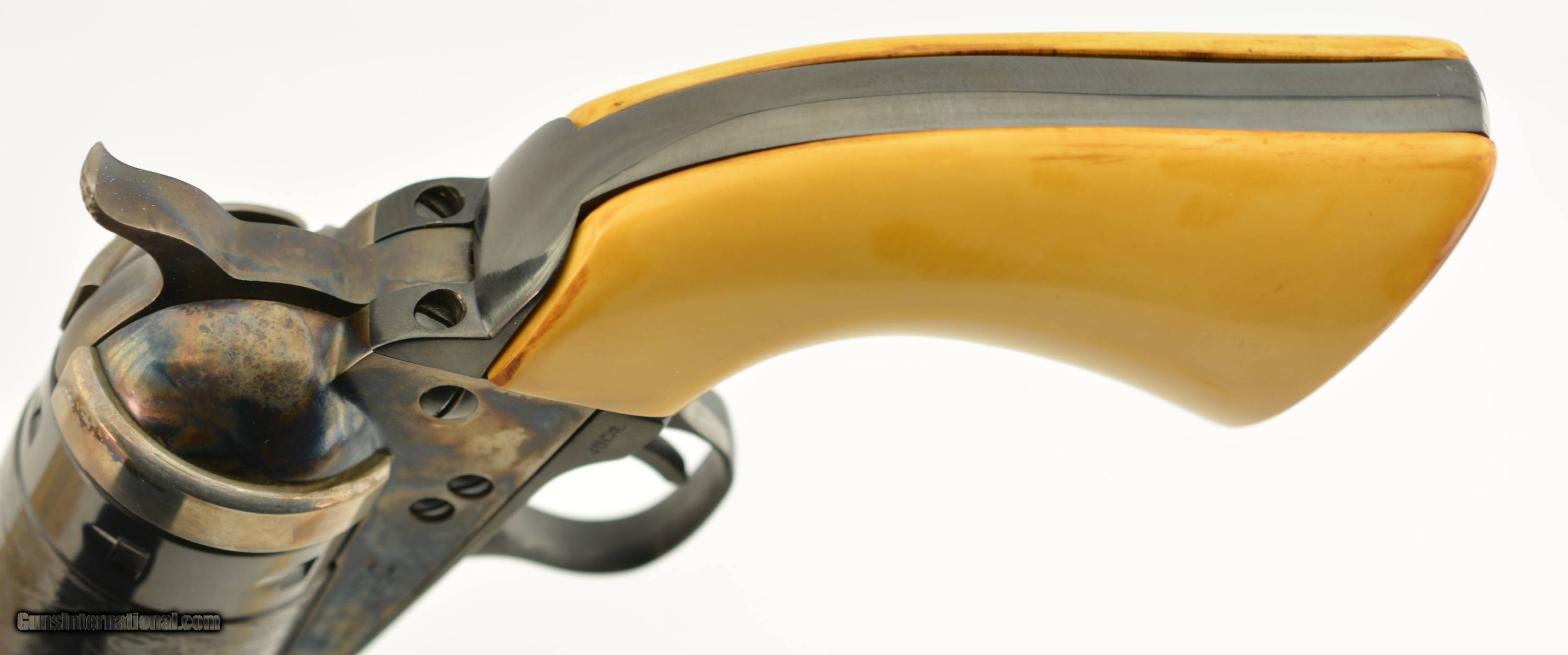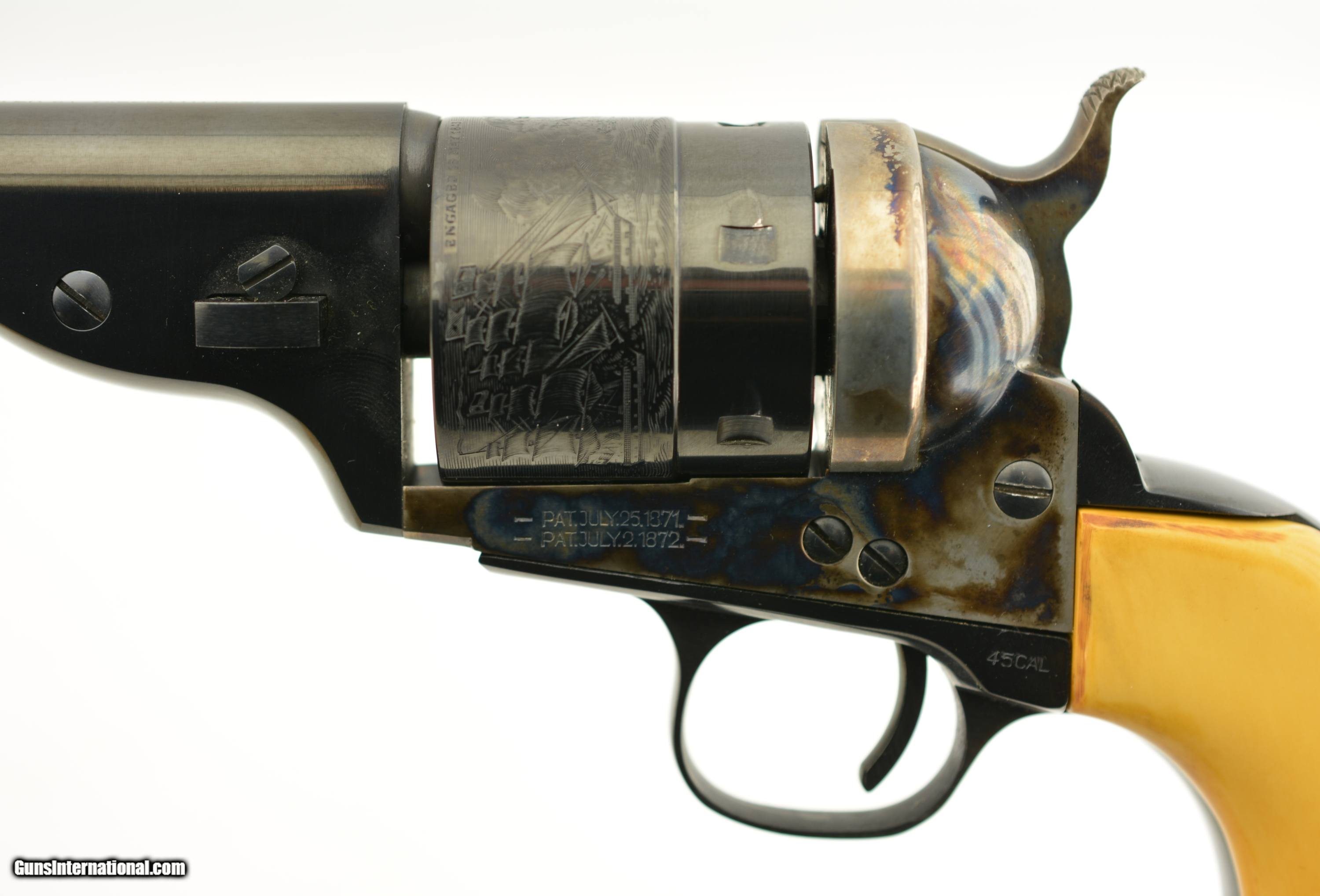Description: Serial #, .45 Long Colt, 8 inch barrel with a bright, excellent bore. This is the Taylor's & Company 1872 Style Cartridge Conversion of the 1860 Army revolver model #15346, SA revolver manufactured in Italy by Uberti featuring smooth simulated ivory grips, roll marked naval battle scene cylinder and a case colored frame. In excellent, like new condition, the barrel, cylinder and grips frame retain virtually all, 99% plus, original blue finish with the frame and hammer showing beautiful case color. The grips are likewise excellent with very little evidence of handling. It comes in the original box numbered to the gun with paperwork and manual. A beautiful, faithful reproduction in a great caliber perfect for the Cowboy Action shooter. FFL SOLD |