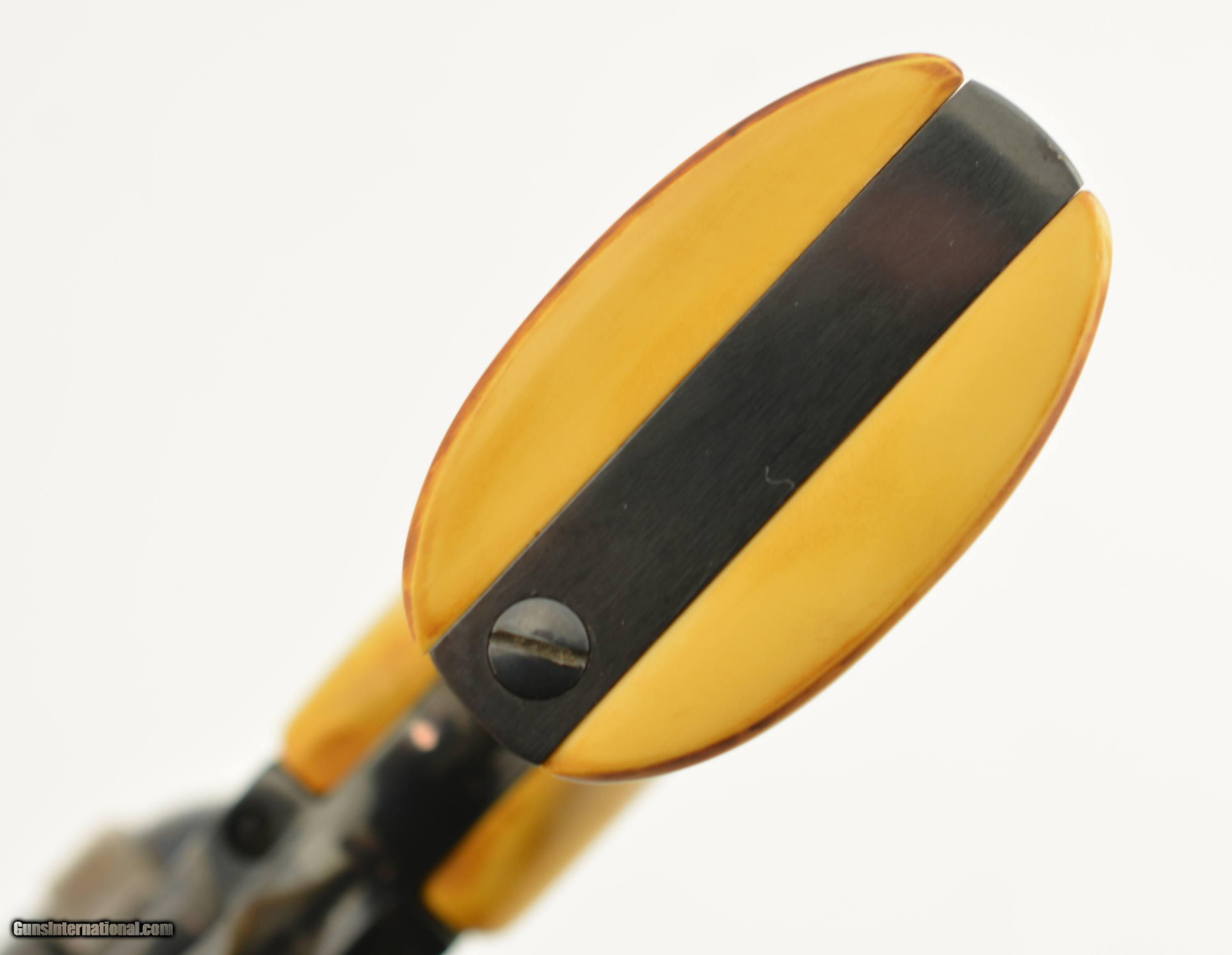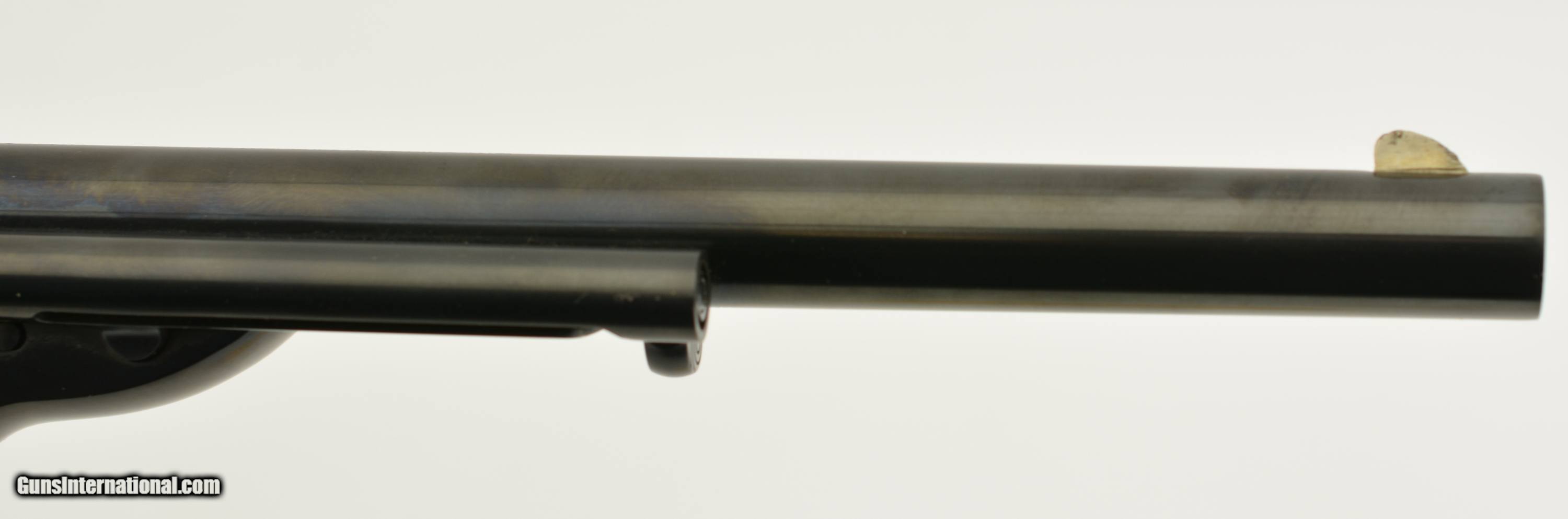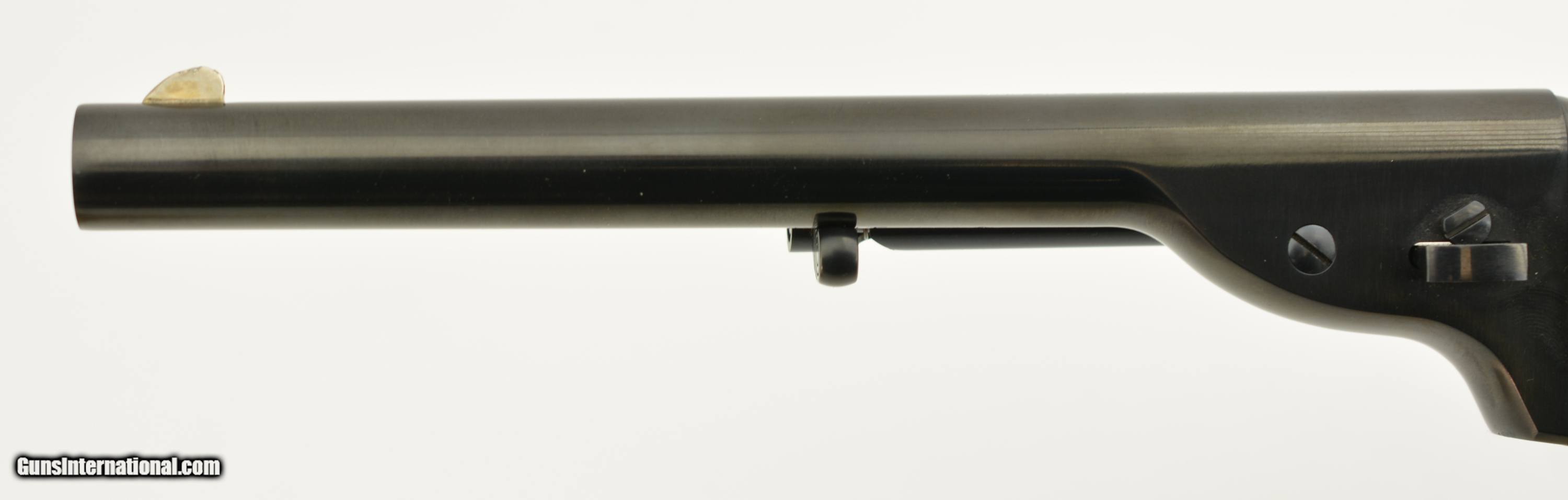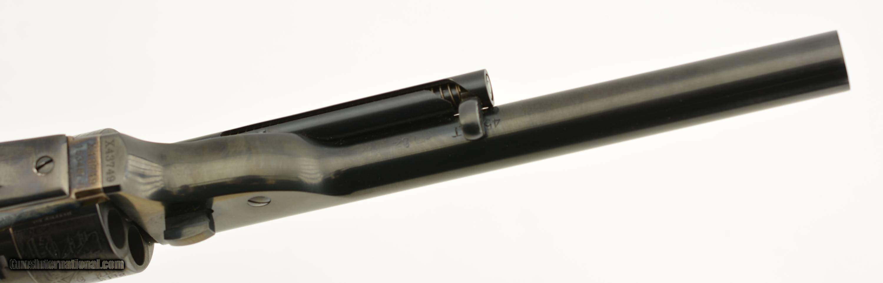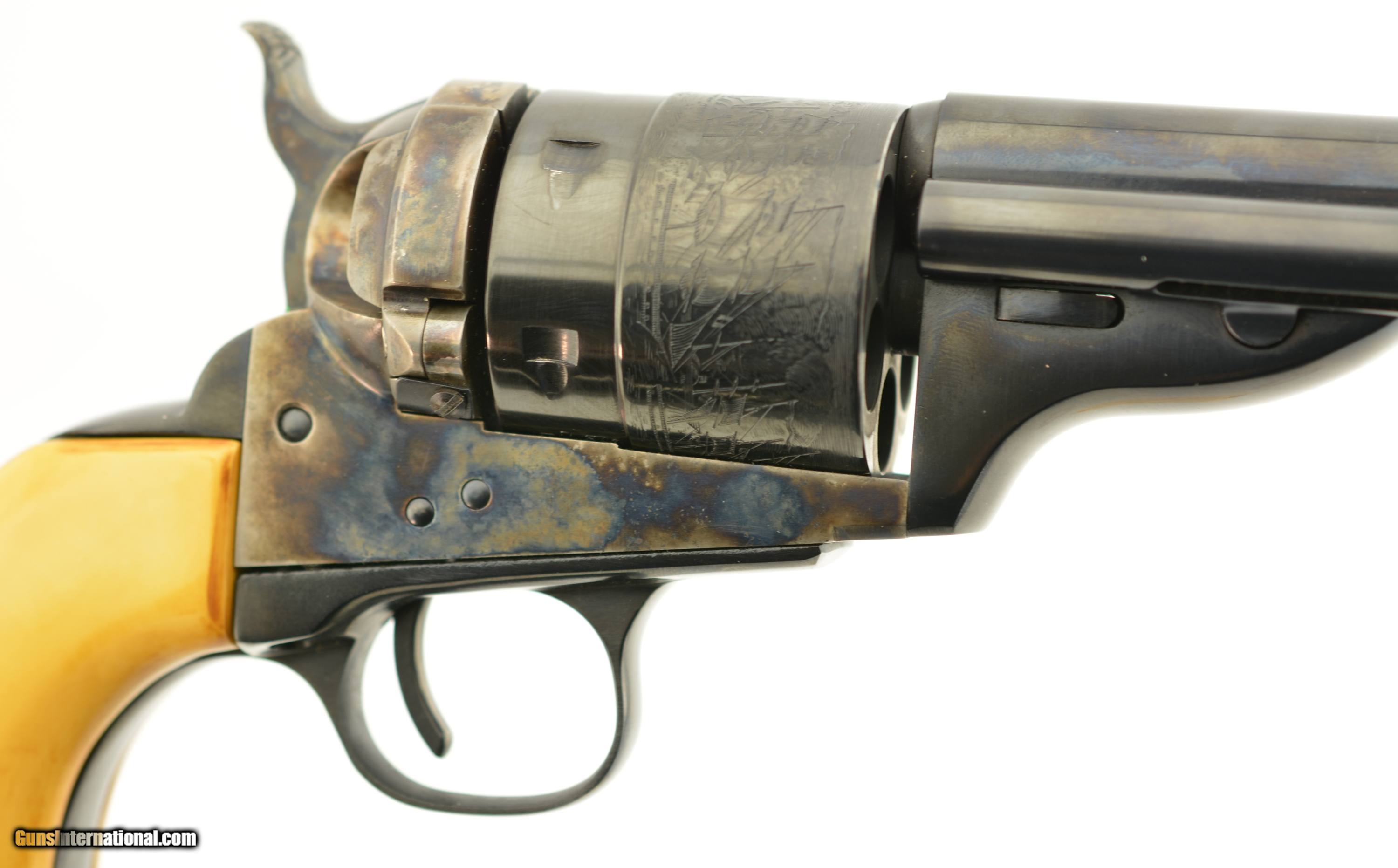 Description: Serial #, .45 Long Colt, 8 inch barrel with a bright, excellent bore. This is the Taylor's & Company 1872 Style Cartridge Conversion of the 1860 Army revolver model #15346, SA revolver manufactured in Italy by Uberti featuring smooth simulated ivory grips, roll marked naval battle scene cylinder and a case colored frame. In excellent, like new condition, the barrel, cylinder and grips frame retain virtually all, 99% plus, original blue finish with the frame and hammer showing beautiful case color. The grips are likewise excellent with very little evidence of handling. It comes in the original box numbered to the gun with paperwork and manual. A beautiful, faithful reproduction in a great caliber perfect for the Cowboy Action shooter. FFL SOLD |