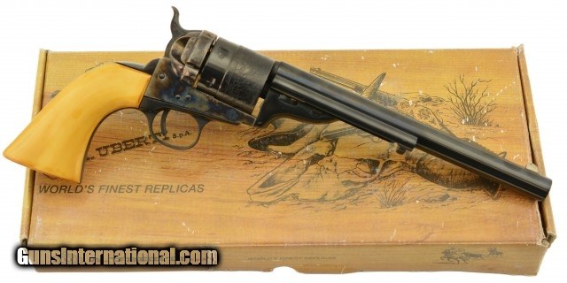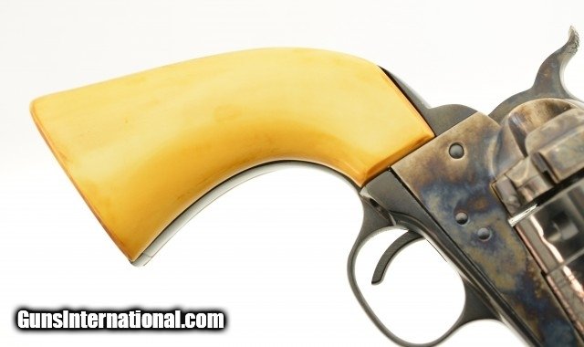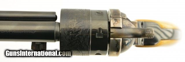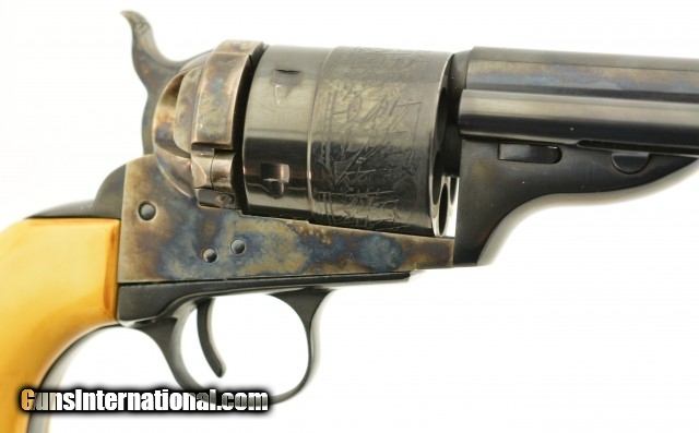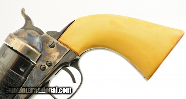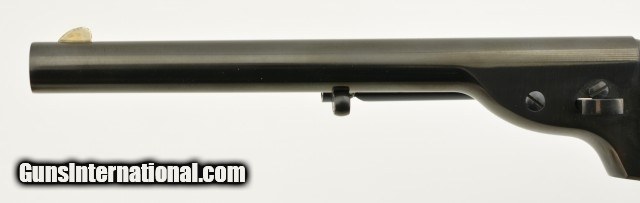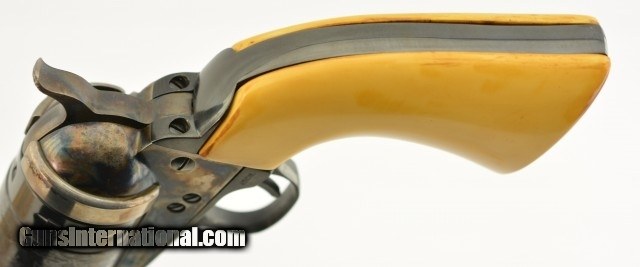 Description: Serial #, .45 Long Colt, 8 inch barrel with a bright, excellent bore. This is the Taylor's & Company 1872 Style Cartridge Conversion of the 1860 Army revolver model #15346, SA revolver manufactured in Italy by Uberti featuring smooth simulated ivory grips, roll marked naval battle scene cylinder and a case colored frame. In excellent, like new condition, the barrel, cylinder and grips frame retain virtually all, 99% plus, original blue finish with the frame and hammer showing beautiful case color. The grips are likewise excellent with very little evidence of handling. It comes in the original box numbered to the gun with paperwork and manual. A beautiful, faithful reproduction in a great caliber perfect for the Cowboy Action shooter. FFL SOLD |