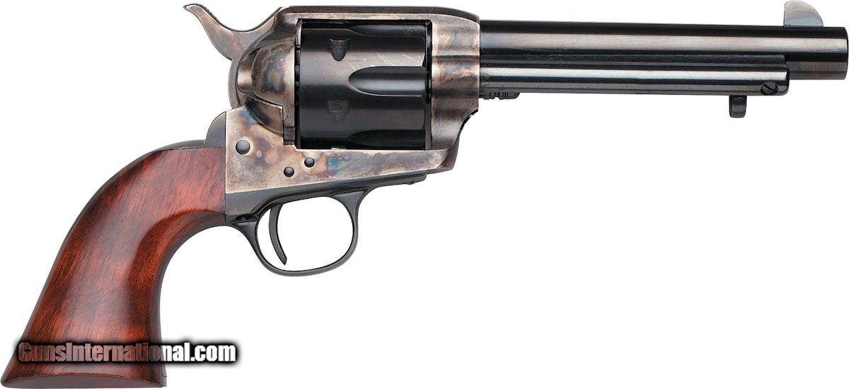 Description: Guns Listing ID: 478174 Taylors and Company has reproduced the Cattleman New Model in 357 magnum. This single action revolver has a forged case hardened frame with blue finish and 512 barrel. Walnut grips and a front blade sight and only weighs 2.30lbs. This \"Peacemaker\" style reproduction holds 6 .357 magnum cartridges.\ SOLD Manufacturer: TAYLOR‚‚S & CO Model: 1873 Caliber Info: .357 MAG Condition: new Barrels: 5.5 BARREL Finish: BLUED |