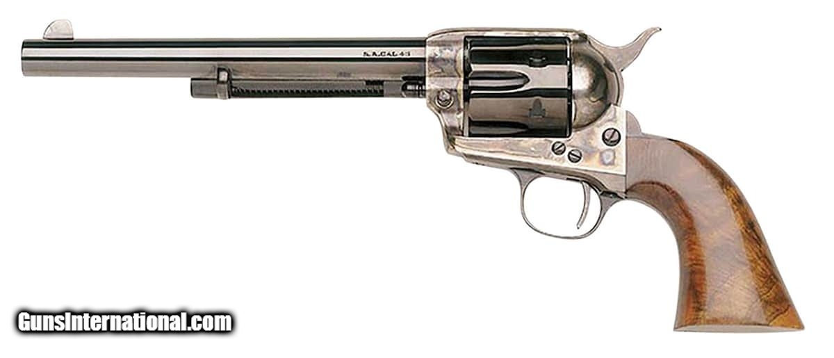 Description: Guns Listing ID: 555070 The Cattleman is a classic western sixshot revolver. Taylors Co. is proud to bring a collection of the finest S.A. Cattleman Model 1873 revolvers being manufactured today. These singleaction models are manufactured using the highest quality standards available. The frames are forged which results in better grain structure and strength perfect to allow the revolver to perform better in an abusive situation like competitive shooting with an extended life. The New Model\" Frame Cattleman features a slightly higher fixedfront sight oblong ejectorplunger grip and a springloaded cylinder retainer pin and a steel trigger and backstrap on a casehardened frame with a blue finished barrel and revolver.\ SOLD Manufacturer: TAYLOR‚‚S & CO Model: 1873 Caliber Info: .45 LC Condition: new Barrels: 7.5 BARREL Finish: BLUED |