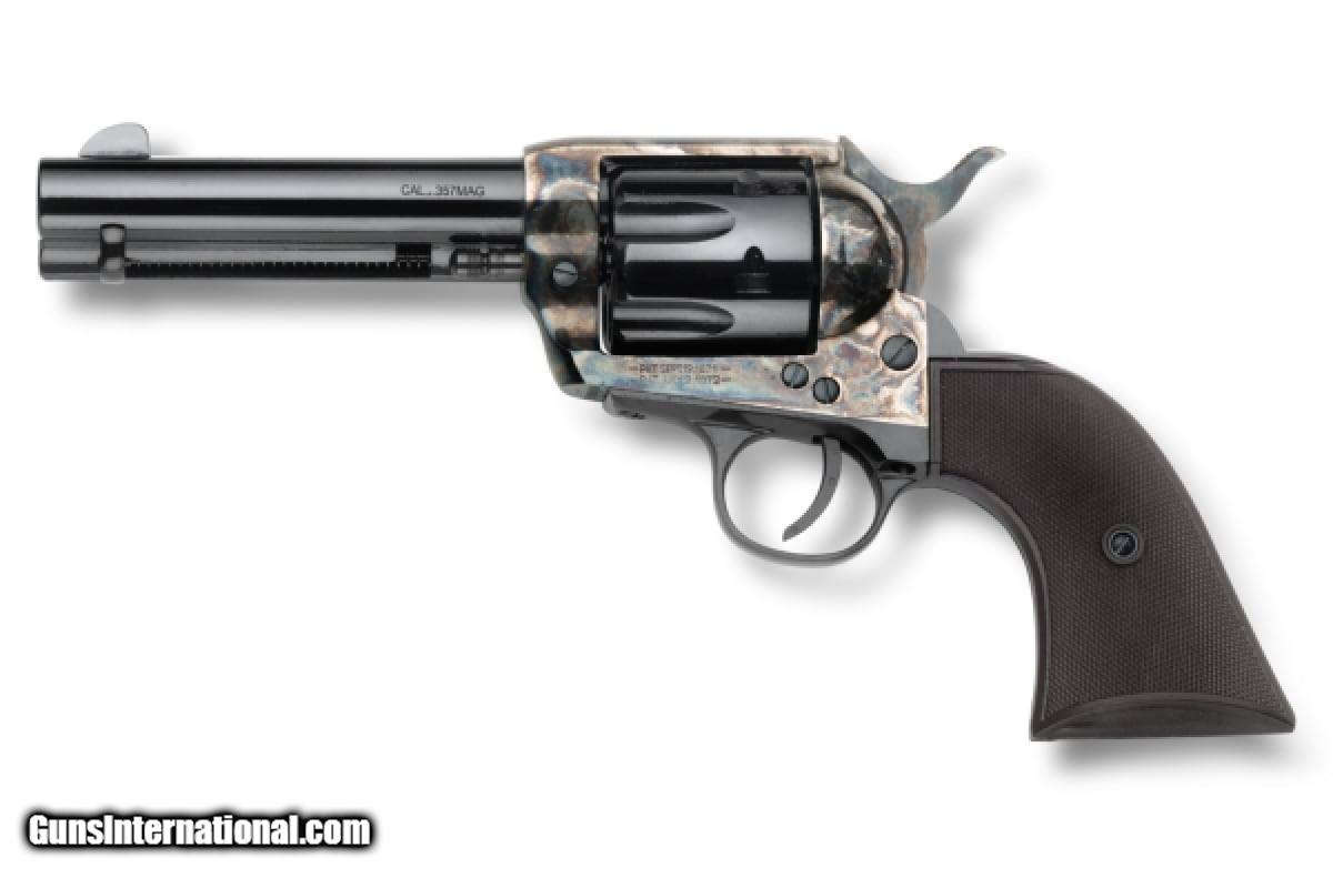 Description: Guns Listing ID: 883737 This 1873 single action brings a classic touch to a modern caliber and features two finish and grip options. The all blued finish model is fit with a larger walnut checkered Army grip allowing for enhanced grip for larger hands. The casehardened frame model is fit with a two piece black plastic checkered Navy size grip, providing a more modern grip option. SOLD Manufacturer: TAYLOR‚‚S & CO Model: CATTLEMAN Caliber Info: 9MM LUGER (9X19 PARA) Condition: new Barrels: 4.75 BARREL Finish: BLUED |