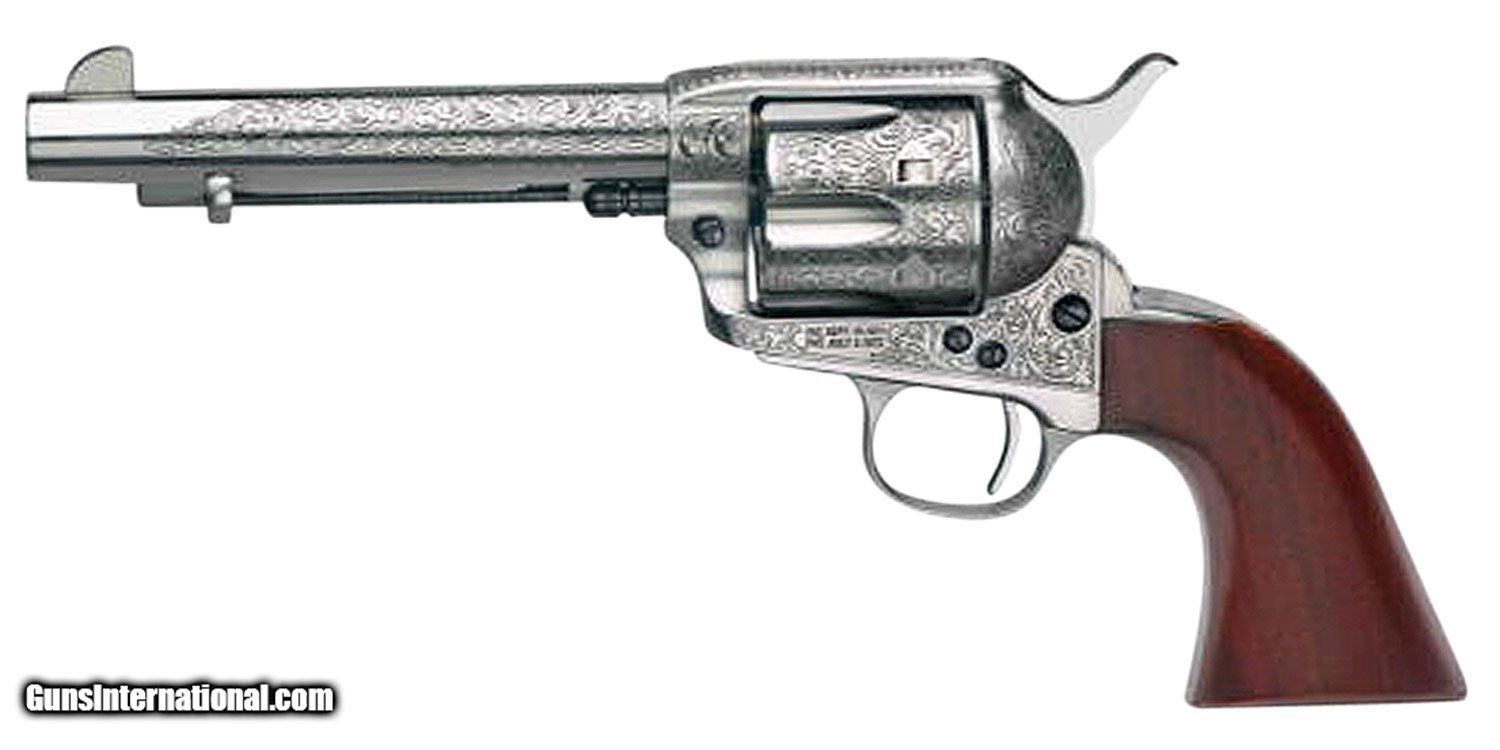 Description: Guns Listing ID: 93923 Taylor‚‚s & Co. Model 1873 Cattleman single-action is a classic western six-shot revolver. It is manufactured using the highest quality standards available. The frame is forged which results in better grain structure and strength, making it ideal for competitive shooting. The Floral Engraved Cattleman features a new model forged frame and \"white-heat treated\" finish. The frame, cylinder, and barrel are laser-engraved in an all floral pattern and hand chased to give depth to the engraving. This 45LC model has a 5.5\" barrel, walnut grip, and fixed blade front with rear notch sights SOLD Manufacturer: TAYLOR‚‚S & CO Model: 1873 CATTLEMAN Caliber Info: .45 LC Condition: new Action: REVOLVER |