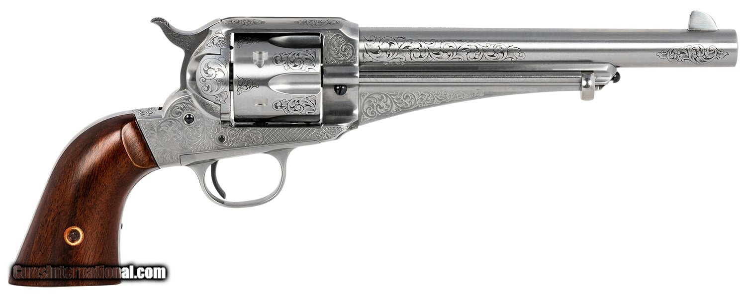 Description: Guns Listing ID: prod145198 The 1875 Army Outlaw Revolver is a faithful reproduction of the 1875 Remington single actions which kept the solid frame and overall styling of Remingtons 1858 percussion models. Ordinary cit SOLD Manufacturer: TAYLOR‚‚S & CO Model: 1875 Caliber Info: .45 LC Condition: new Barrels: 7.5 BARREL Finish: NICKEL |