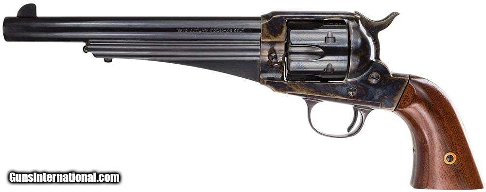 Description: Guns Listing ID: 1016 The Taylors Company 1875 Army Outlaw is a family of revolvers faithfully reproducing the 1875 Remington. These single-action six-shot revolvers are chambered in a variety of calibers. Barrels are available at 5.5 or 7.5 in length and are adorned with a fixed blade front sight and an in-frame notch rear sight. The 1875 Army Outlaw is so named as it reproduces the gun that outlaw Frank James carried. A two-piece walnut grip ensures a steady shot every time. Details The 1875 Army Outlaw Revolver is a faithful reproduction of the 1875 Remington single-actions which kept the solid frame and overall styling of Remingtons 1858 percussion models. Ordinary citizens and Old West lawmen alike recognized the sturdy quality of the new Remington revolvers. The infamous Frank James even carried one for most of his outlaw career. The reproduction is available in his favorite caliber .45 Colt and features a steel backstrap and two-piece walnut grip. This model is manufactured using a casted frame. The 1875 Army Outlaw Revolver retained much of the overall styling of Remingtons 1858 percussion revolver including the bottom blade. - Barrel Length 7.5 Inch - Caliber .45 LC - Capacity 6 - Weight 2.64 lbs - Finish Blue Finish with Case Hardened Frame - GripStock 2-piece Walnut - Sights Blade Front - Overall Length 12.8 Inches SOLD Manufacturer: TAYLOR‚‚S & CO Model: 1875 ARMY OUTLAW STANDARD Caliber Info: 45 LC Condition: new Barrels: 7.5 BARREL |