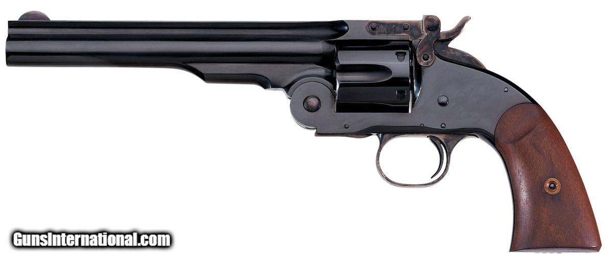 Description: Guns Listing ID: 570375 Taylors hand gun line are replicas copying the original designs but built with todays high quality standards in mind. The Schofield model was designed to be operated with one hand while on horseback making it ideal for soldiers in the U.S. Cavalry. The breakopen pistols barrel latch opens by pulling it back and has a rear sight notch incorporated into it. This 45LC model has a 7 barrel blued metal finish walnut grip and a fixed blade front sight.\ SOLD Manufacturer: TAYLOR‚‚S & CO Model: SECOND MODEL Caliber Info: .45 LC Condition: new Barrels: 7 BARREL Finish: BLUED |