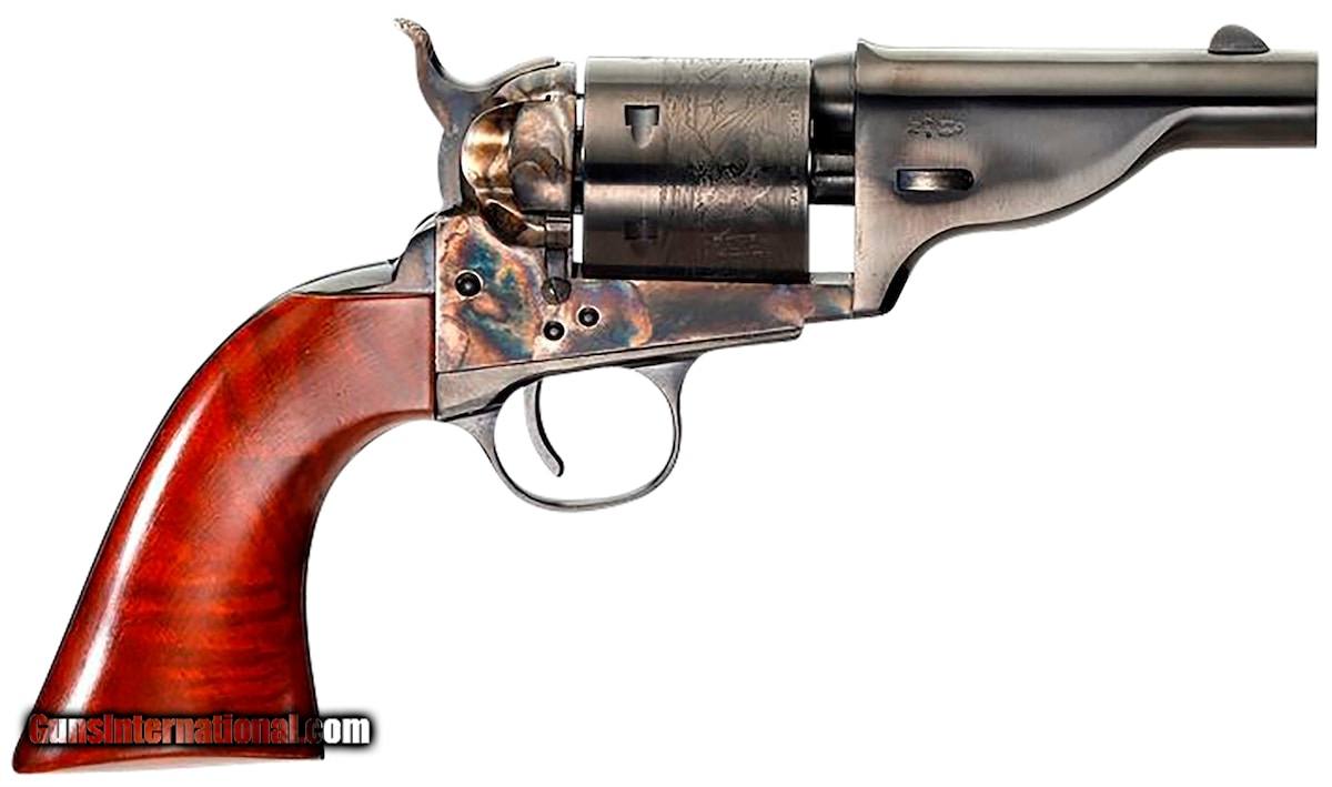 Description: Guns Listing ID: 576616 Although it appears to be a conversion, the 1871-72 Open Top model was Colts first revolver specifically manufactured to fire a centerfire cartridge by incorporating the loading gate in the frame. Since Colt did not use percussion revolver parts, the revolver was manufactured as an entirely new model, first with Navy-sized grips, later with Army-sized grips. The Hickok model is a modern twist on the classic Open Top that features a snub nose barrel. This model features a case-hardened forged steel frame, round barrel with front blade sight, no ejector rod, blued steel grip parts, an Army-sized walnut grip, and a rear sight notch on the rear of the barrel. SOLD Manufacturer: TAYLOR‚‚S & CO Model: The Hickok Open-Top Caliber Info: .38 SPL Condition: new Barrels: 3.5" barrel Finish: BLUE STEEL |