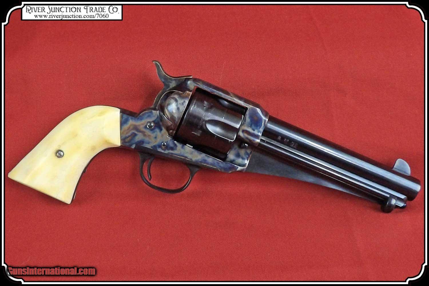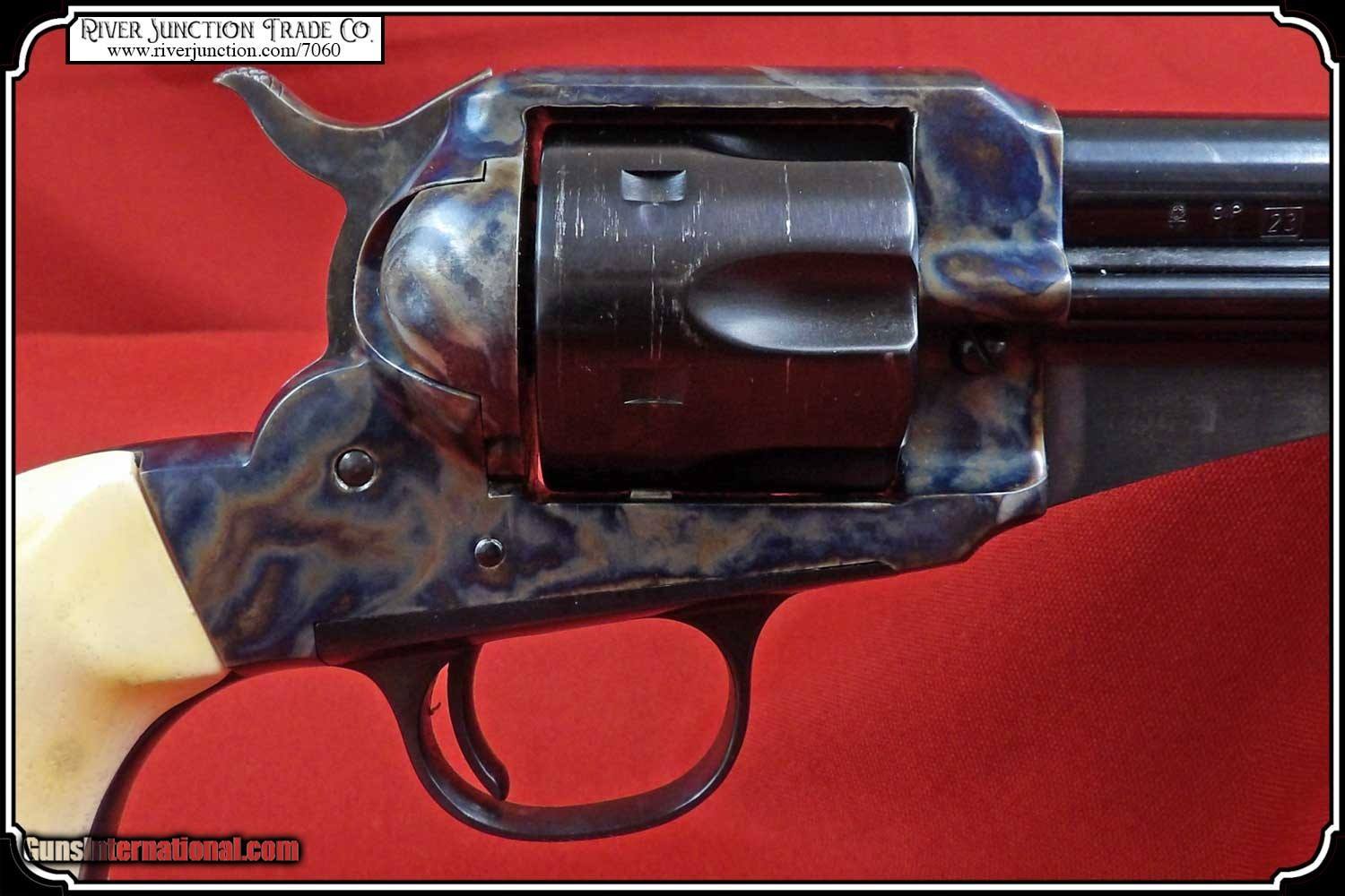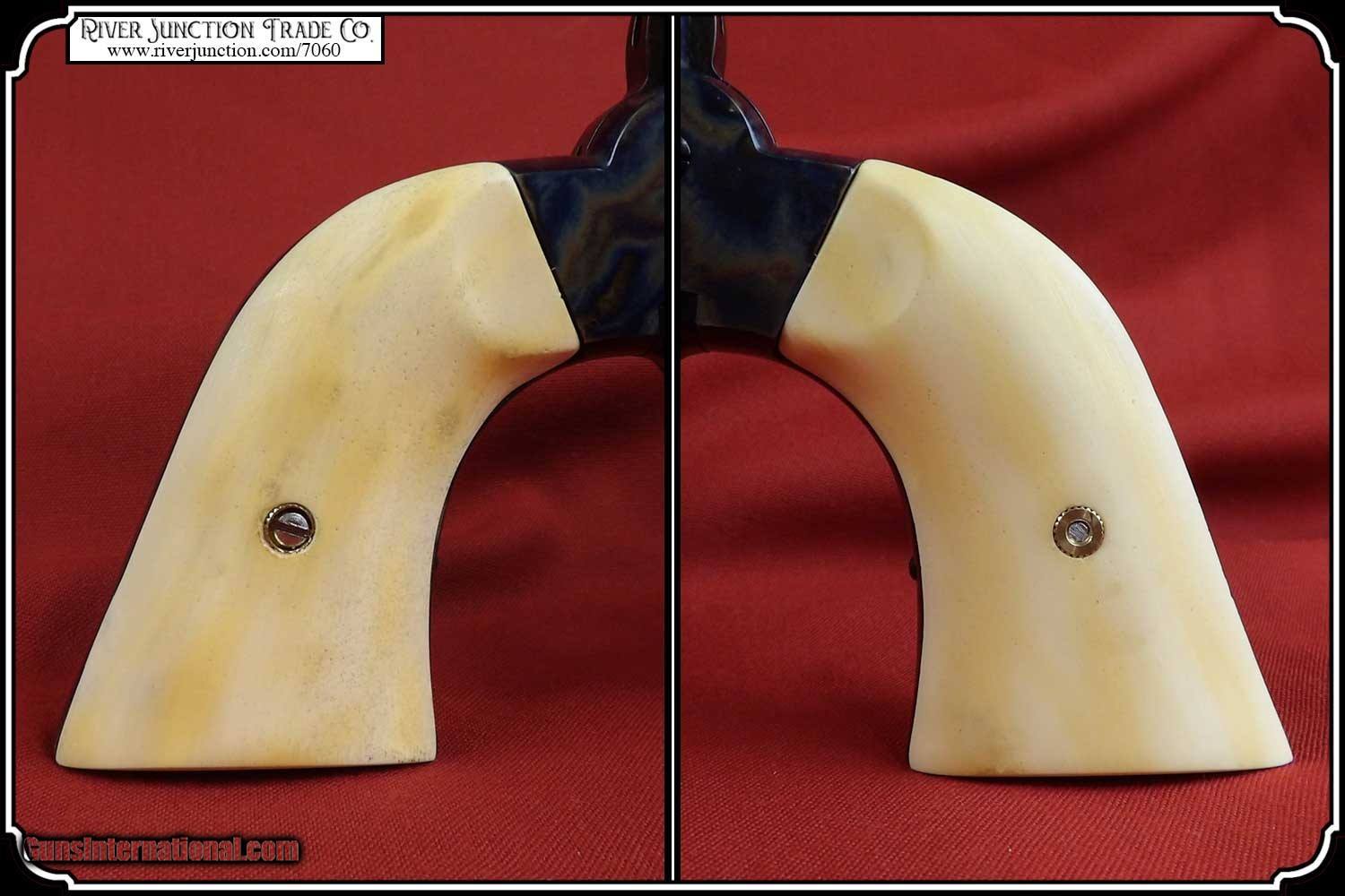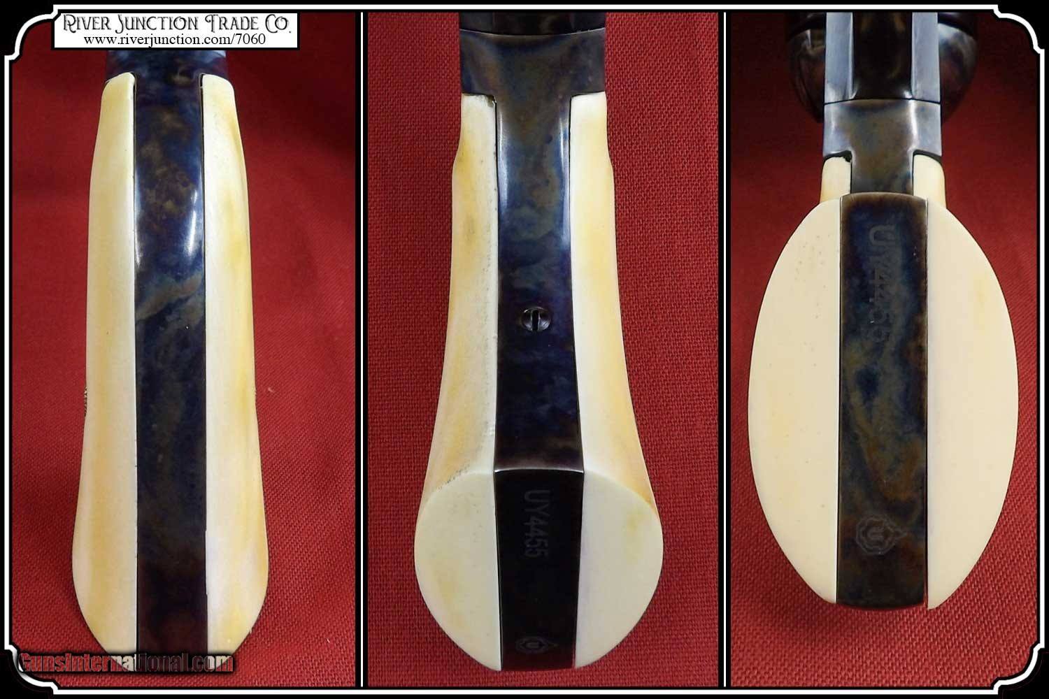 Description: This excellent copy of the 1875 Remington, imported by Taylors Firearms was manufactured by Uberti. chambered for .44-40. This one is in excellent mechanical condition, and is in mint as to finish, bore and grips. To improve the authenticity the brass trigger guard was removed and replaced with a steel and blued trigger guard as were found on the original 1875 and later Remington. To further enhance the authenticity of this beautiful firearm a set of aged ivory colored polymer grips have been custom made for the arm. Includes box, papers, and soft case. SOLD |