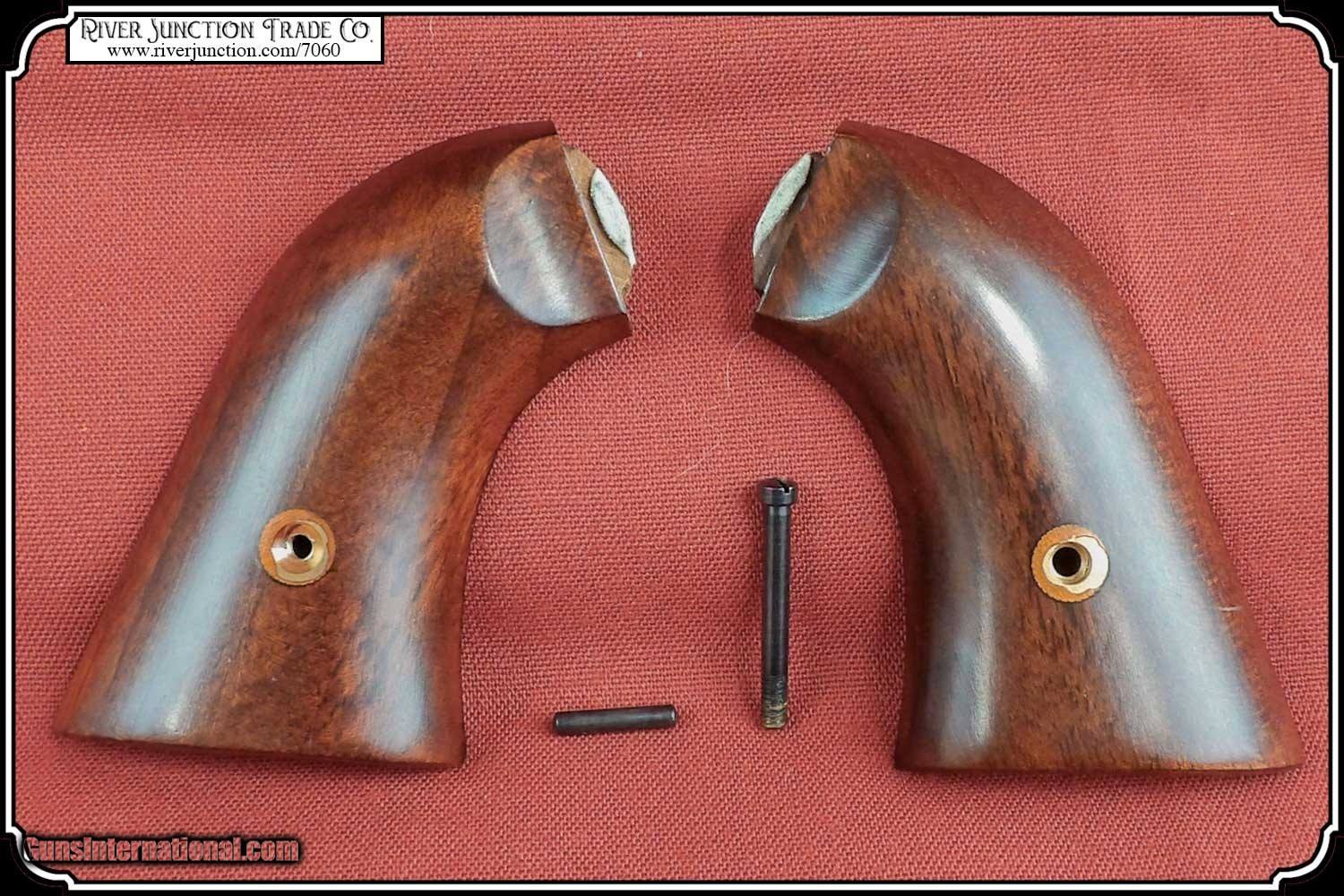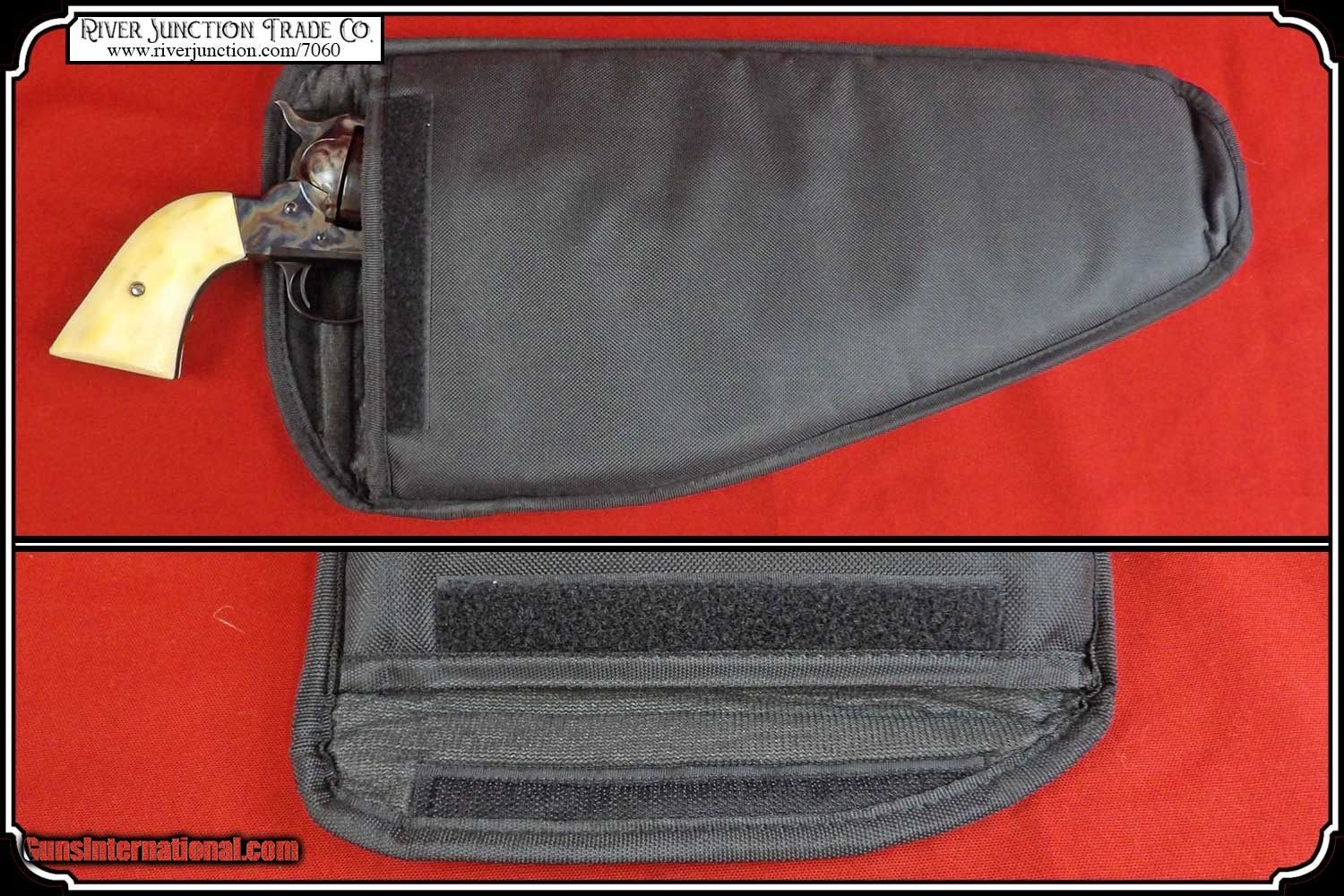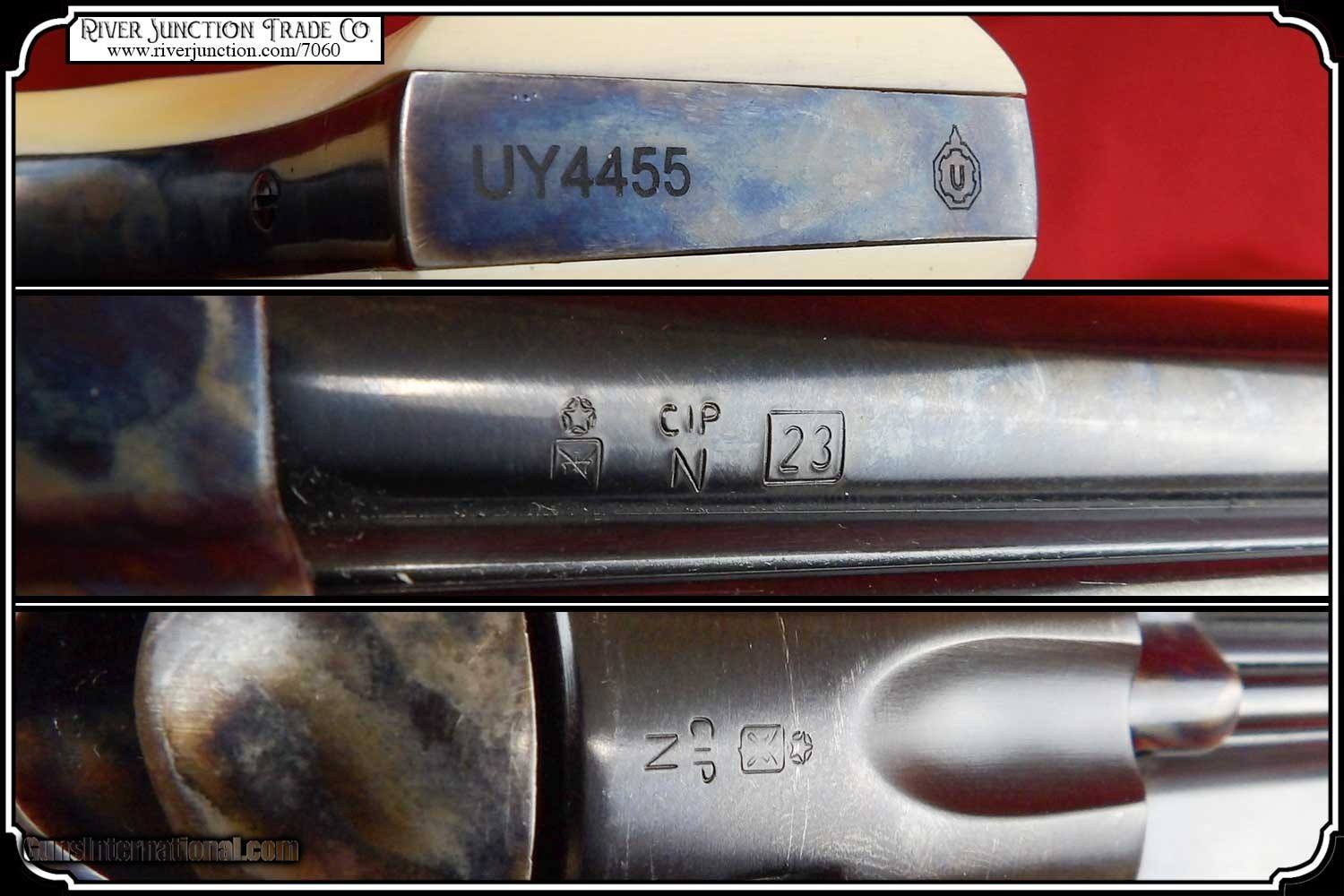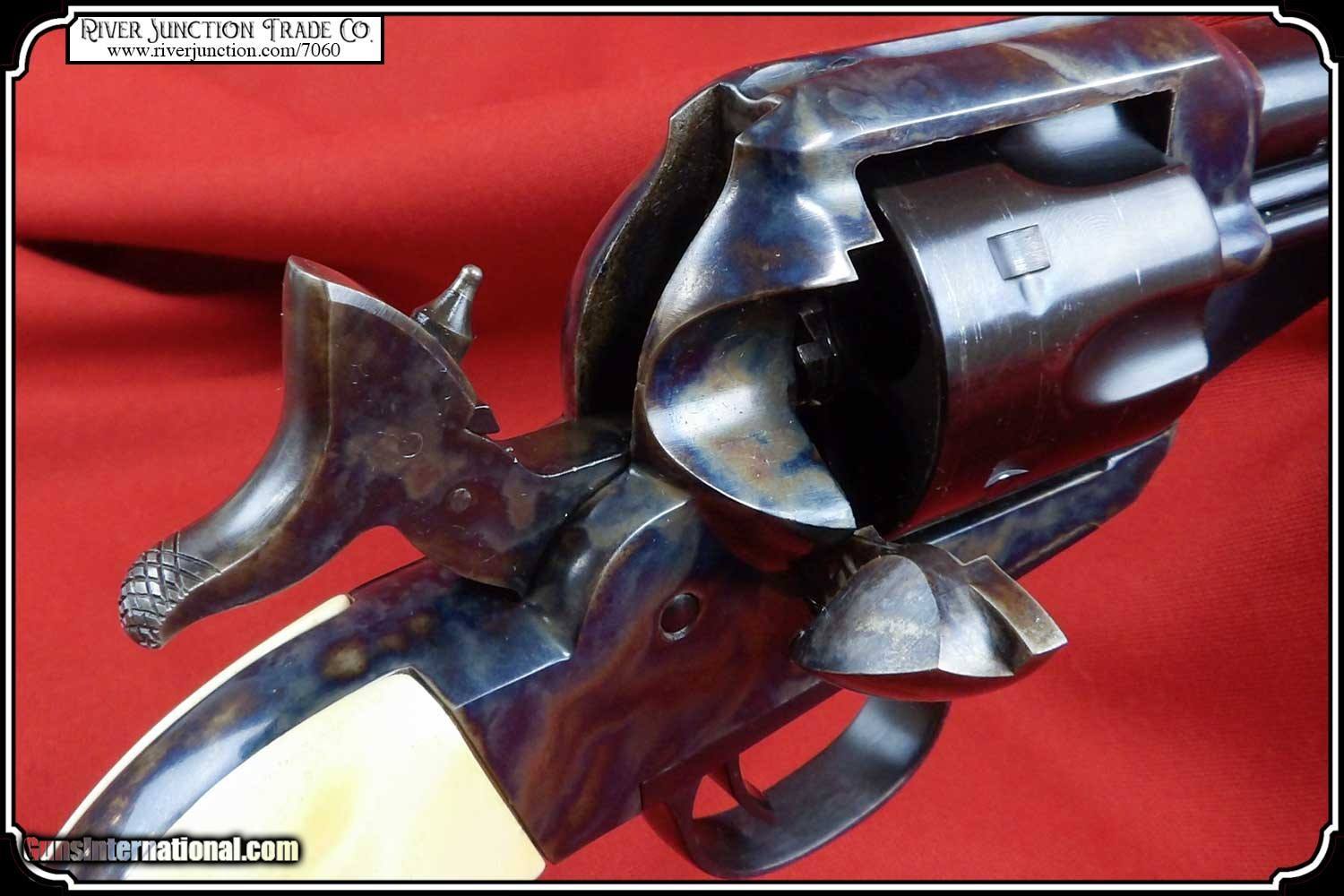 Description: This excellent copy of the 1875 Remington, imported by Taylors Firearms was manufactured by Uberti. chambered for .44-40. This one is in excellent mechanical condition, and is in mint as to finish, bore and grips. To improve the authenticity the brass trigger guard was removed and replaced with a steel and blued trigger guard as were found on the original 1875 and later Remington. To further enhance the authenticity of this beautiful firearm a set of aged ivory colored polymer grips have been custom made for the arm. Includes box, papers, and soft case. SOLD |