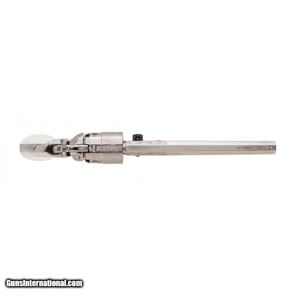 SN: 708921. Modern production. BLACK POWDER ONLY 44 Cal in a 7.375"" Octagonal barrel. Bore is excellent. Nickel plated, factory engraved replica 1851 Navy with simulated ivory grips. Overall condition is excellent. Comes with box