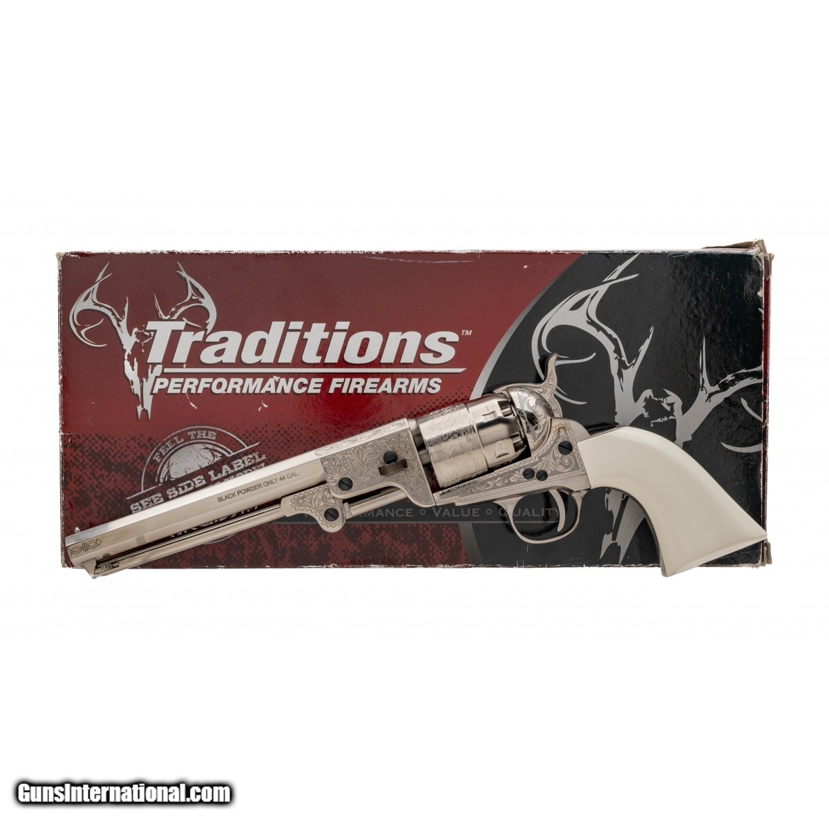 Description: " SN: 708921. Modern production. BLACK POWDER ONLY 44 Cal in a 7.375"" Octagonal barrel. Bore is excellent. Nickel plated, factory engraved replica 1851 Navy with simulated ivory grips. Overall condition is excellent. Comes with box SOLD |