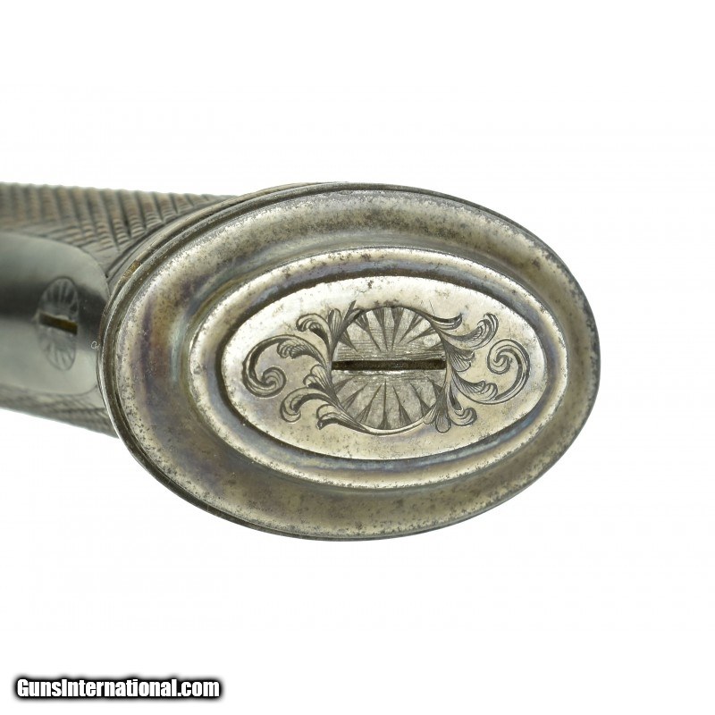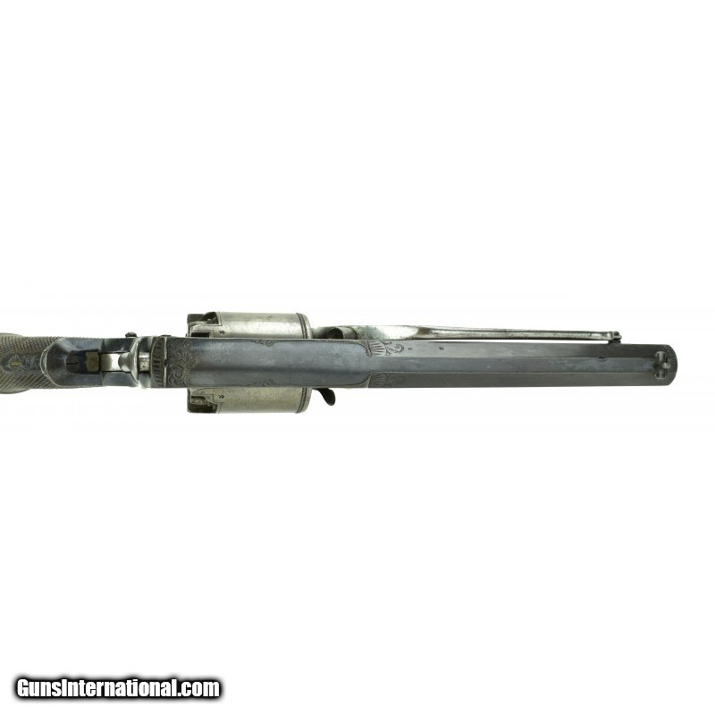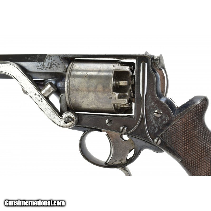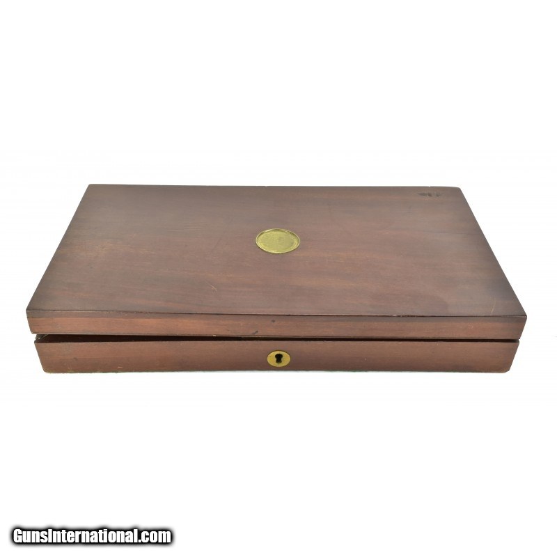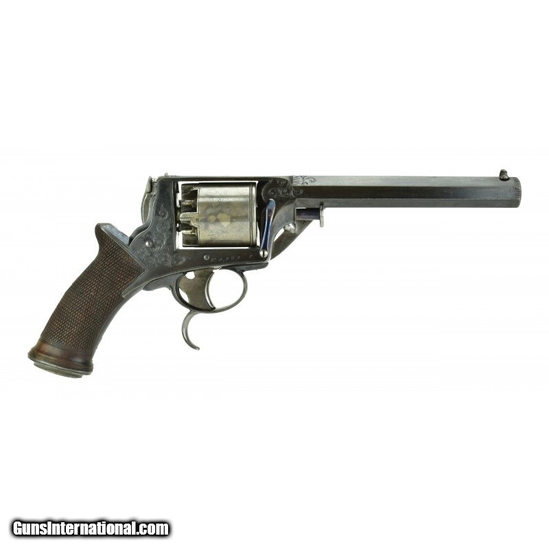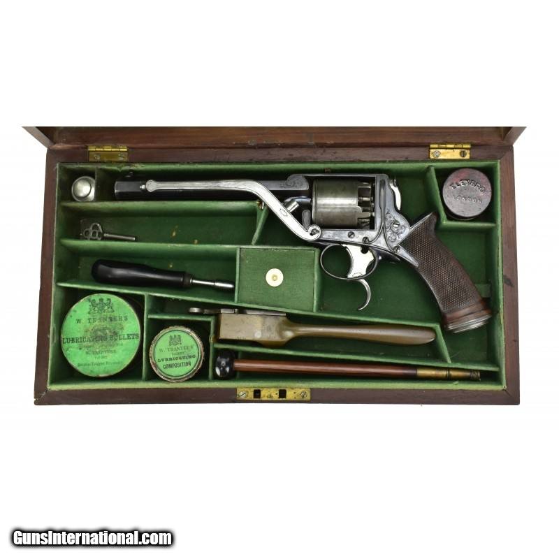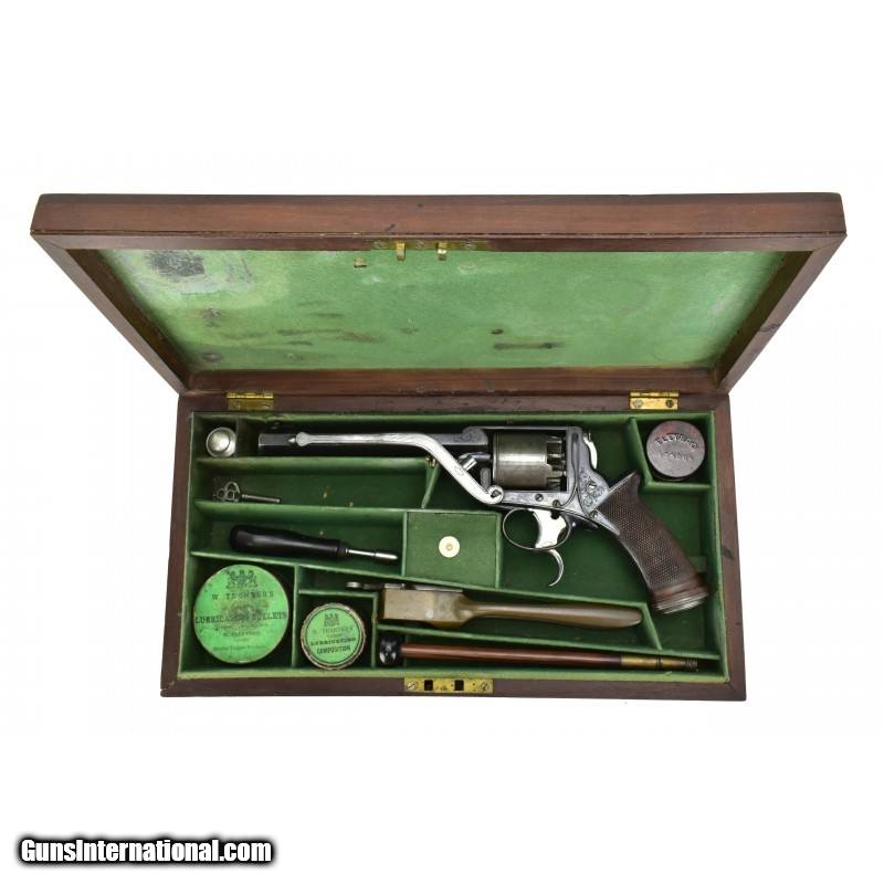 Description: "Tranter Two Trigger .44 Caliber Revolver. (Mold marked Adams Registered 54). Cased with all accessories. Mold, cleaning rod, key, and two cans of Eley caps, load balls, large can of bullet lubricant, Tranter lubrication composition (small tin), and oil dispenser. Revolver has 98% blue. Cylinder and butt cap have 50% case colors. Action works perfectly. Grips are perfect. Very fine set. SOLD Antique: Yes |