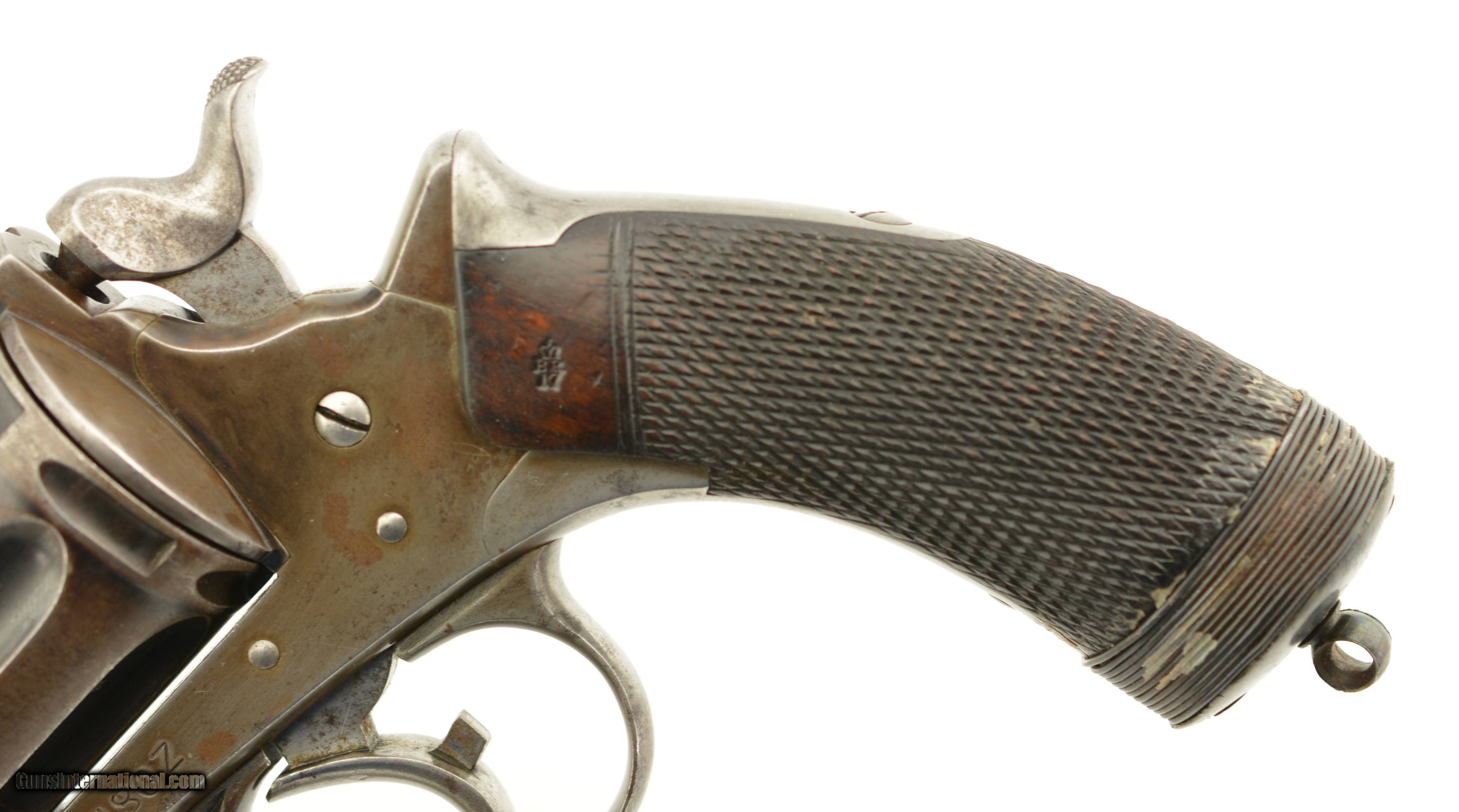 Description: Serial #1818, .450 CF, 6" octagon barrel with a fine, bright bore that has some dark spots of mild freckling within the grooves. This is a good looking revolver that has all-matching numbers, and retains traces of the original bright blue finish, most noticeably within the cylinder flutes, and the balance turned to a mellow gray-brown patina. The hammer, trigger, and ejector rod retain traces of their original armory bright finish, with spots of dark freckling on the balance. The frame has the usual Tranter “football" marking on the right side, and has a New Zealand property and date mark deeply stamped onto the left side of the frame: “N80Z" (denoting acceptance in 1880). The checkered walnut grips has numerous small handling marks and blemishes, with an unusual wire wrap repair at the butt, coated in a dried resin along the top. The action lock-up is still tight, and the mechanism functions flawlessly. This is the very gun pictured on pg. 208 and 209 of “Tranter Cartridge Firearms" by Black, Guerin & Michaud; (2007), and would make a fantastic addition to any collection of rare British and New Zealand military handguns. Antique SOLD Antique: Yes Manufacturer: Tranter Model: 1878 Serial Number: 1818 Caliber Info: .450 Gauge Info: .450 |