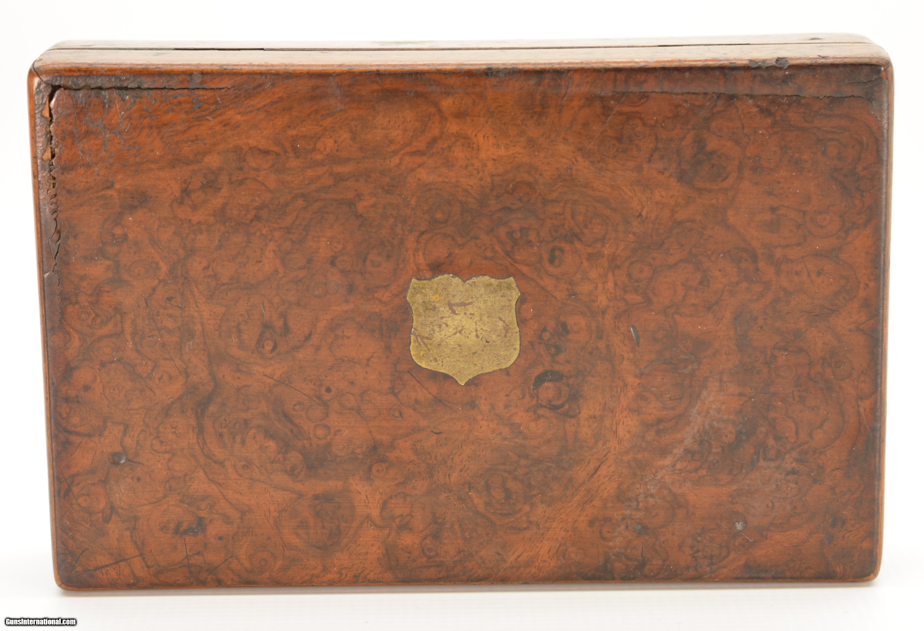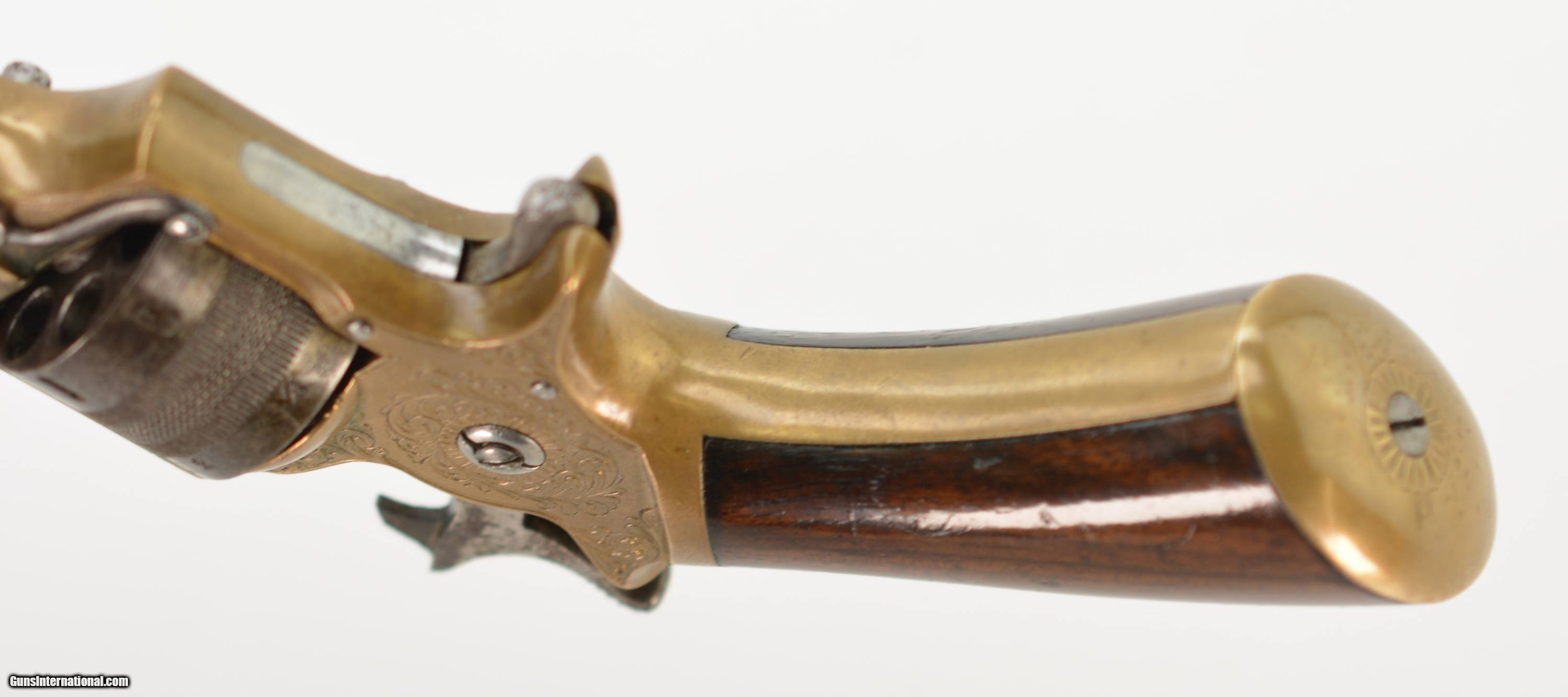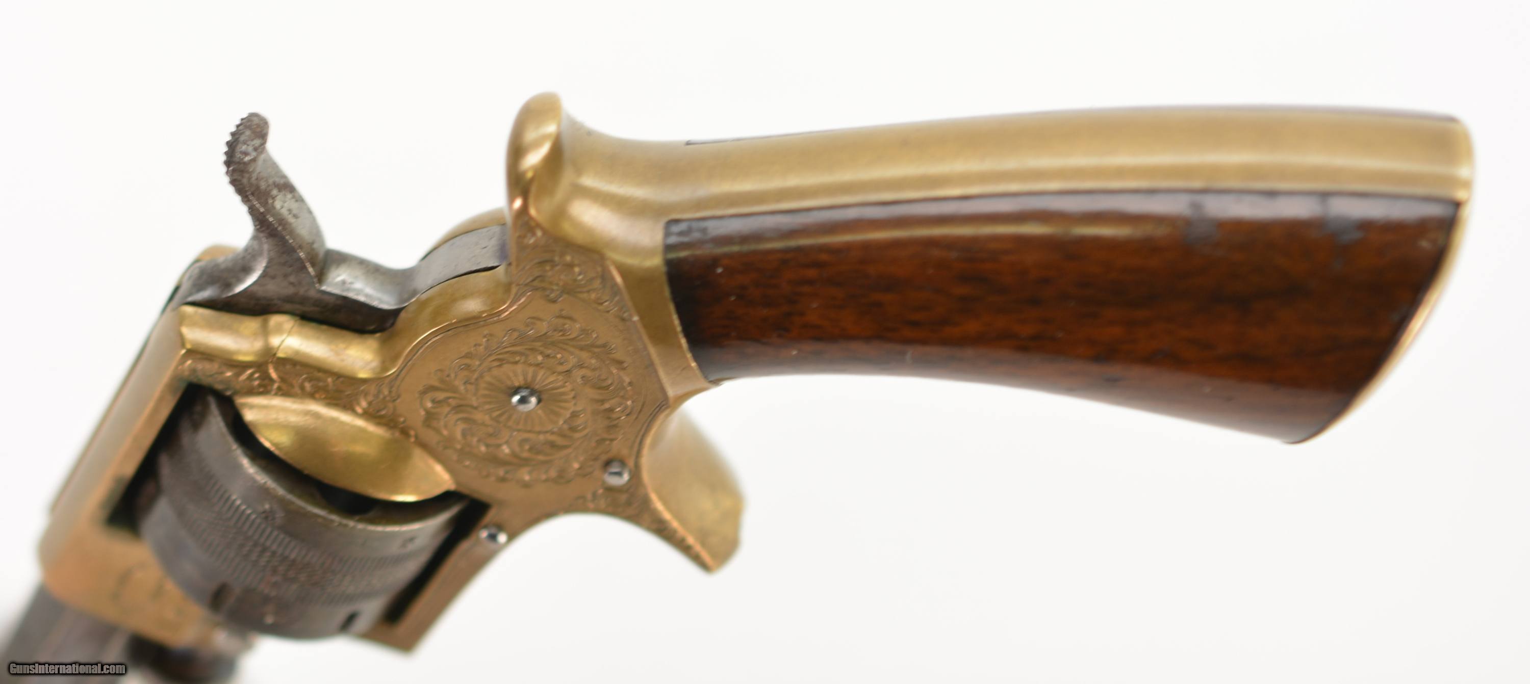 Description: Serial #1457, .230 RF, 2 1/2" octagon barrel with a very good, lightly freckled bore. This is a very nice, seven-shot revolver with all-matching assembly numbers (“74"). The revolver is not retailer marked, but does have the Tranter “football" marking on the left side at the breech. The barrel has about 70-75% of the original blue remaining with gray fading on the balance, and some minor impact marks as well. The cylinder retains traces of the original blue finish on protected areas, but otherwise has an overall smooth, plum-brown patina with silvering along the high edges, and the engraved brass frame has a fairly bright, yellow-ochre patina. The smooth walnut grips are in very good-fine shape with scattered small handling marks and some mild flattening of the points. The lock-up is tight, and the action is fully functional. The revolver is housed in a period, burled walnut English case with dark blue baize lining, original key and turn-screw, and an unmarked, shield-shaped brass escutcheon on the lid. The lid has some damage at the hinge-side corners. This very revolver and case are described and illustrated on pgs. 18 and 19 of “Tranter Cartridge Firearms" by Black, Guerin & Michaud; 2007. This is a handsome, cased, smallbore Tranter that would make a fabulous addition to any collection of Tranter handguns. Antique SOLD Antique: Yes Manufacturer: Tranter Model: No. 1 Serial Number: 1457 Caliber Info: .230 Gauge Info: .230 |