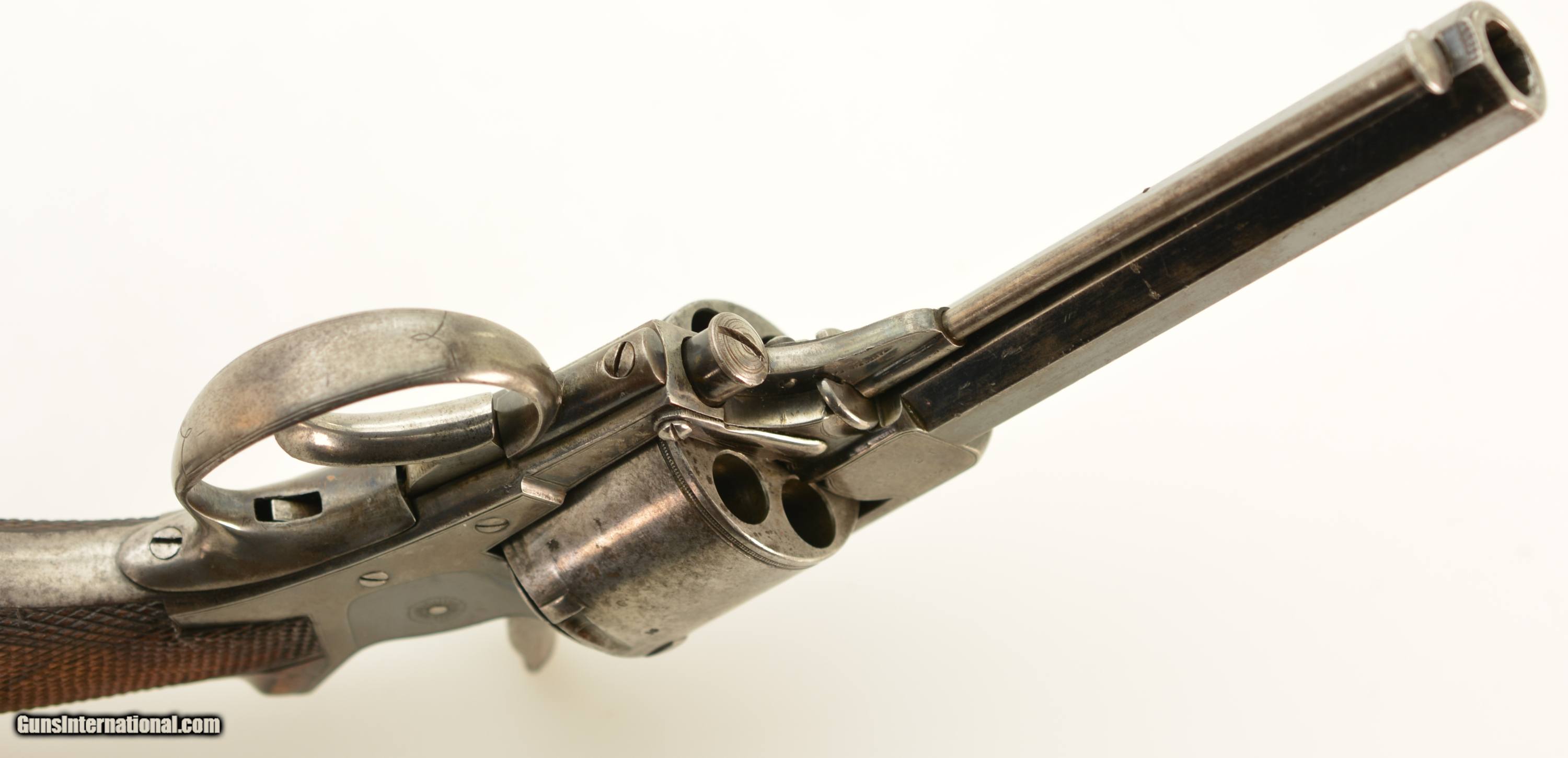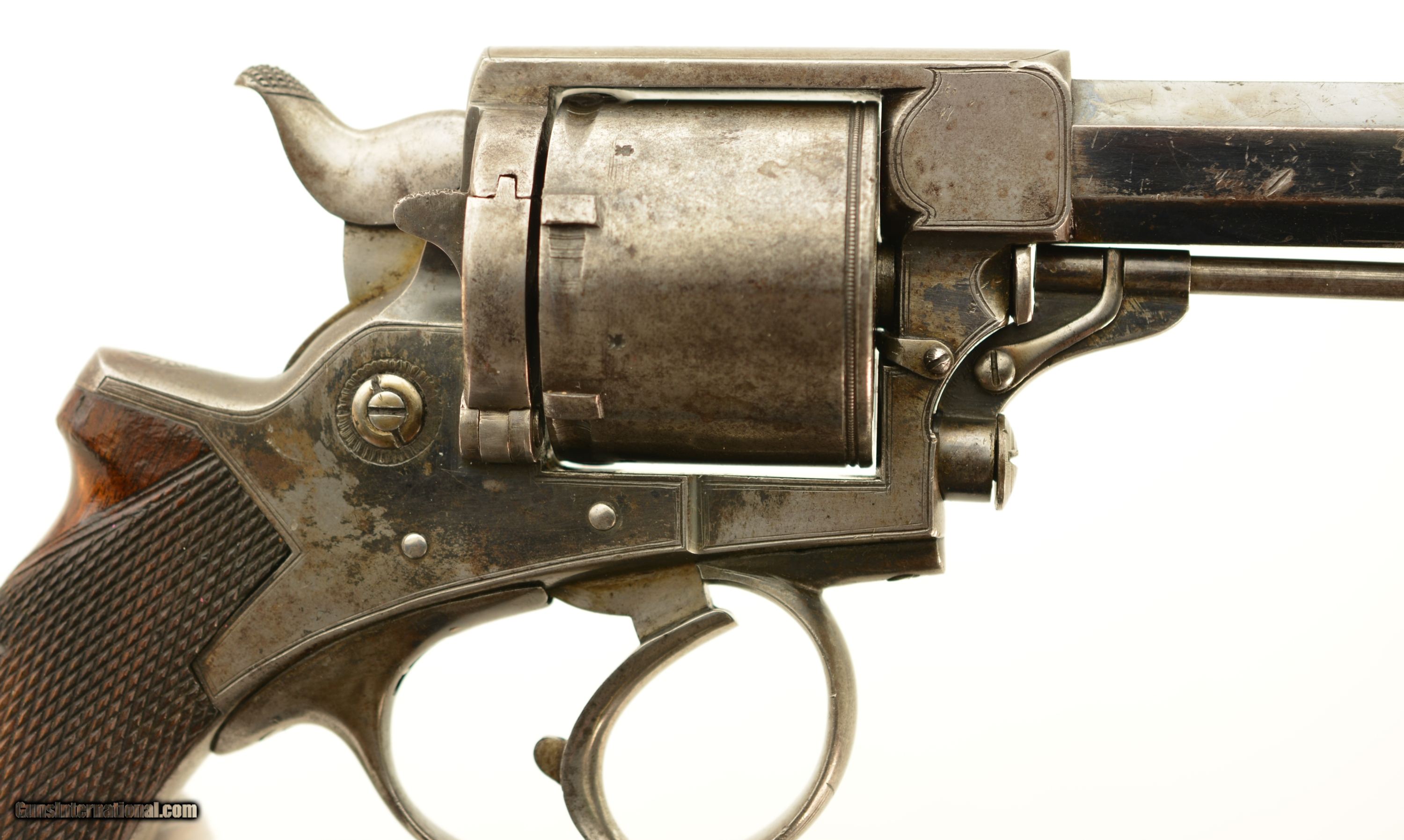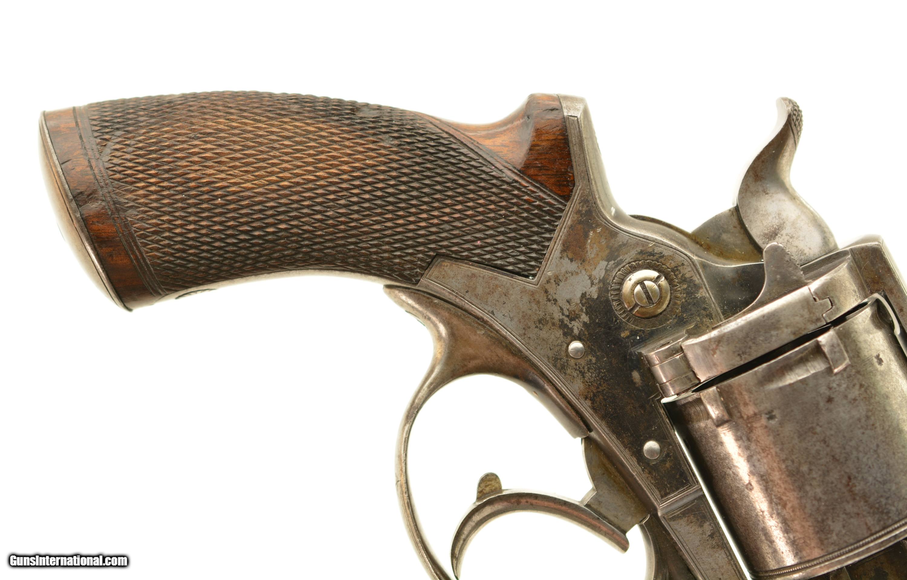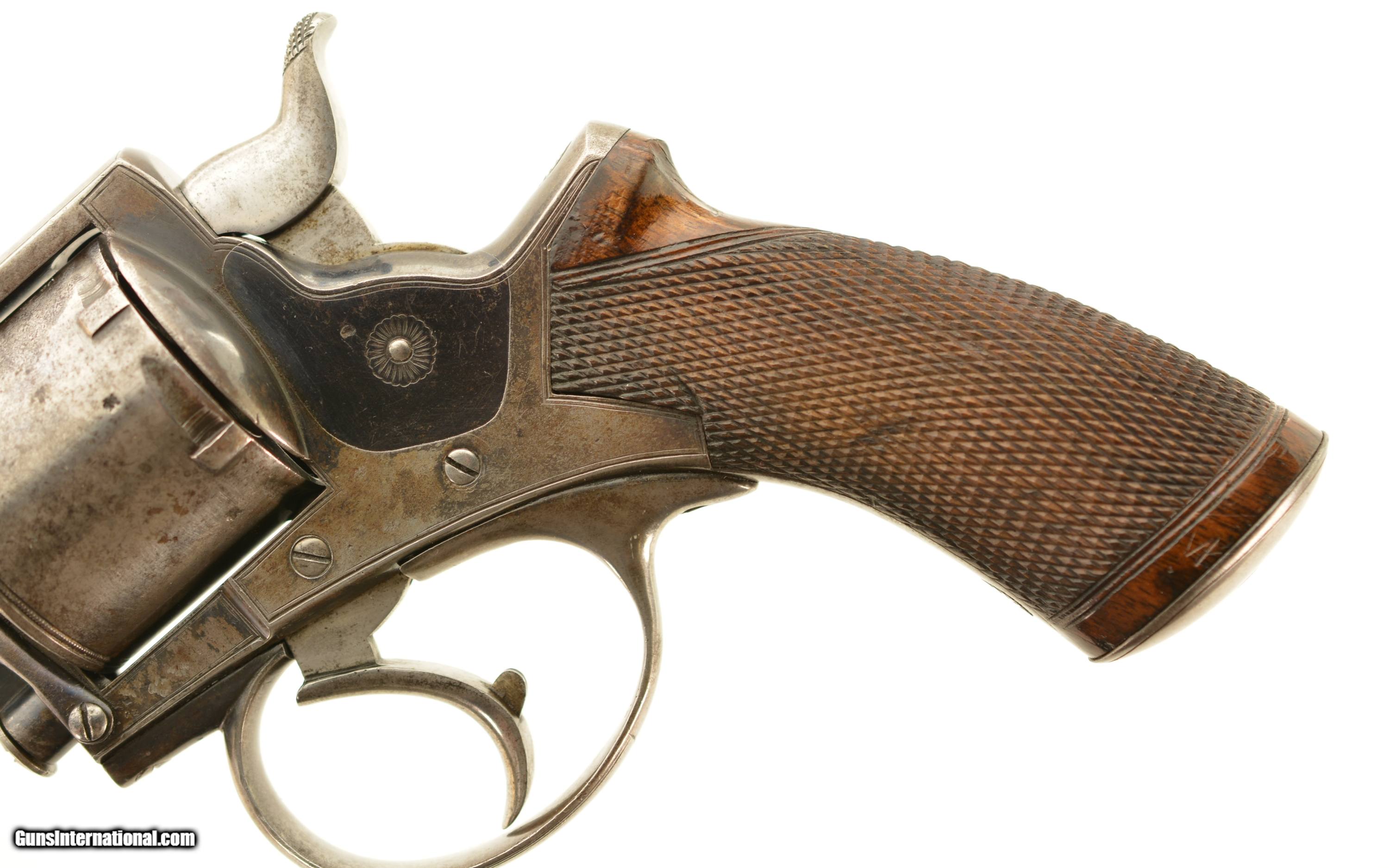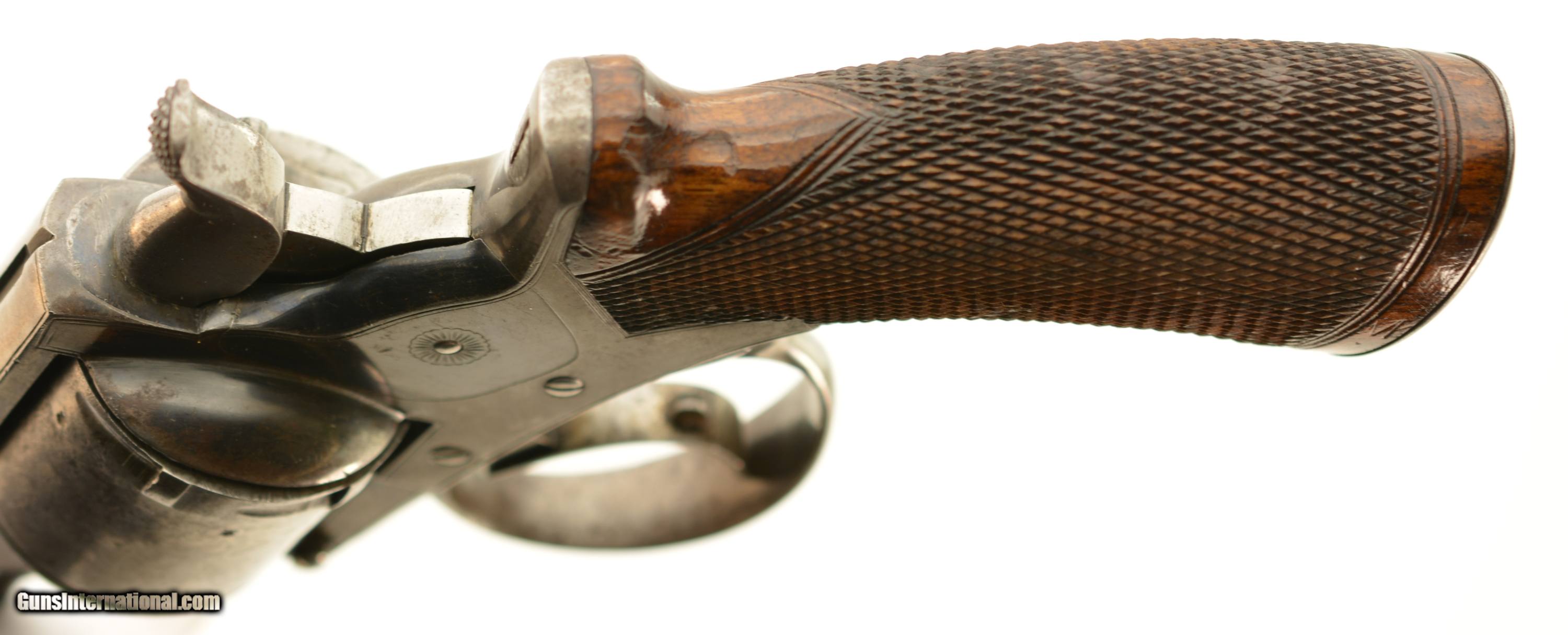 Description: Serial #13001, .450 CF, 5" octagon barrel with an excellent, bright bore. This is a very handsome, early ejector rod revolver that retains 40-50% of the original bright blue finish, mostly along the barrel, protected areas of the frame, and on the sideplate. The balance of the metal has a mottled gray patina. The cylinder has some further areas of mild pinprick pitting on a few spots as well. There is a clear Tranter "football" marking on the right side, and the gun is retailer marked on the top of the barrel: "S. GRANT 67A ST. JAMES ST., LONDON". The checkered walnut grip has some small handling marks and blemishes scattered about, but the checkering points are still relatively sharp. The action lock-up is still tight, and the mechanism is fully functional. This is a very good-fine example of an early Tranter Model 1868 .450, sold by one of the legendary British marques, and would make a fantastic addition to any collection. Antique SOLD Antique: Yes Manufacturer: Tranter Model: 1868 Serial Number: 13001 Caliber Info: .450 Gauge Info: .450 |