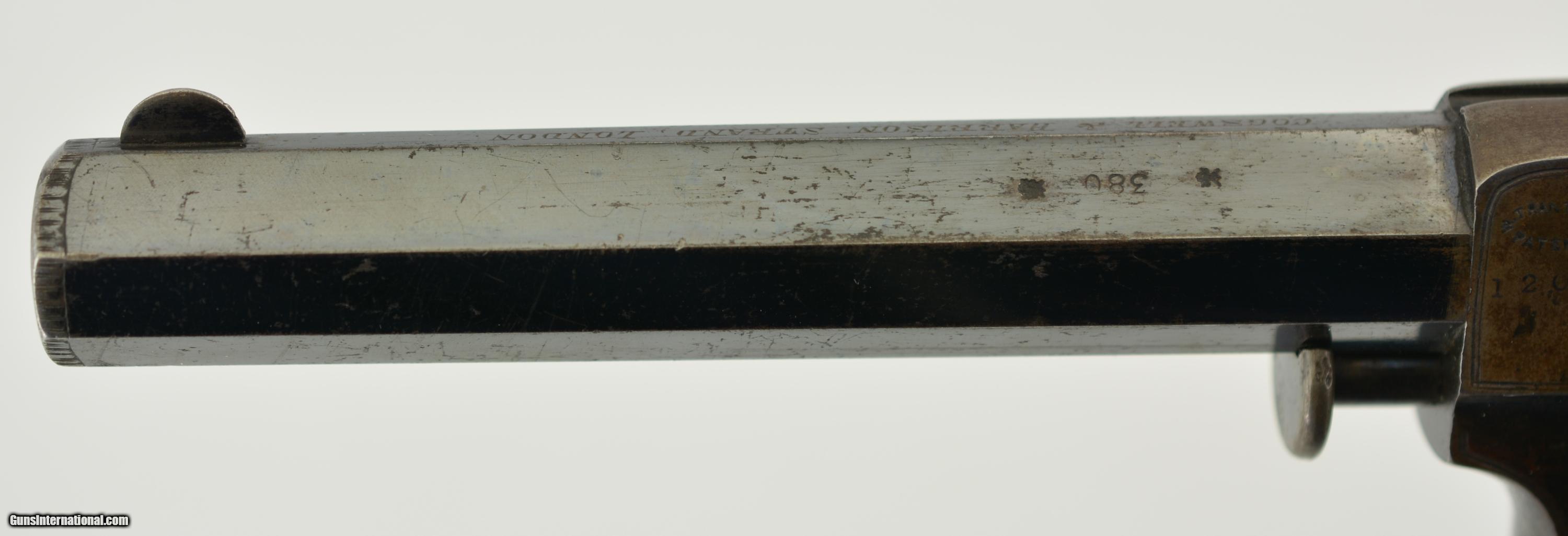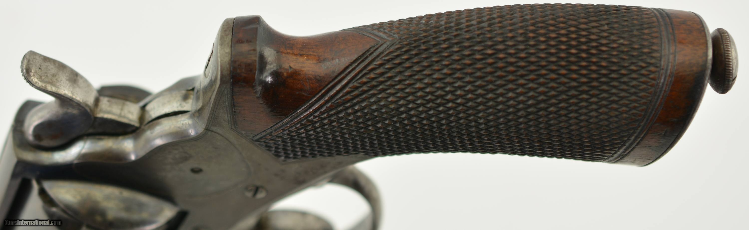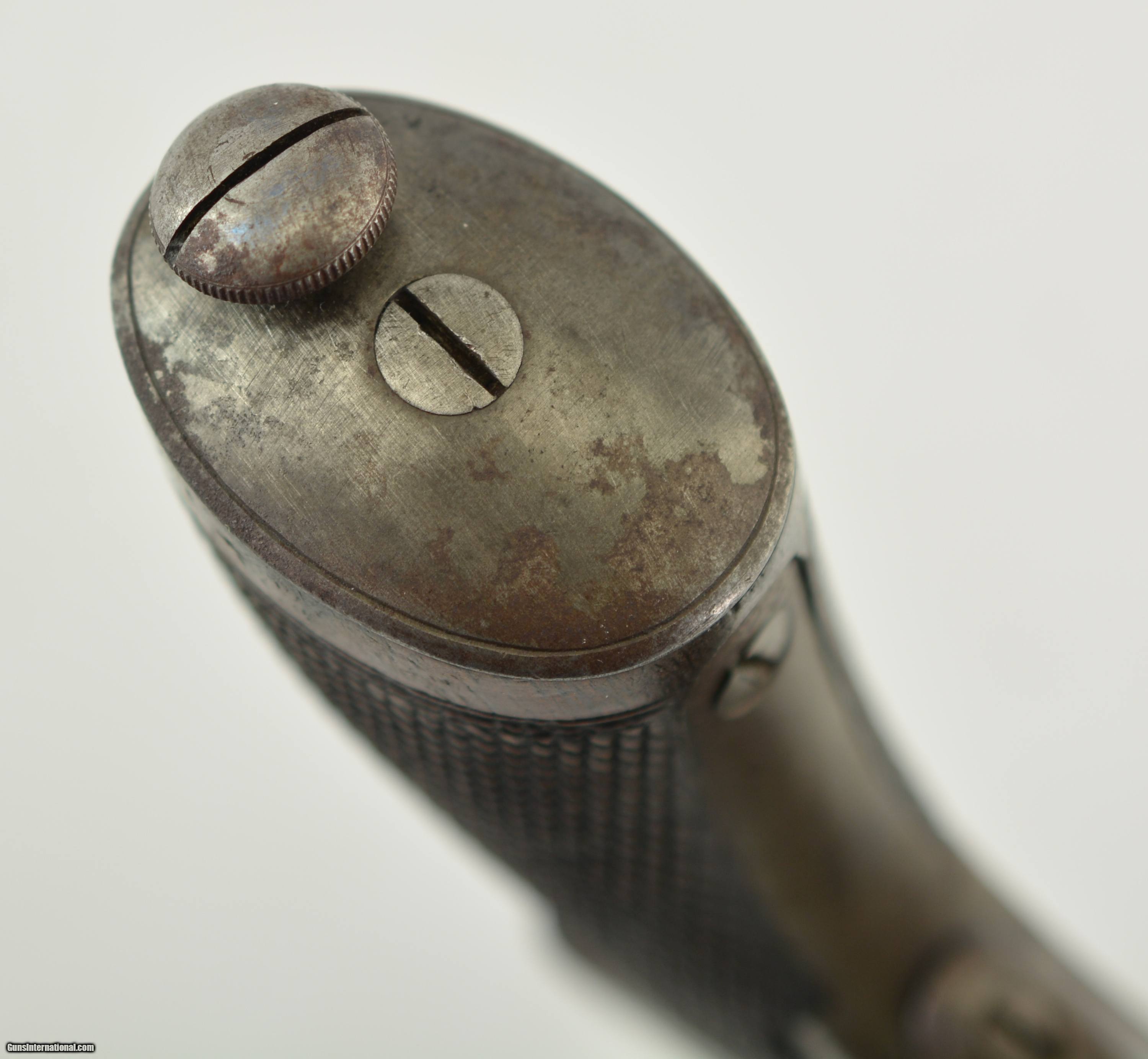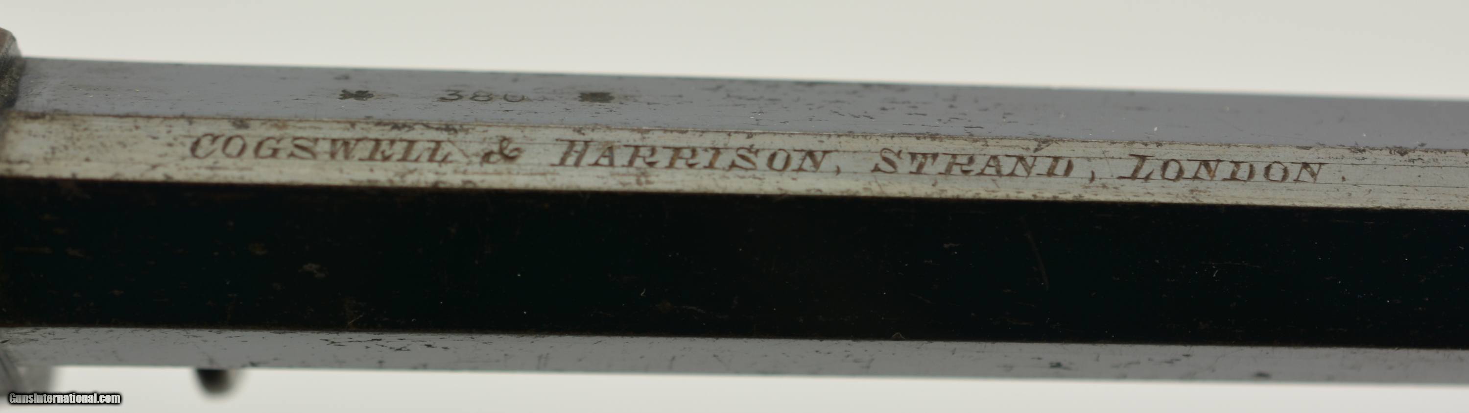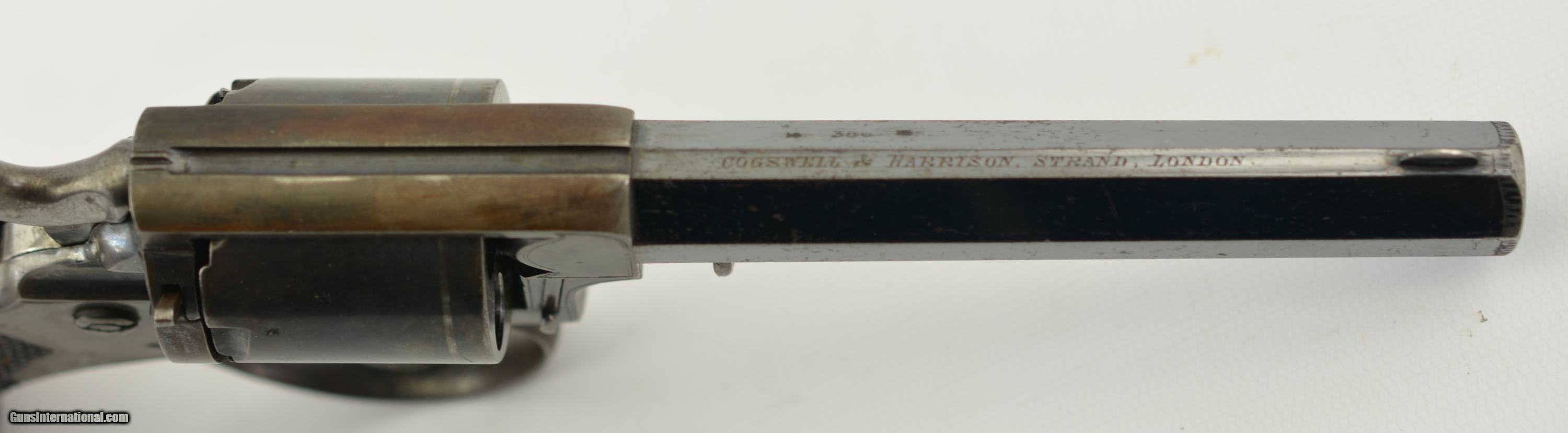 Description: Serial #12001, .38 CF, 5 inch octagon barrel with a very good bore that has some mild freckling within the grooves. This is an interesting revolver that was originally chambered in .38 RF, but was converted to .38 CF at some point. The barrel is engraved along the top flat: “COGSWELL & HARRISON. STRAND. LONDON.", and retains about 80-85% of the original bright blue, with silvering along the edges, and spots of mild freckling throughout. The cylinder has a similar amount of blue remaining, and the frame has a mostly plum-brown patina with traces of original finish remaining. The hammer has a freckled, bright gray patina, and the nose of the firing pin has been ground flush with the frame. The checkered walnut grip is in fine shape with some minor handling marks and flattening of the points, and the action lock-up is tight and functions well. This very revolver is illustrated and described on pgs. 74 and 75 of “Tranter Cartridge Fireams" by Black, Guerin & Michaud (2007), and rates about fine overall. Antique SOLD Antique: Yes Manufacturer: Cogswell & Harrison Model: Tranter Serial Number: 12001 Caliber Info: .38 Gauge Info: .38 |