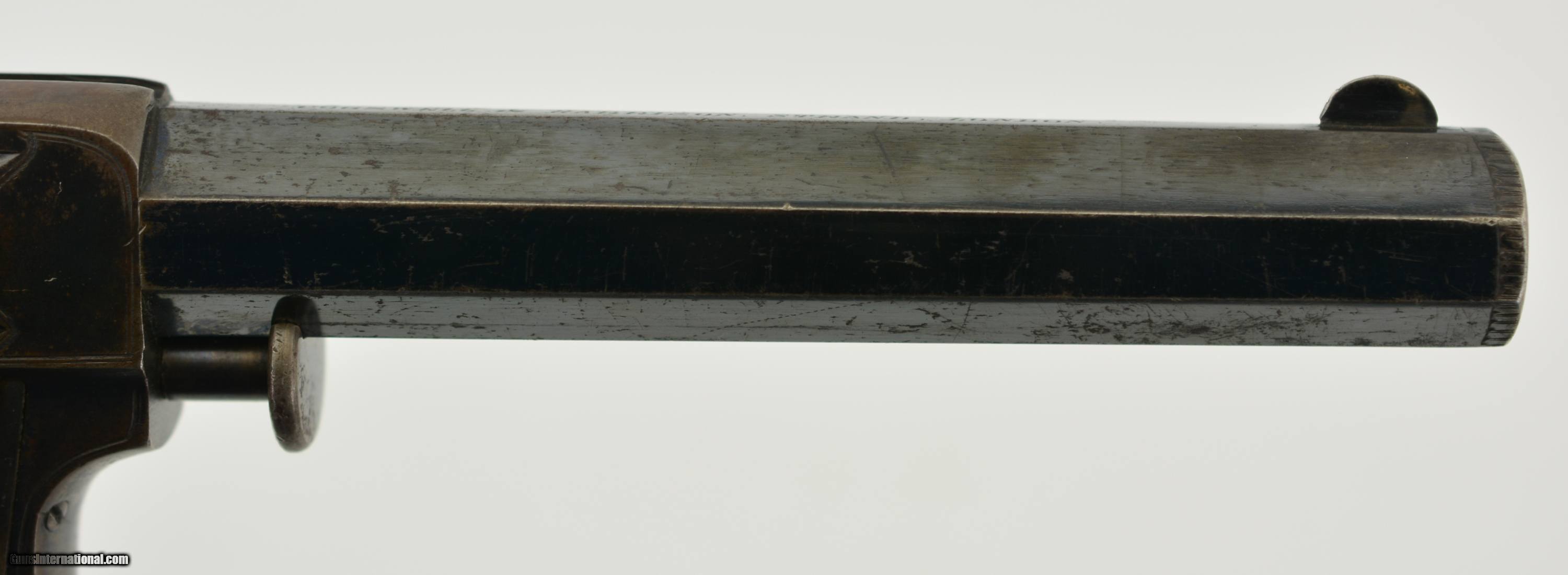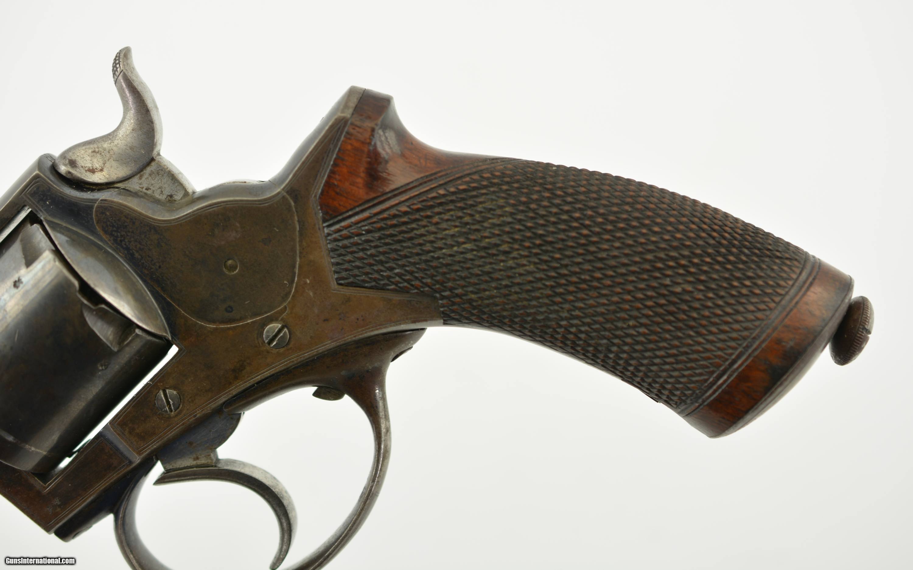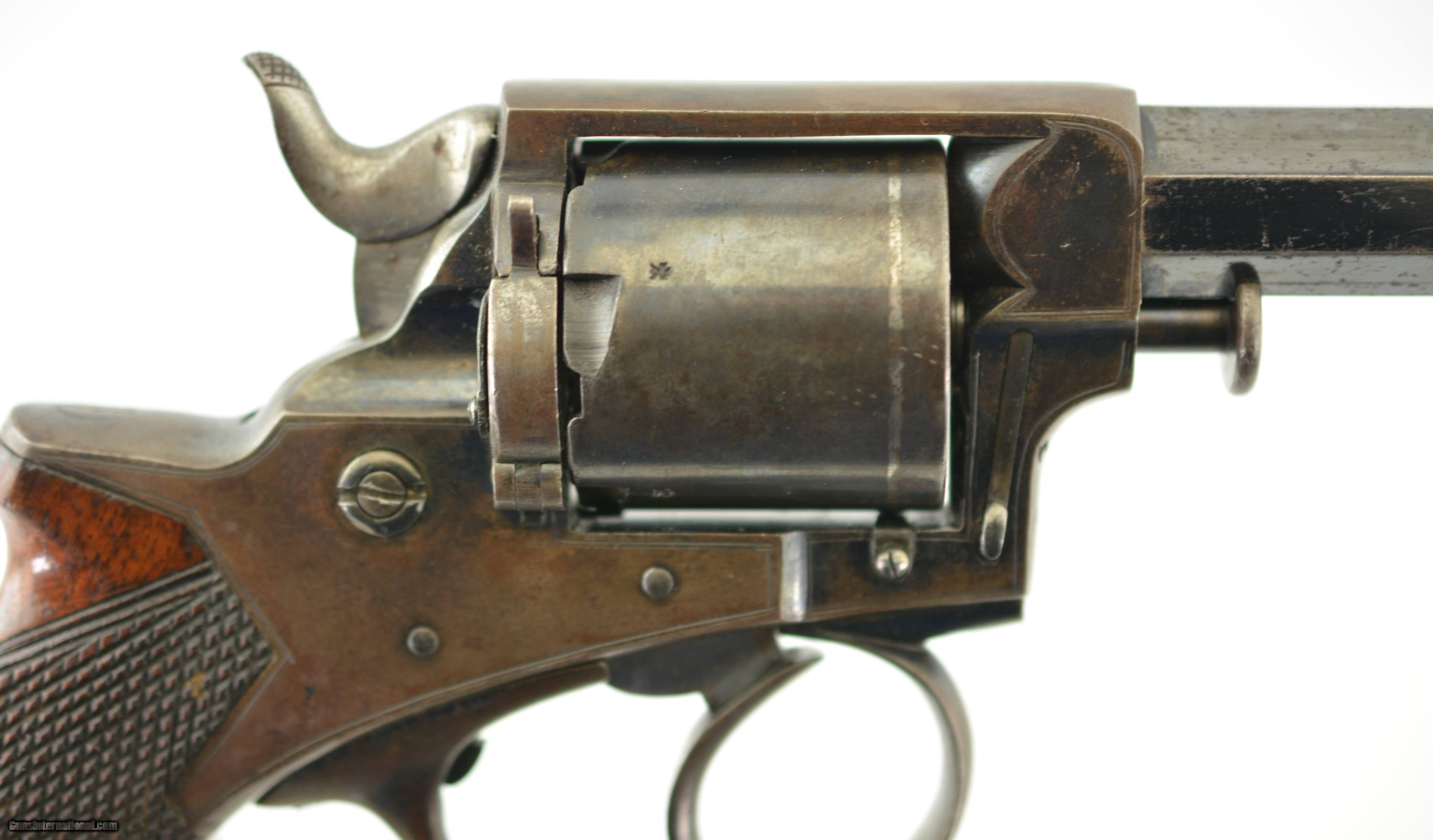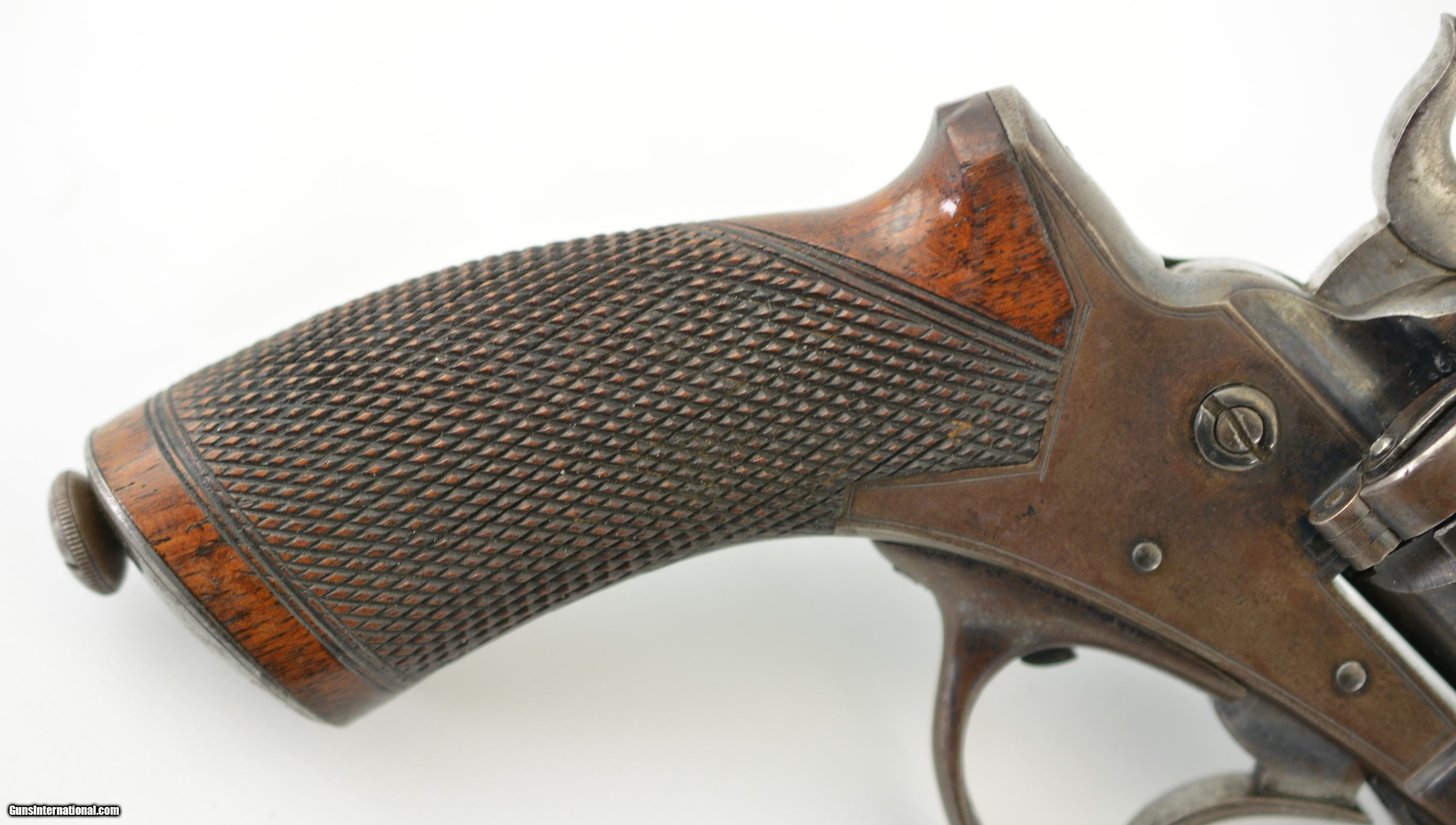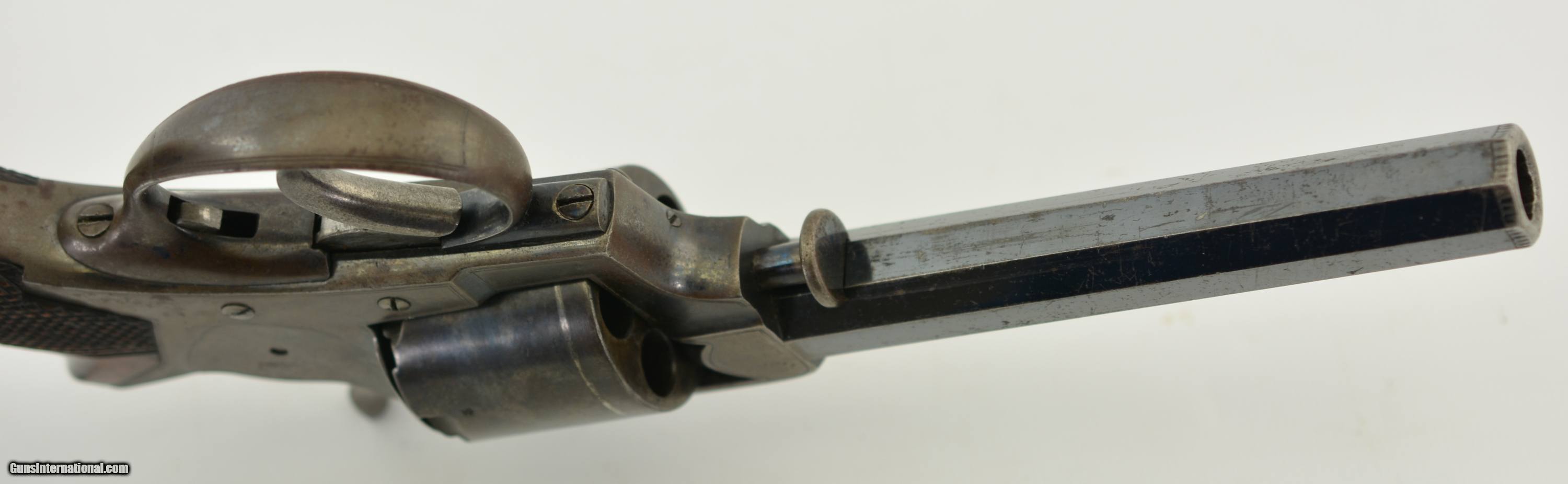Description: Serial #12001, .38 CF, 5 inch octagon barrel with a very good bore that has some mild freckling within the grooves. This is an interesting revolver that was originally chambered in .38 RF, but was converted to .38 CF at some point. The barrel is engraved along the top flat: “COGSWELL & HARRISON. STRAND. LONDON.", and retains about 80-85% of the original bright blue, with silvering along the edges, and spots of mild freckling throughout. The cylinder has a similar amount of blue remaining, and the frame has a mostly plum-brown patina with traces of original finish remaining. The hammer has a freckled, bright gray patina, and the nose of the firing pin has been ground flush with the frame. The checkered walnut grip is in fine shape with some minor handling marks and flattening of the points, and the action lock-up is tight and functions well. This very revolver is illustrated and described on pgs. 74 and 75 of “Tranter Cartridge Fireams" by Black, Guerin & Michaud (2007), and rates about fine overall. Antique SOLD Antique: Yes Manufacturer: Cogswell & Harrison Model: Tranter Serial Number: 12001 Caliber Info: .38 Gauge Info: .38 |