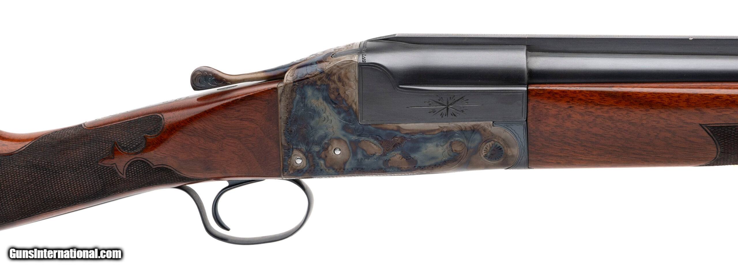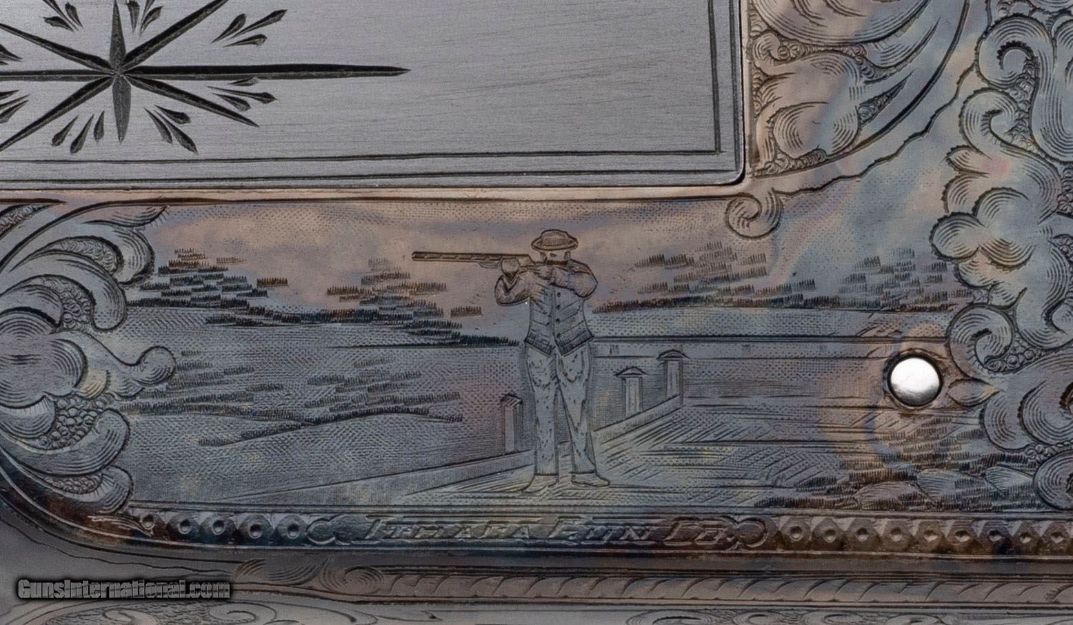 Description: "Sn: 278271T made circa 1916. 12 gauge single barrel trap shotgun with a 32" vent rib barrel with ivory front and mid bead, 2 ¾" chamber and fixed choke measuring .028. Beavertail forend with small straight grip stock with a 13 ¾" LOP to the Ithaca red rubber recoil pad with a drop of 1 5/8" to 1 ¾". Gun has been fully restored by Turnbull Restorations with charcoal blued barrel and trigger guard, engraved case colored receiver and oil finished checkered walnut furniture with fleur de lis checkering. Overall in very good condition with an excellent bore. Consignment. Price: $3,000.00 Contact Seller |