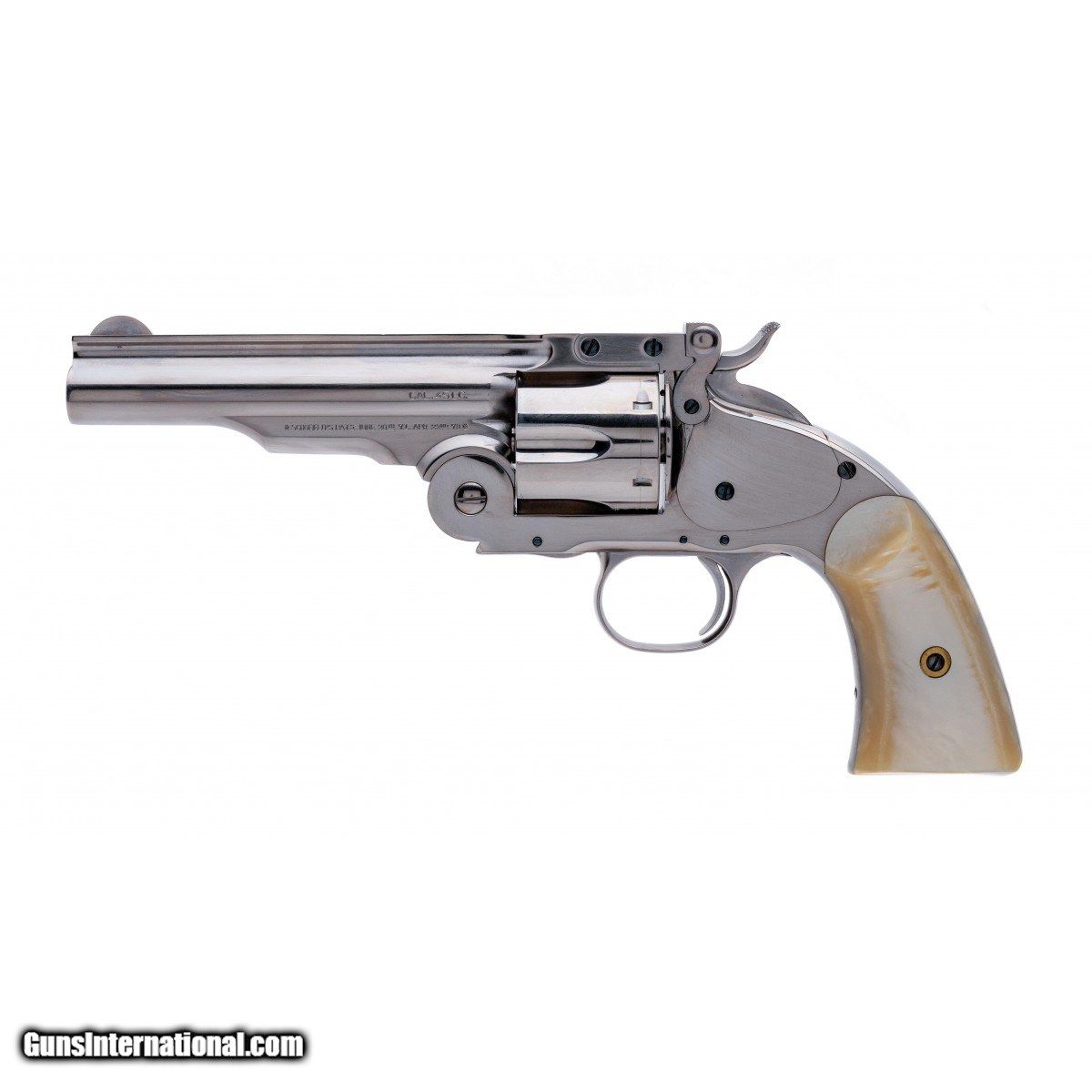 Description: " SN:F11422. Modern Production. .45Long Colt with 5"" barrel. Bore is in excellent condition. Topbreak single action revolver with stimulated pearl grips fluted cylinder and nickel plated finish. Overall condition is excellent. SOLD |