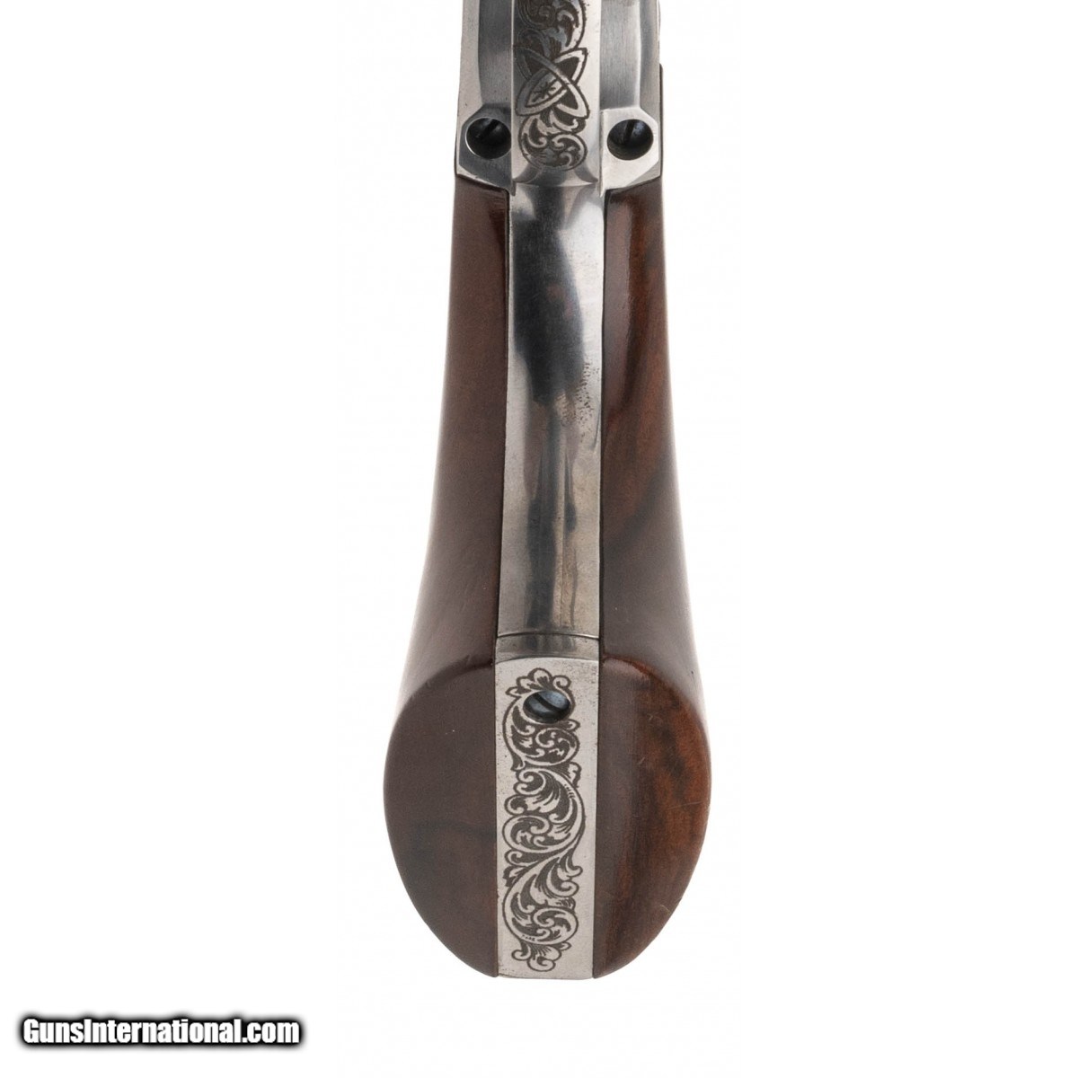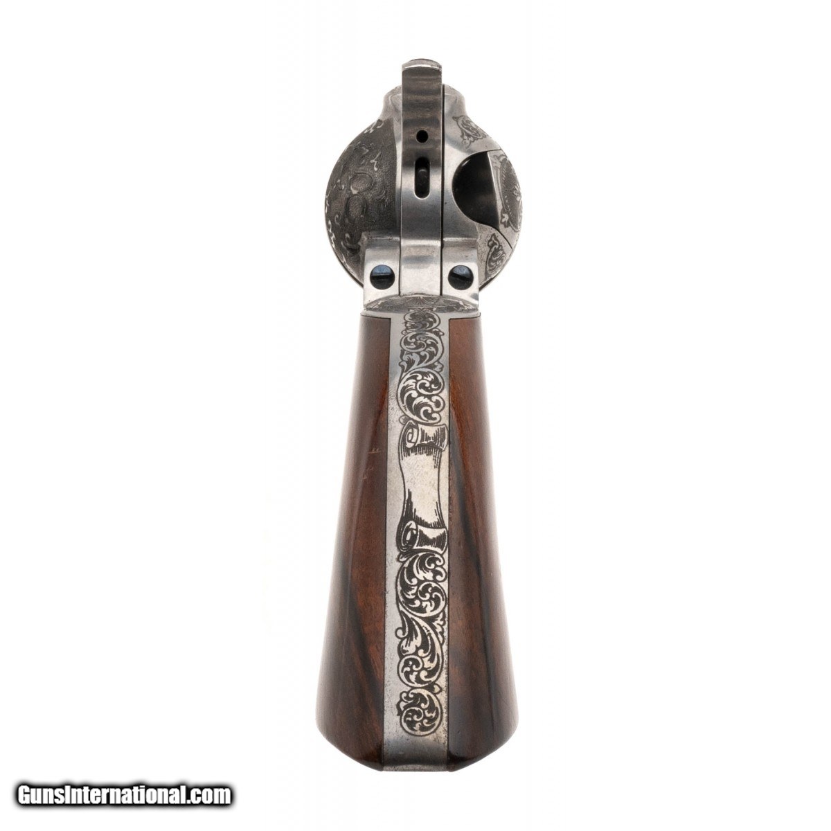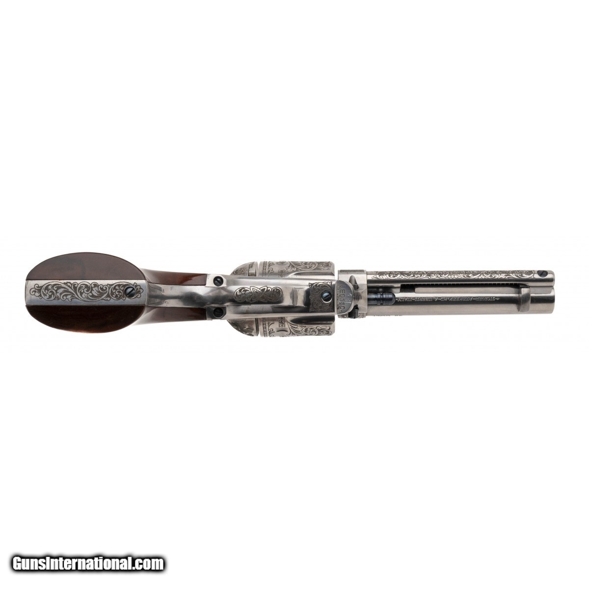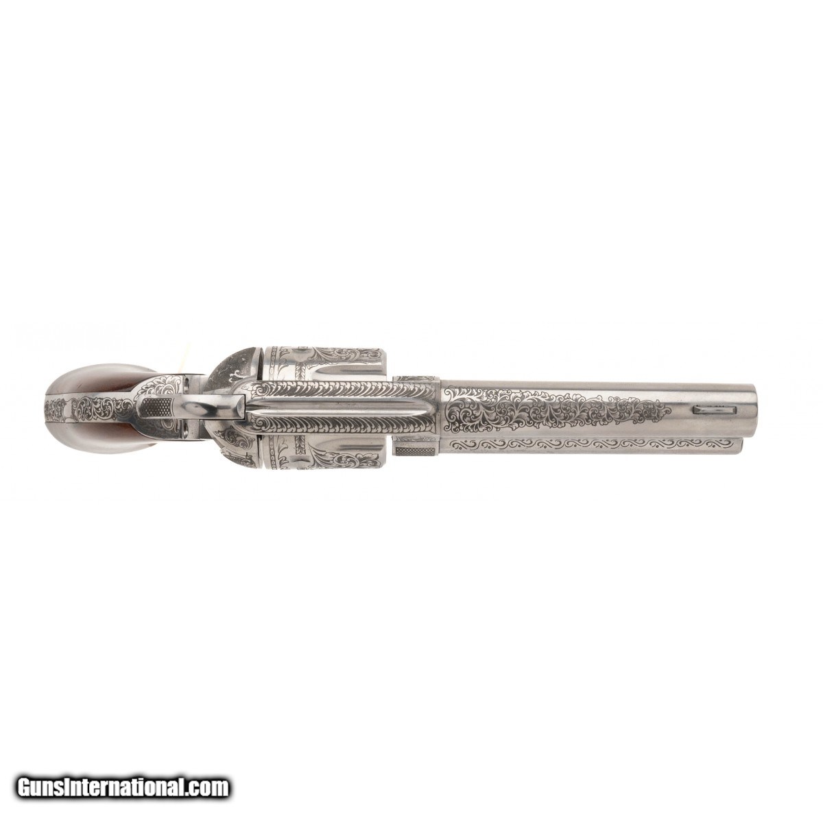 Description: " SN: LE0110. Modern production. Single Action Army replica made by Uberti. 4.75"" barrel chambered for .45 Long Colt. Polished stainless finish with engraving on the barrel, frame and cylinder. Very good condition with scattered cleaned surface rust. Bore is excellent. Action functions correctly. Austin location. SOLD |