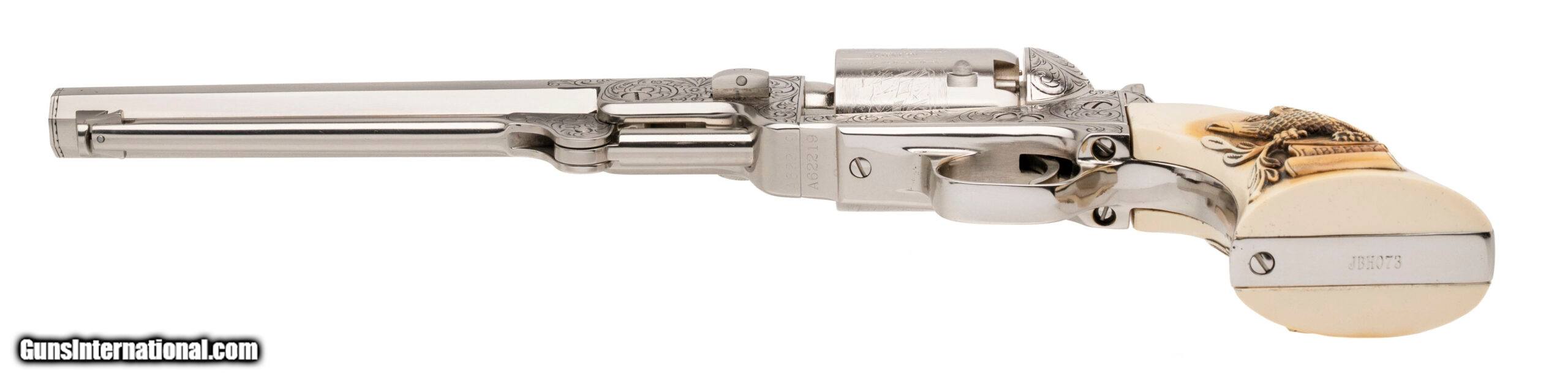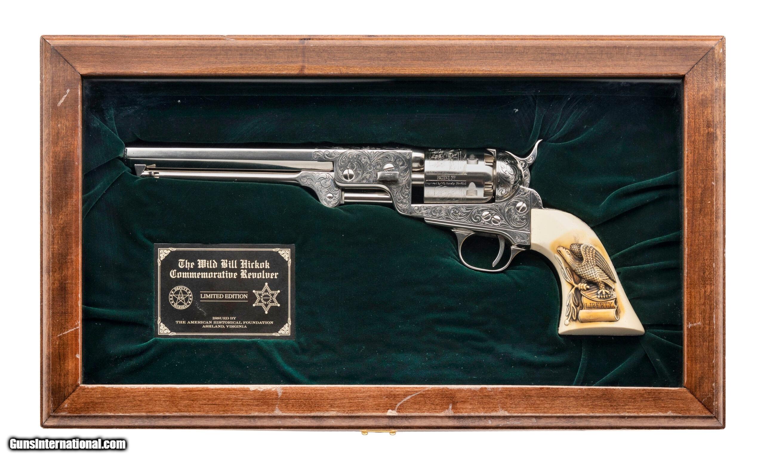 Description: "SN: A62219, gun #JBH073 out of the 500 made by Uberti for the American Historical Foundation. .36 caliber copy of the 1851 Navy nickel plated and engraved with faux ivory carved grips with ""J.B. Hickock"" engraved on the back strap. Overall in excellent condition. Comes in commemorative case and box. Dallas Location SOLD |