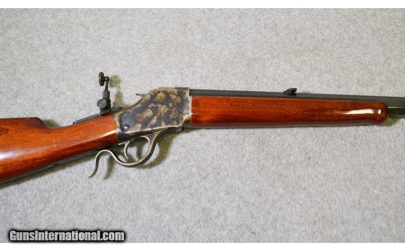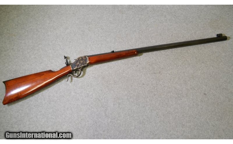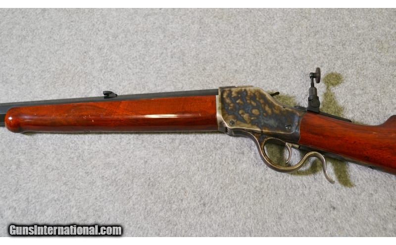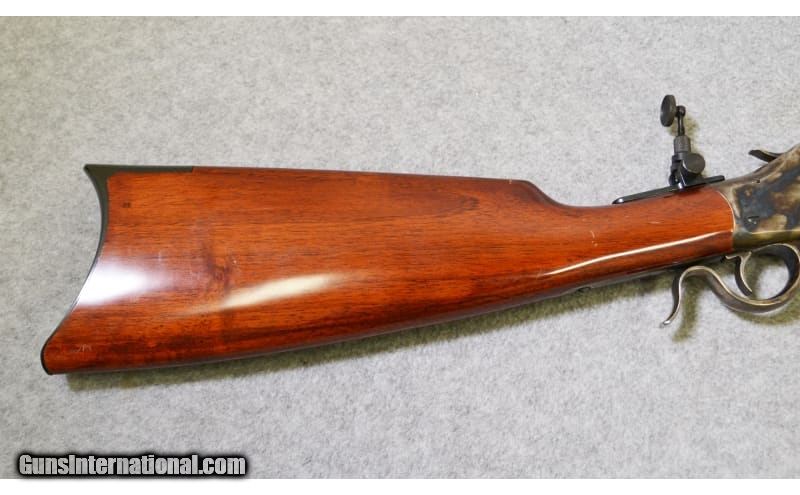 Description: Uberti is a well known manufacturer of high quality replicas of 19th century American percussion revolvers, carbines and rifles. These replicas are used by historical re-enactors and target shooters. Thanks to their exceptional quality, Uberti replicas are also sought after by collectors and historical firearms enthusiasts. This 45-90 has been lightly used. There are just a couple of very minor blemishes on the stock. .45-90 WCF SOLD Chambers: 45-90 Metal Condition: Very good Wood Condition: Very good Bore Condition: Bright and shiny Barrels: 29.5 Inches Triggers: Factory Single Stock Dimensions: 14 Inch LOP Fore End: Very Good Weight: 9 lb. - 10 oz. Sights: Foldable Creedmore style peep and iron sights Chokes: N/A Item Location: Mitchell, SD |