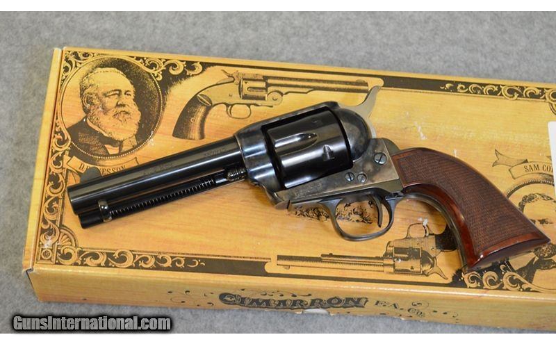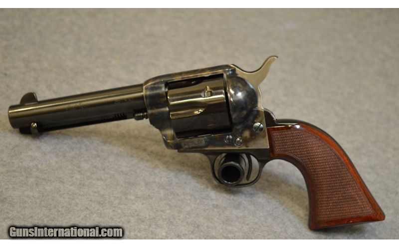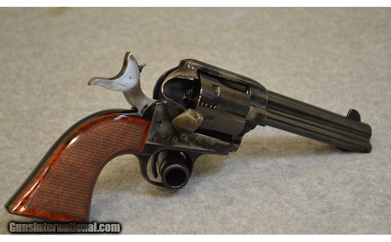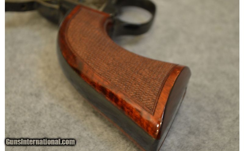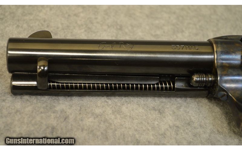 Description: This "Evil Roy" single action revolver is an exact replica of an Old West single action revolver. This revolver was known in the Old West as a "six-shooter". It has a case-hardened/blue finish and has a 1 piece Walnut Hand Checkered grip and has a 6 round capacity. It has a wide square notch rear and wide constant width front sight. This "Evil Roy" six-shooter wears the signature, roll engraved on the barrel of SASS National Champion shooter Gene "Evil Roy" Pearcey. .357 Magnum SOLD Metal Condition: Good condition Wood Condition: Good condition Bore Condition: Good condition Barrels: 4 3/4 Weight: 2 Lbs. 9 Oz. Item Location: Huntsville, AL |