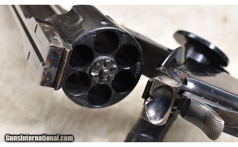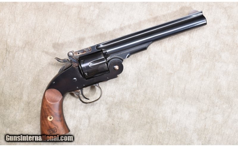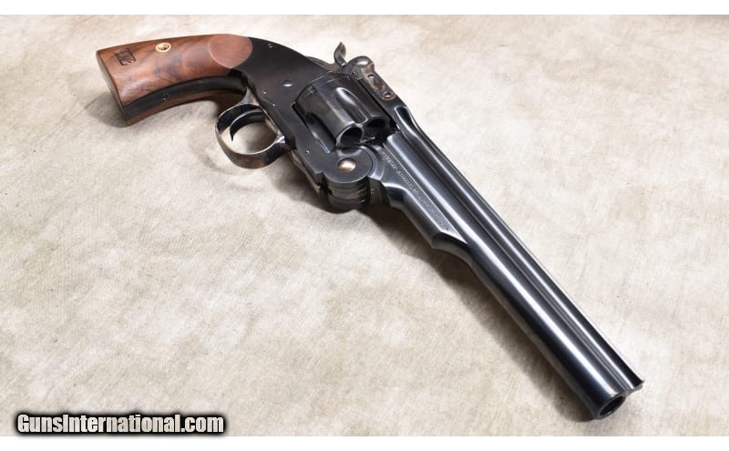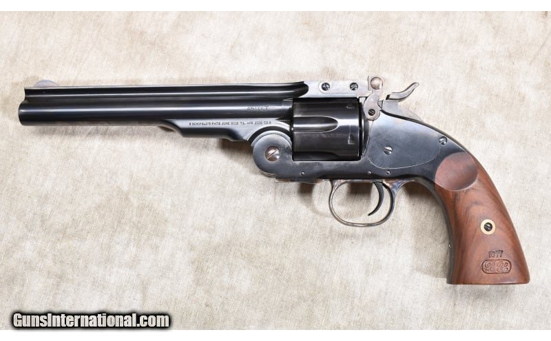 Description: This faithful reproduction of the famous Colt Schofield features good blue, nice wood grips, and case color latch parts. .45 Colt SOLD Chambers: 6 rounds Metal Condition: "Very good. It has been fired, but it doesn't show much. Light turn line. Wood Condition: Excellent. Bore Condition: Shiny and bright with good rifling. Barrels: 7-inch Triggers: Factory single action trigger. Butt Pad: Smooth hardwood. Weight: 43 oz. Sights: Fixed blade and notch. Item Location: Rogers |