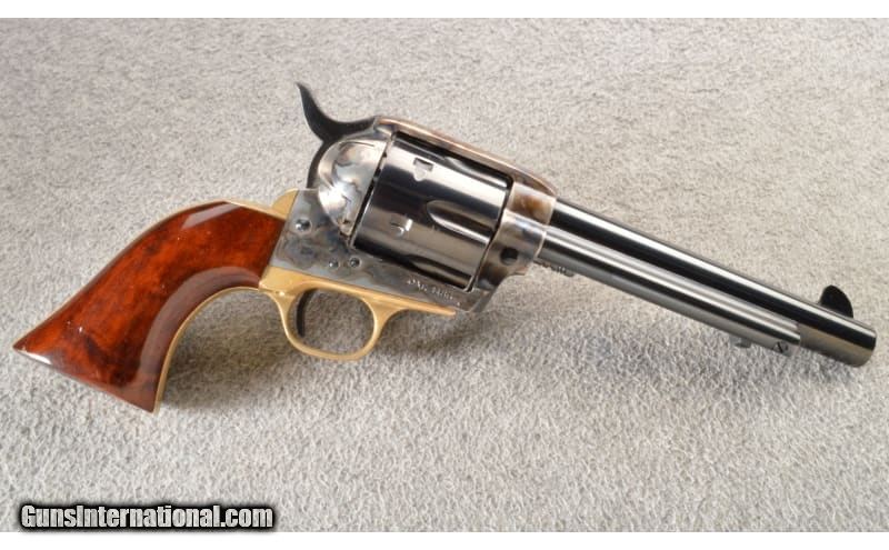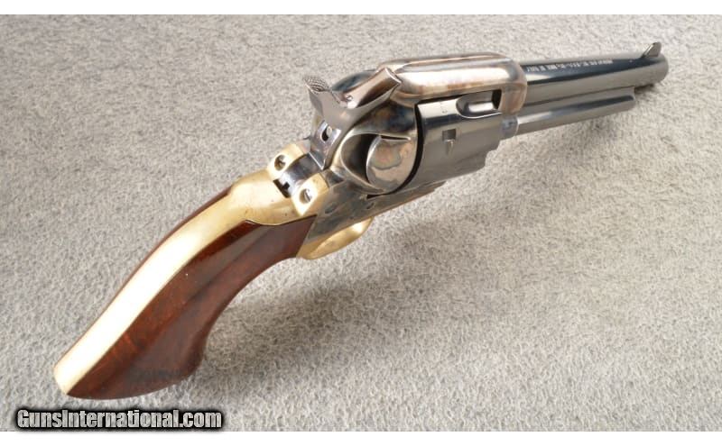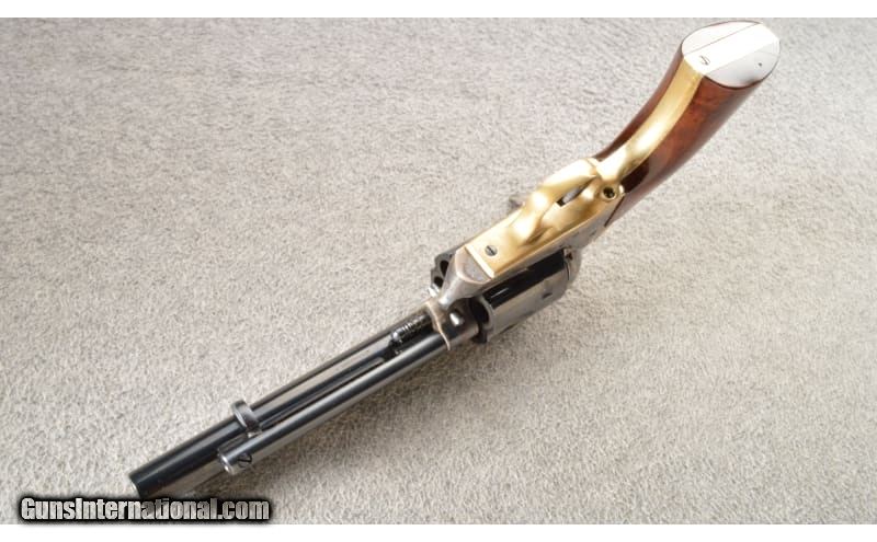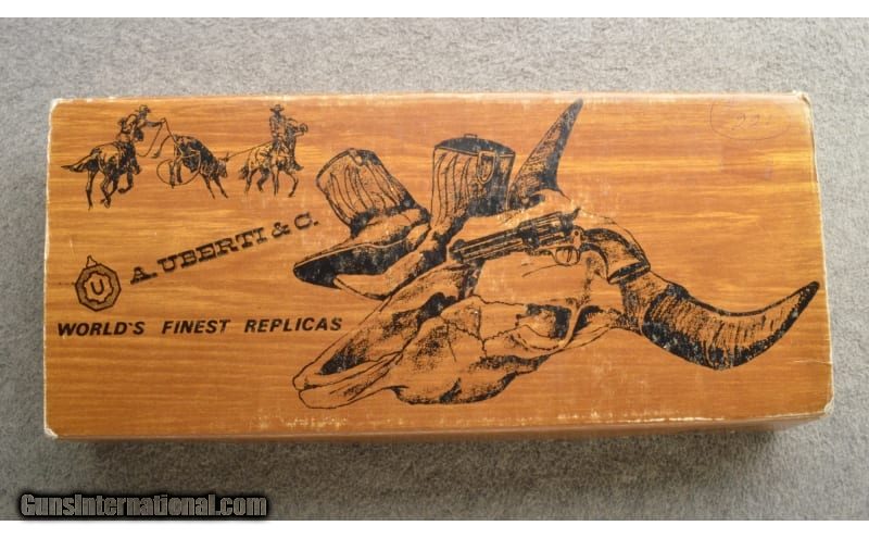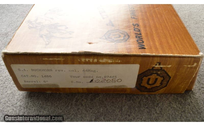 Description: American Arms Uberti Buckhorn single action army revolver chambered in .44 Magnum with a 6" barrel. The front sight is a blue blade with a curved front face fixed to the barrel. The rear sight is "U" groove milled into the top strap. The barrel is a polished blue with a case colored frame and a brass trigger guard/back strap. The left side of the barrel is marked "S.A. CAL. 44 MAG." The top of the barrel is marked "AMERICAN ARMS INC. N.K.C.-MO. MADE IN ITALY". The right side of the frame is marked "CAT. 1486" and with an Italian proof mark. The underside of the frame is marked "102050" / an Italian Gardone proof and an Italian Smokeless Powder proof. The bottom of the barrel is marked "A. UBERTI – ITALY". The rear surface of the cylinder is marked "0" and "50". Comes in the factory matched box and owners manual. Lightly used in great condition. .44 Magnum SOLD Chambers: 6 shot revolver. Metal Condition: Light high edge wear on left side of the muzzle and the front ejection rod housing. Light turn line. Wood Condition: Light handling marks. Bore Condition: Bright shape rifling. Barrels: 6" barrel. Triggers: Single action trigger. Weight: 2.5 lbs Sights: Fixed. Item Location: Owatonna, MN |