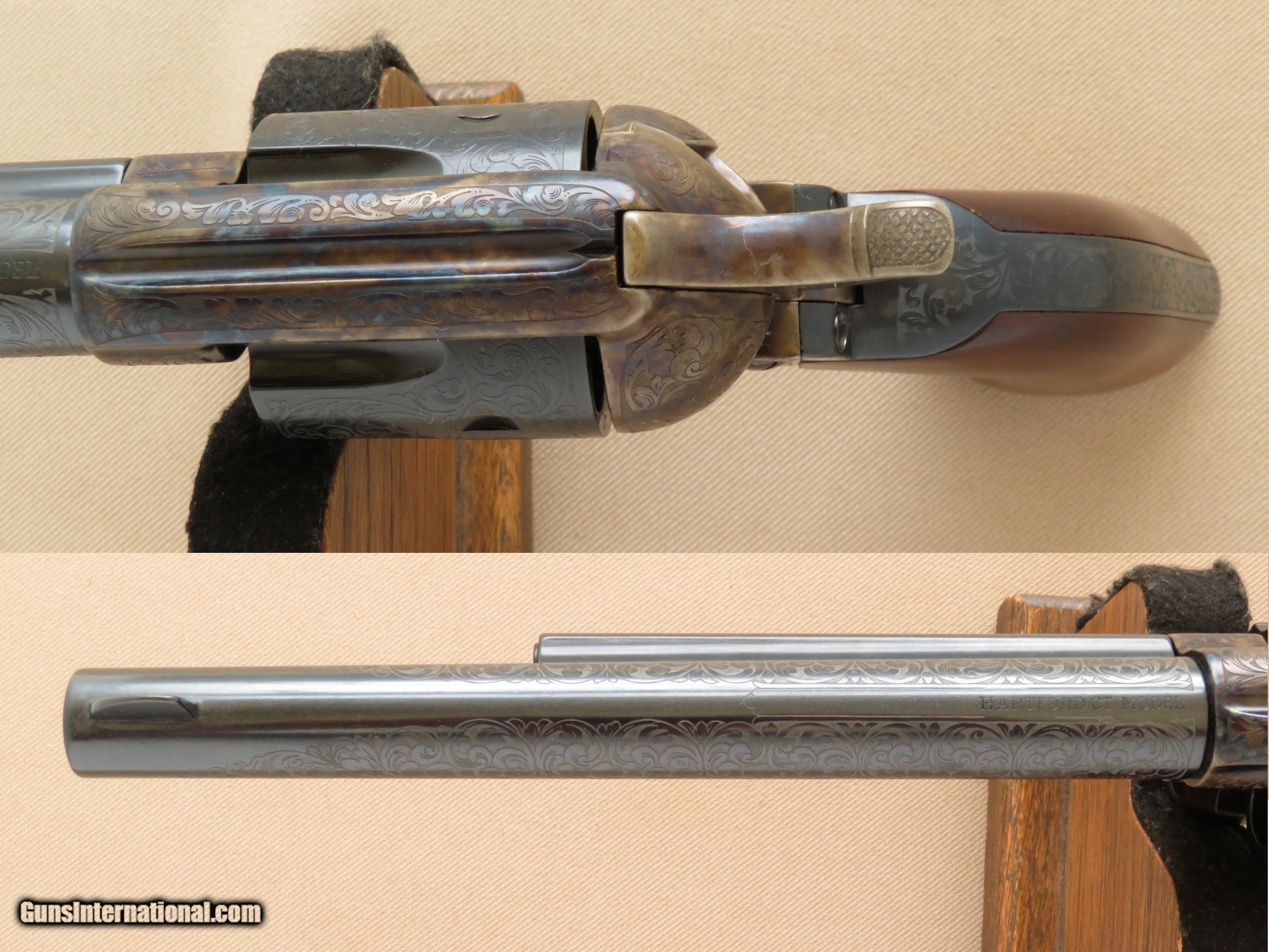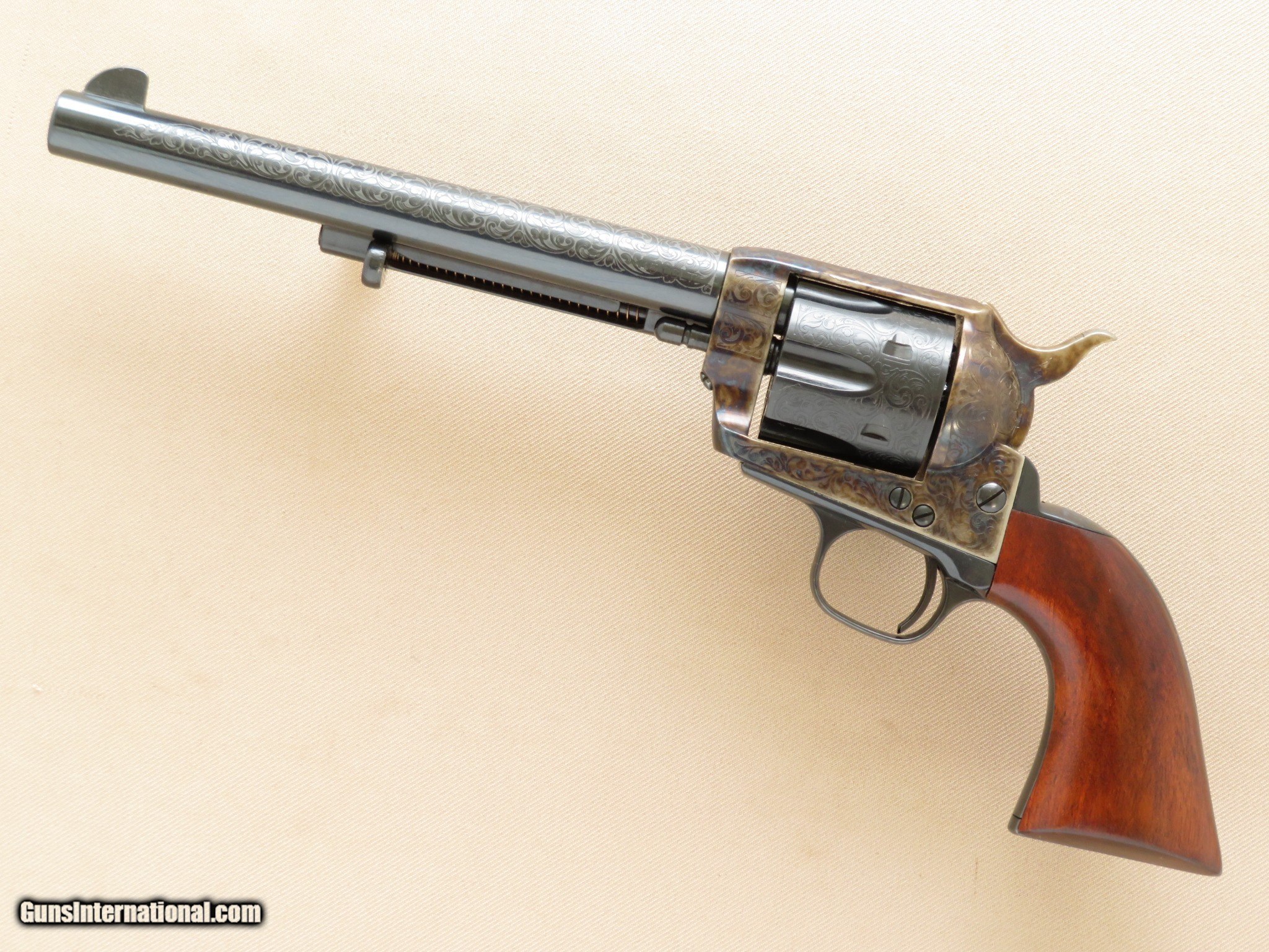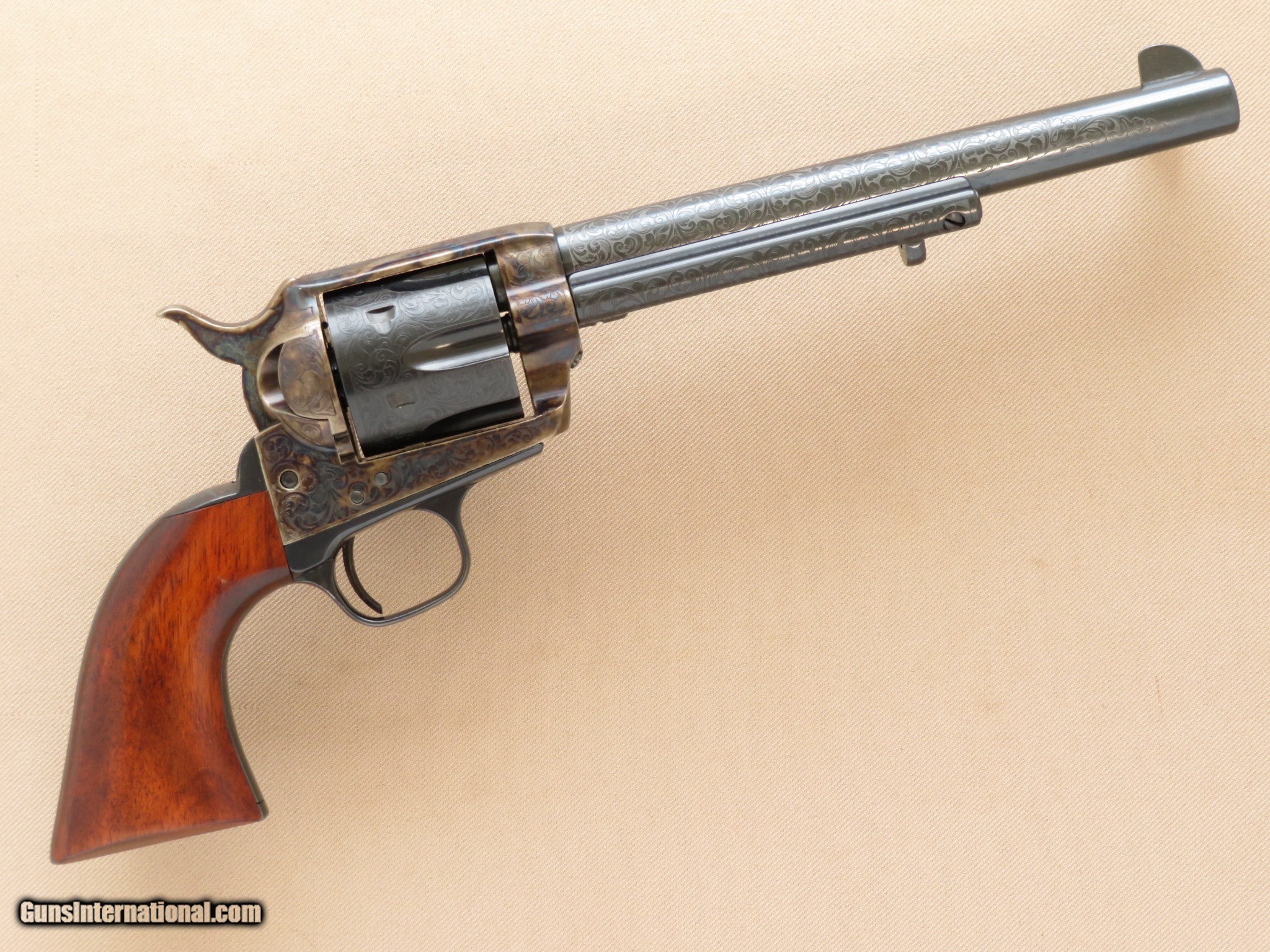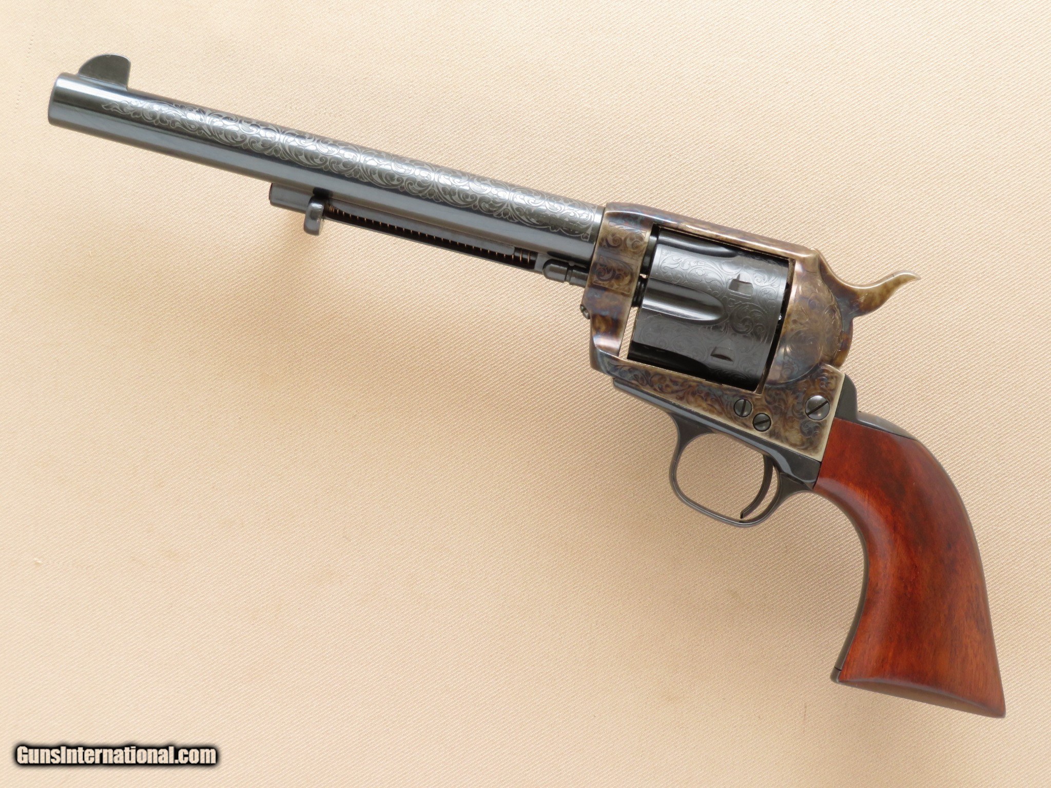 Description: EMF, Italian Made, Hartford CT Model Single Action fitted with a 7 1/2 inch barrel, one-piece wood grips, built on a "black powder" frame, is approximately 2/3rd's coverage laser engraved, blue/color case hardened finished, and chambered in .45 LC. The 6-shot single action revolver is in like new/unfired condition, retaining 99%+ of all its original finishes. The bore is as new and the action functions the same. Comes with a fitted wood presentation case, its in good condition, with what appears to a repair on the lid. PRICE: $750 We are Antique & Modern Firearms in Lexington, KY, dealer of fine firearms since 1974. PH. 859-276-1419 We Buy, Sell and Trade Firearms & Knives. Have a Individual Firearm, Firearms Collection, or Firearms Estate to sell, let us know, we can buy or consignment sell it for you. NOTE: No additional fee for a Credit Card payment. SOLD Handgun Caliber: .45 Colt Manufacturer: EMF Model: Single Action |