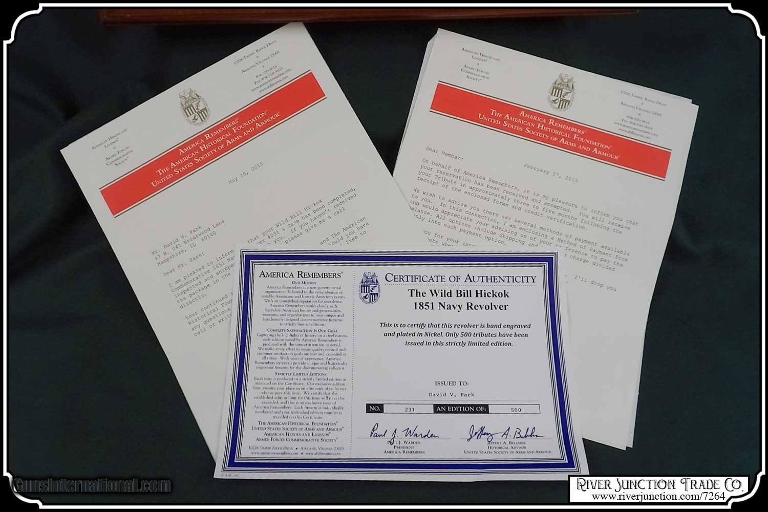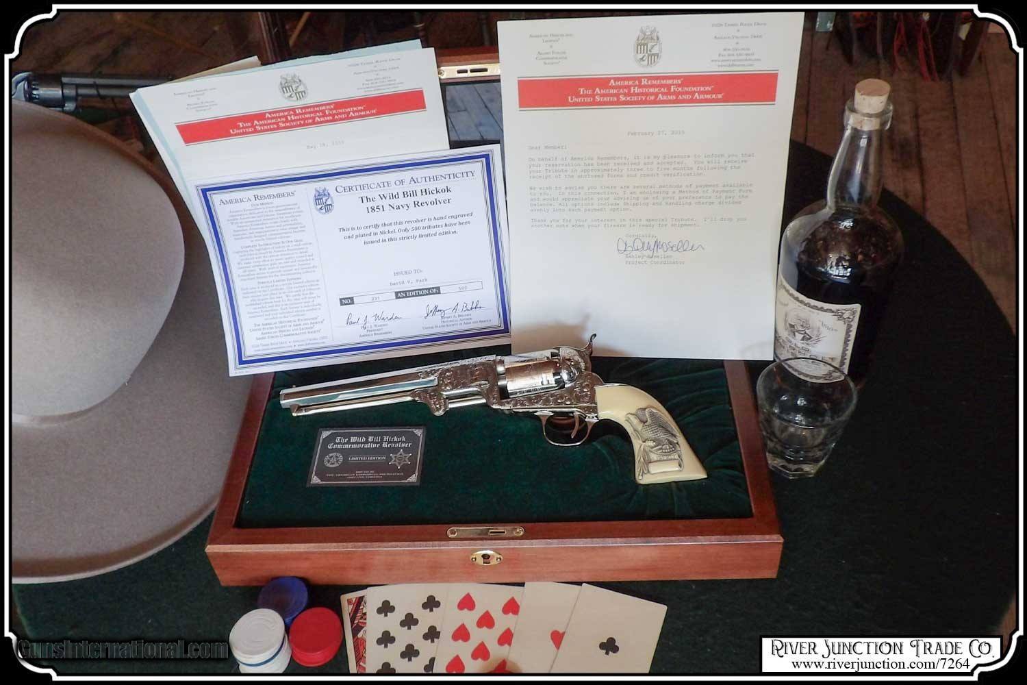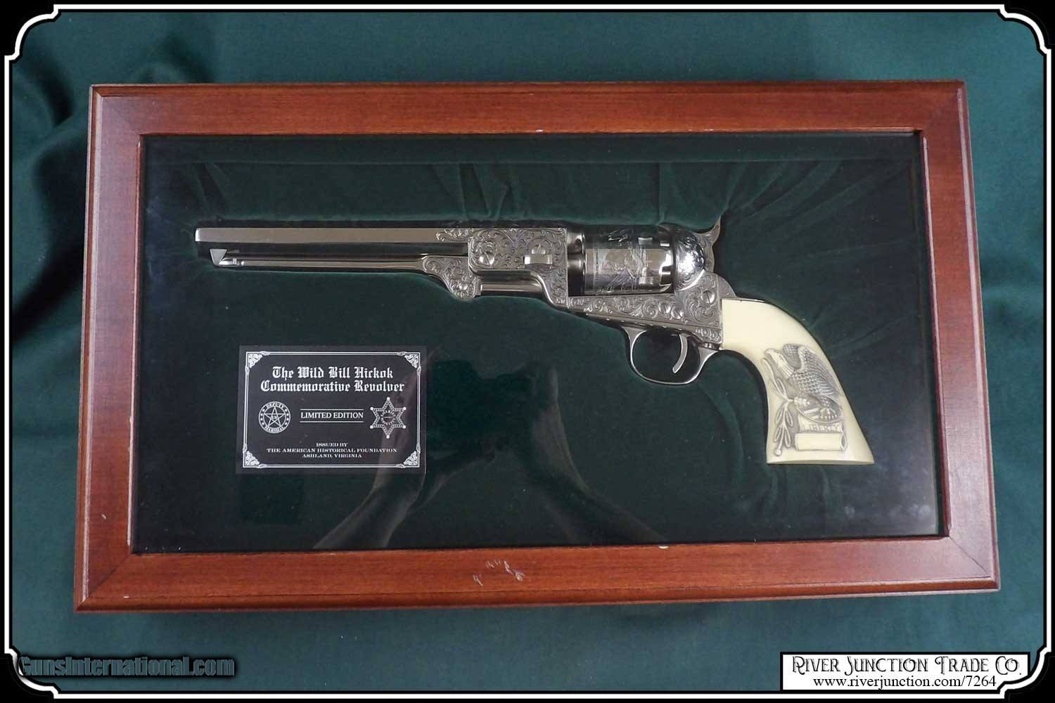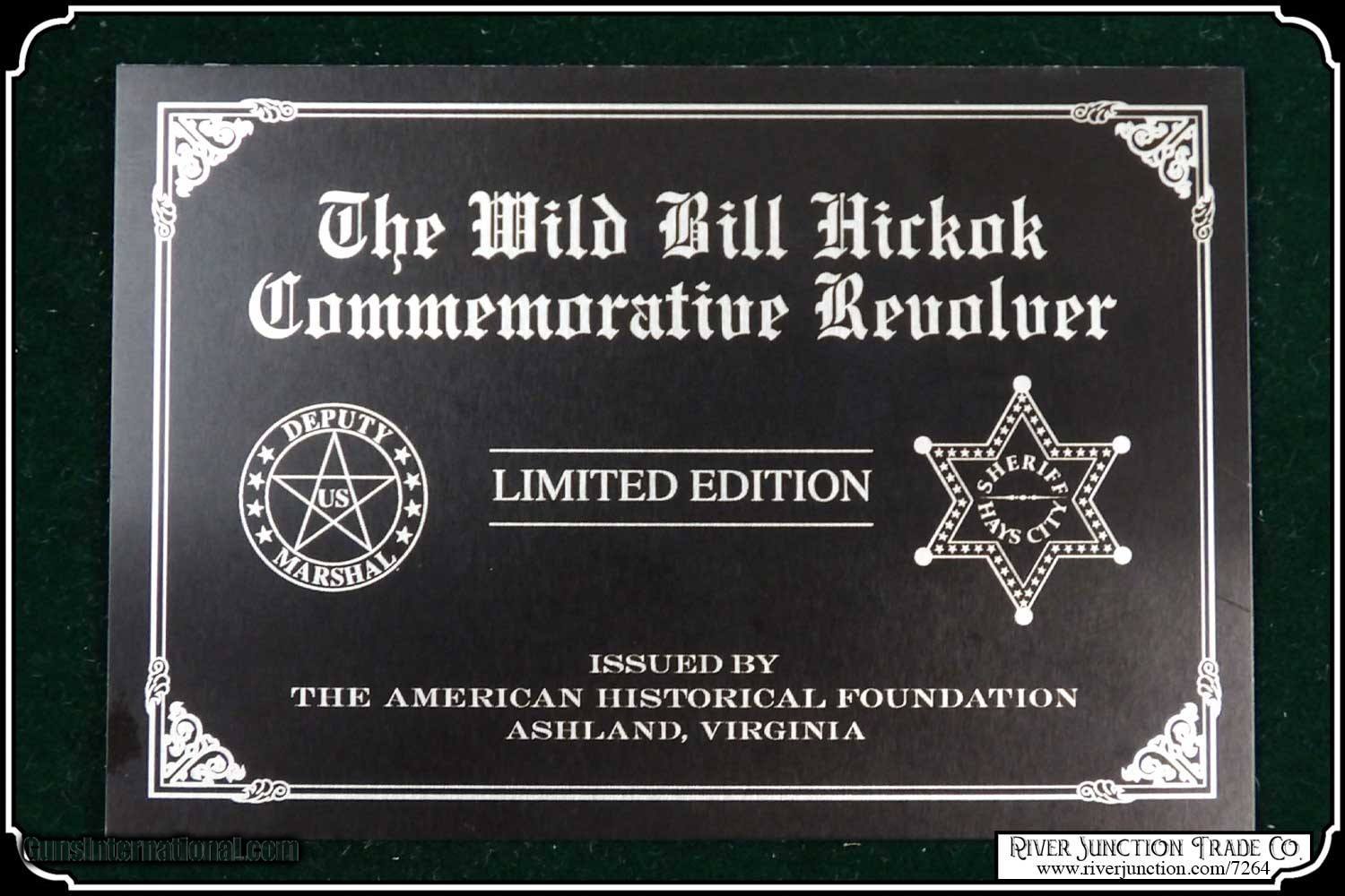 Description: Straight from the heart of the frontier and forged in the spirit of the Old West, this Wild Bill Hickok Commemorative 1851 Navy Revolver is a museum-worthy piece for the serious collector. Created by the American Historical Foundation and issued by America Remembers, this revolver pays solemn tribute to the storied life and death of one of the West’s most iconic and tragic lawmen—Wild Bill Hickok. Each revolver in this exclusive 500-piece edition captures the essence of Hickok's grit and honor. This particular piece is #231/500, with the registration number: JBH231 etched into the trigger guard. Crafted with reverence and detail:
