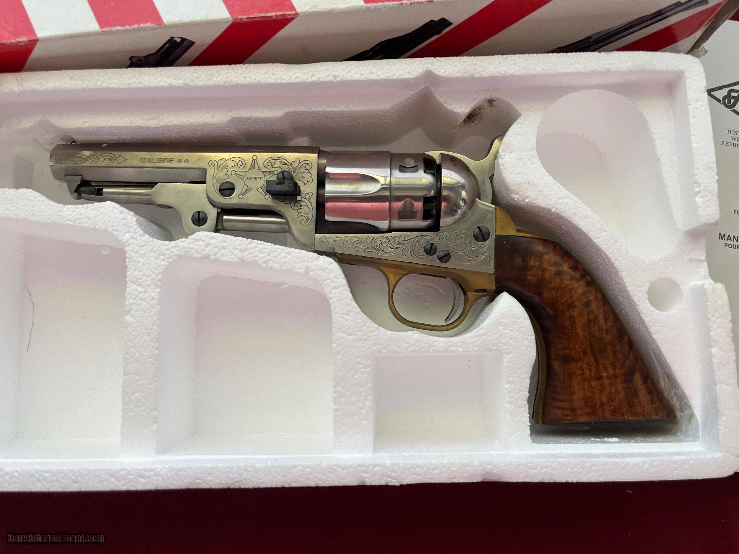 Description: PERCUSSION REVOLVER . 44 CALIBER / SER# 381533, STAINLESS AND BRASS. 5 INCH OCTAGON BARREL . COMES WITH BOX AND PAPERWORK. EASTERN BRANCH FIREARMS ADD 50.00 SHIPPING – NEXT DAY AIR SHIPPING ADD 50.00 SHIPPING – LONG GUNS GROUND OPTIONAL INSURANCE IS AVAILABLE AT 1.25 PER 100.00 Questions e-mail or call Glen at Eastern Branch Firearms 207-215-5021 TERMS – PLEASE READ BEFORE I DO NOT HAVE A LAYAWAY OPTION ( WE ACCEPT CREDIT CARDS ) -- I GET ALOT OF REQUEST FOR TRADES, I WOULD PERFER NOT TO DO TRADES ON MY INTERNET LISTINGS PAYMENT OPTIONS- We accept money orders, cashier’s checks , bank checks. sorry no personal checks. We accept all major credit cards please add 3% to the ’s cash discount price.(Shipping within the state of Florida - Florida Residents must pay sales tax) .Handguns and long guns do need to be shipped separate. PLEASE do not send payment via FED EX . USPS & UPS are fine. Thank you. We include a signed copy of our FFL with each firearm shipped. SAFTY NOTICE- Buyer is solely responsible for determining that a used gun is safe to shoot. The firearms offered have not been test fired but have been given a visual inspection only for purposes. It is a requirement that every used firearm is inspected by a qualified gunsmith before firing. By , the buyer agrees to hold seller harmless against damages, injury, or death caused by defective merchandise. RETURN POLICY- All firearms come with a 3-day non firing , non messing with ( turning srews ,taking apart,removing parts, scoping. firing, cleaning or messing with in anyway) inspection/return privilege.Inspection is based on a visual review of the gun to confirm the gun is in the condition stated. In the case of a return, buyer pays all shipping charges & if paid for with a credit card buyer absorbs the 3% credit card charges . So please ask questions BEFORE you bid. Thanks for Looking and Good Luck!! U.S. sales only, no exports…this includes antiques. I will ship to third party for exporting SOLD |