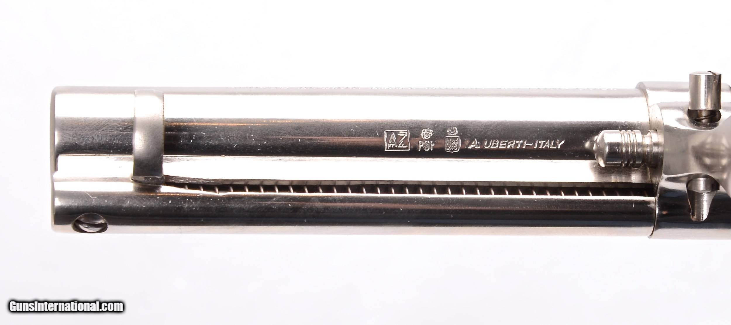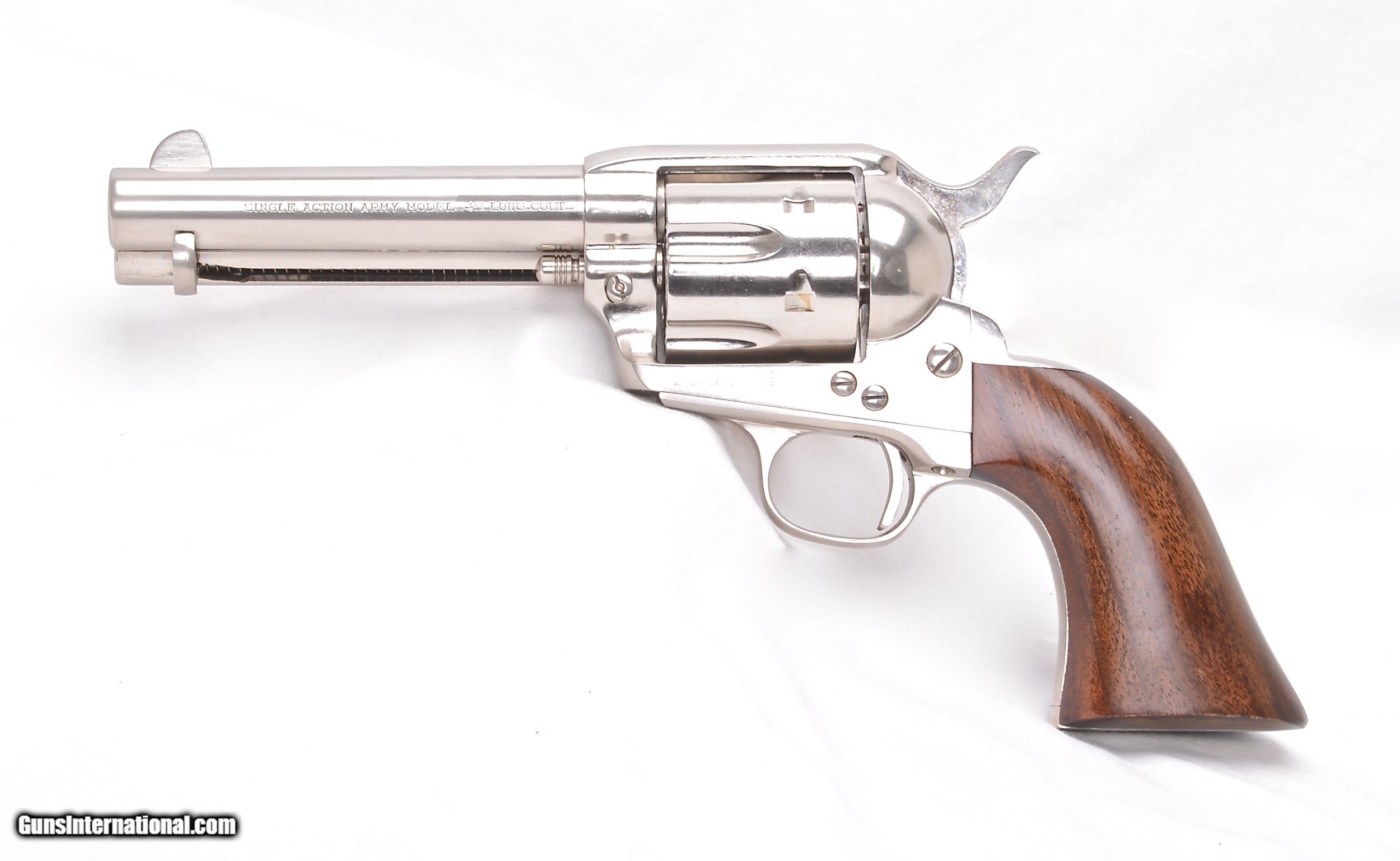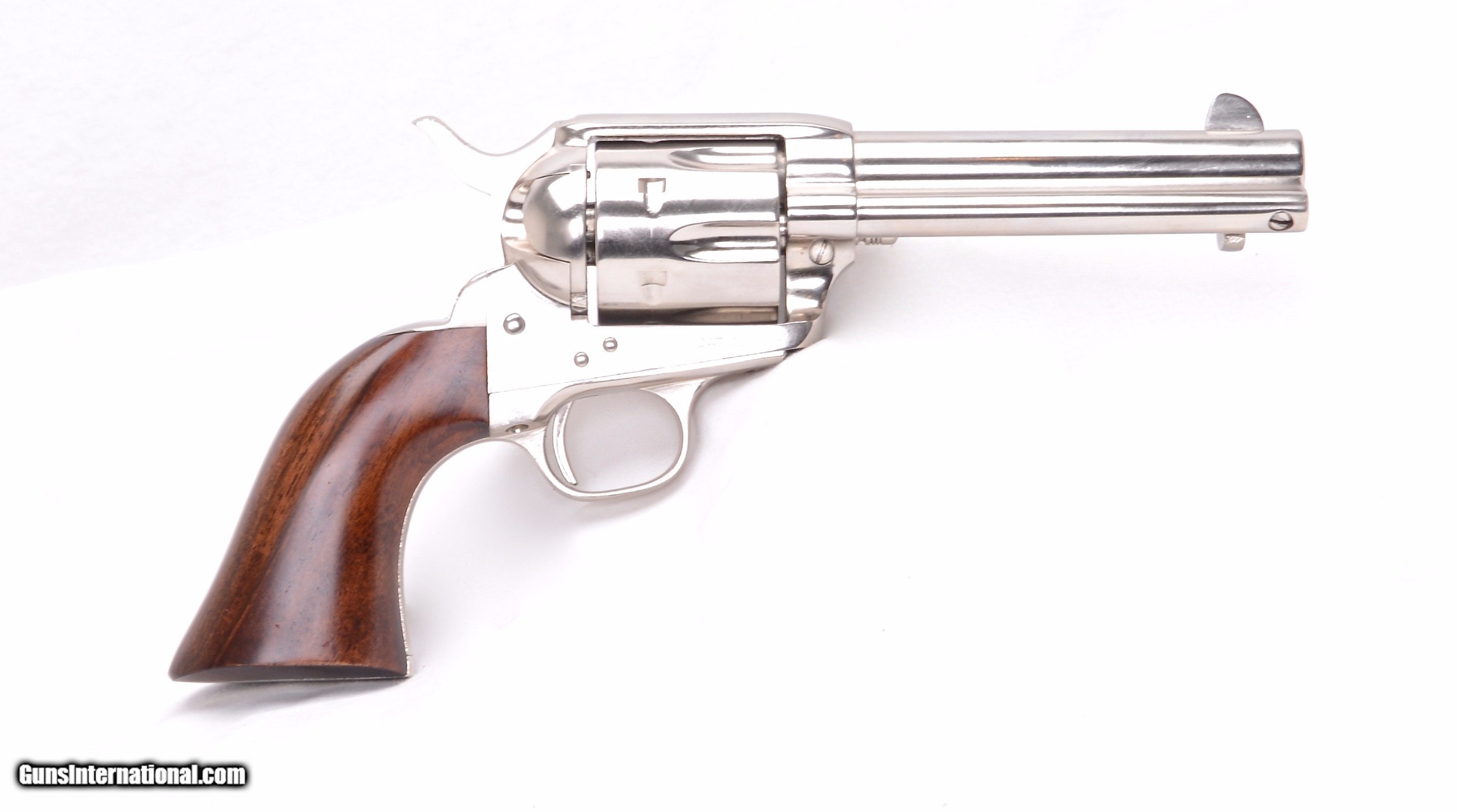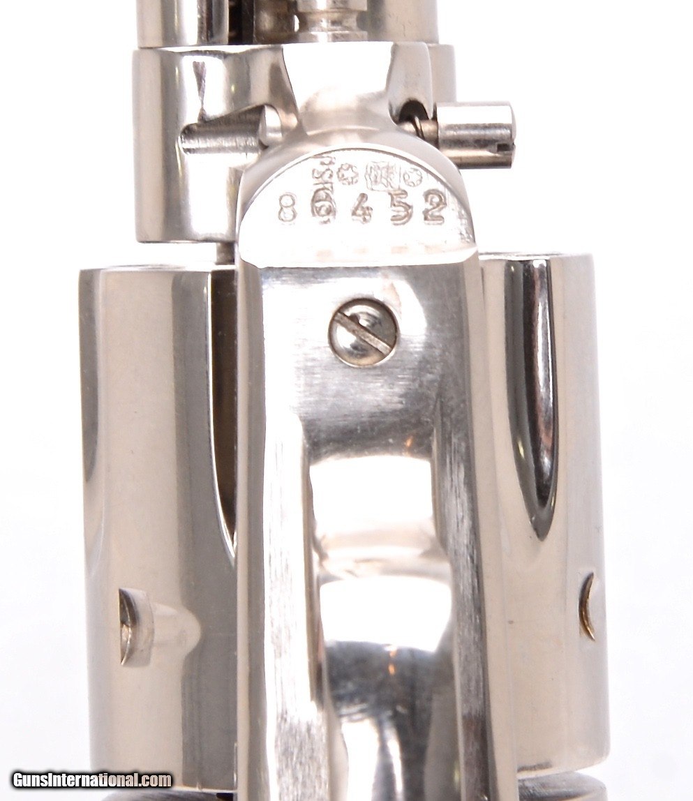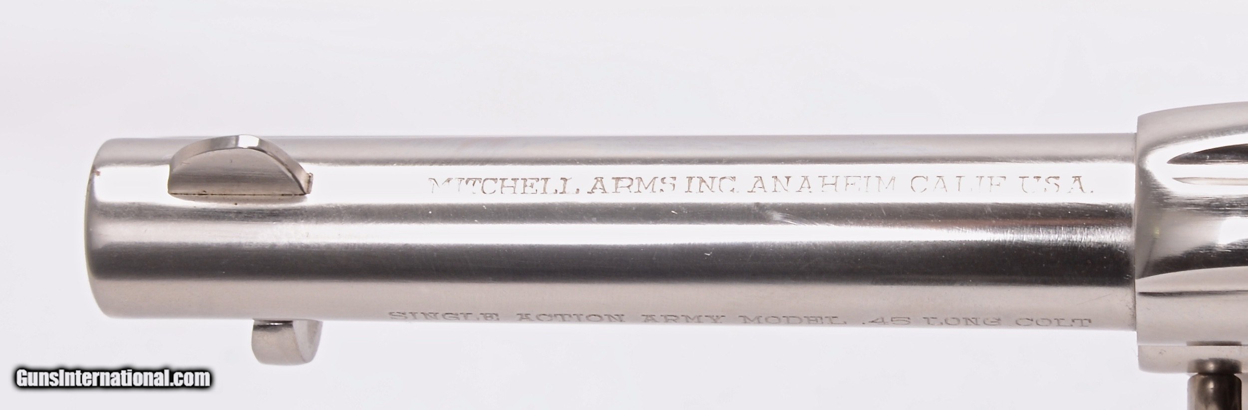 Description: SALE PENDING Mitchell Arms SAA .45 lc revolver. 4 ¾” barrel, all nickel finishes, one piece walnut grips. This gun appears to be unfired but the nickel finish has dulled during storage. $395.00 SN: 86452 SOLD |