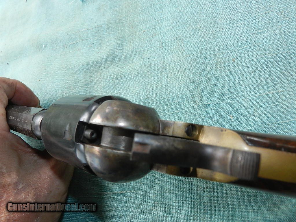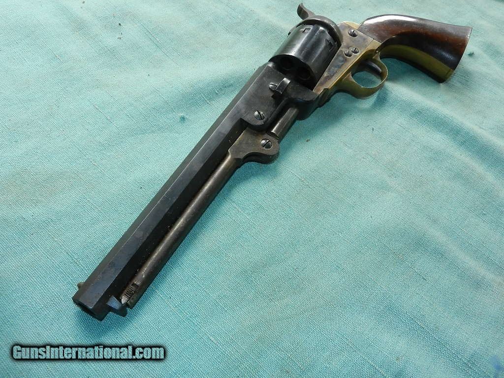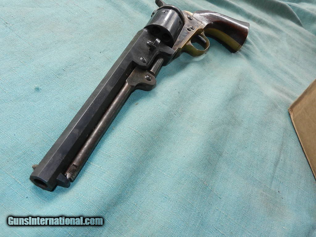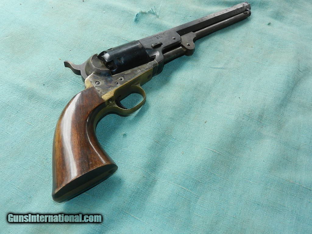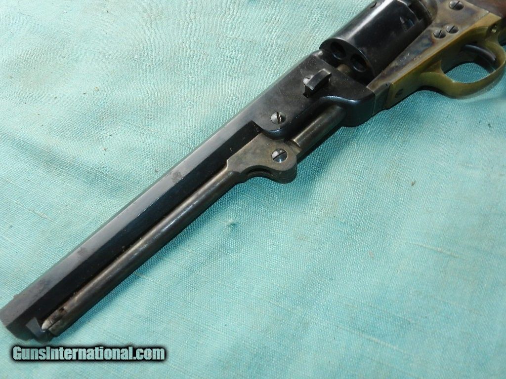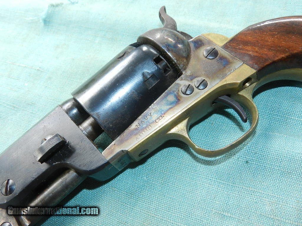 Description: SOLD With a SN of #3309, and .36 cal. with a 7 1/2” octagon barrel with an excellent bore. The metal surfaces retain about 85% original blue and case-hardened colors with most of the loss to scattered light to moderate oxidation blemishes, pitting, and a few handling marks. The brass gripped color case hardened steel frame rates about excellent showing scattered light tarnish. The smooth walnut one-piece factory grips rate excellent. The revolver functions mechanically with correct timing and lockup. Top of Barrel marked: Navy Arms Co and the right side of the barrel near the breech: GU MADE IN ITALY. A Uberti made gun imported for Navy Arms. Only noticable things are the afe spots from long term storage. When buying a gun always have it examined by a competent gunsmith before shooting. To buy a gun from me you must get a direct email for me, with details, and shipping cost. We don’t have a web site .I prefer money orders or a check. Item ships when funds come in. I try to keep guns affordable, which means I make less money than most dealers. You won’t get altitude sickness, or nose bleed, with my prices! I consistently have the best selection of older guns If you attempt to buy, you must still contact us for details . Best to email to buy. Sometimes a local person can stop buy and purchase before the gun is removed. Sometimes not home to get calls. Some guns are required shipment to a gun dealer near you for a transfer to you when it arrives. Otherwise many older or black powder guns ship to your door. With the widest selection of older guns at great prices, We don’t have a store, and sell on the internet only. I’m easy to get along with. Thank You SOLD |