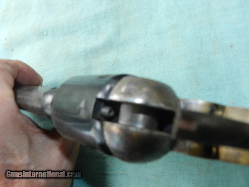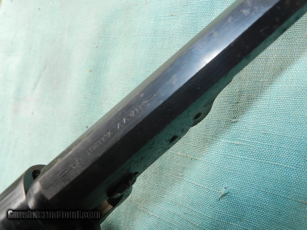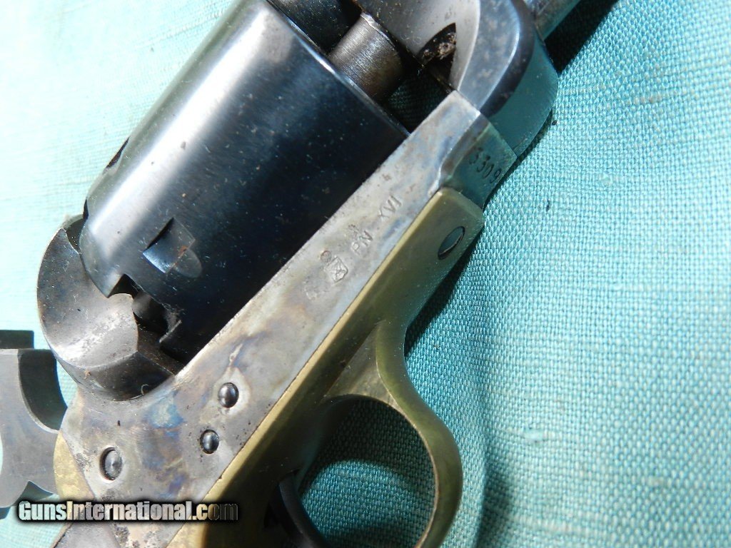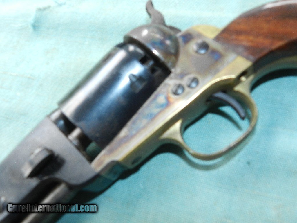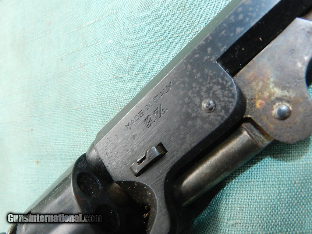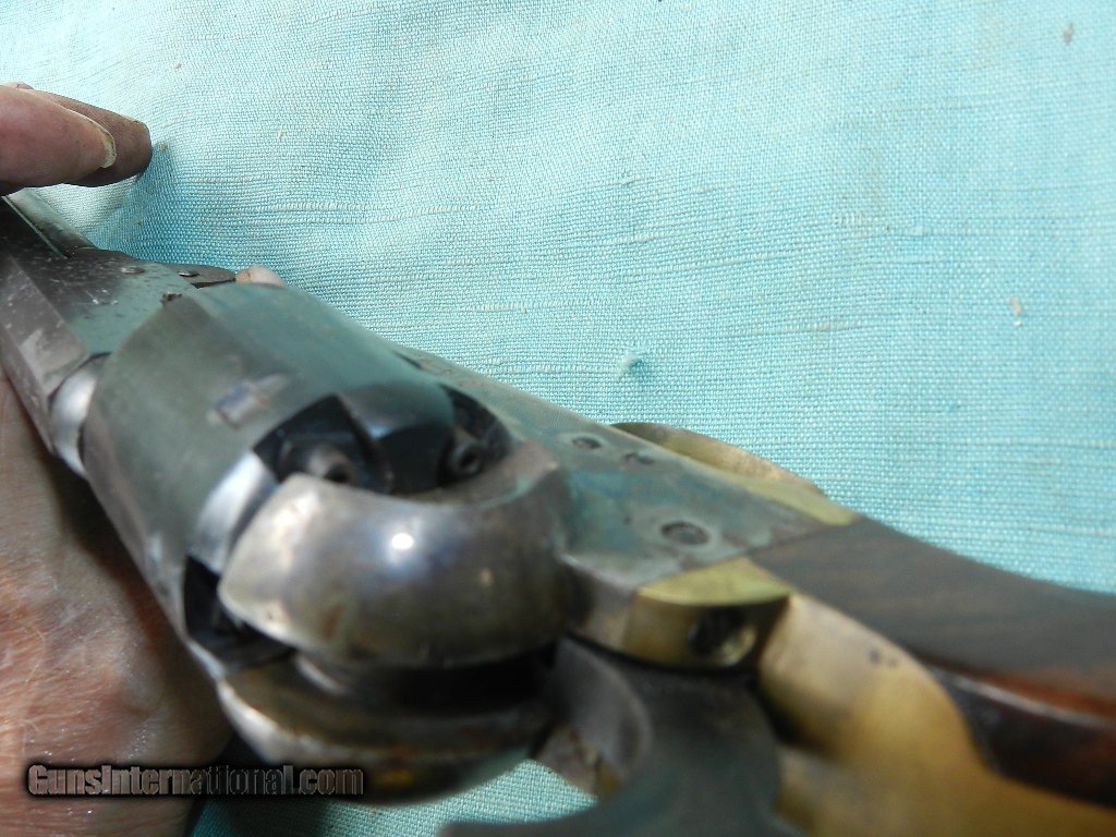 Description: SOLD With a SN of #3309, and .36 cal. with a 7 1/2” octagon barrel with an excellent bore. The metal surfaces retain about 85% original blue and case-hardened colors with most of the loss to scattered light to moderate oxidation blemishes, pitting, and a few handling marks. The brass gripped color case hardened steel frame rates about excellent showing scattered light tarnish. The smooth walnut one-piece factory grips rate excellent. The revolver functions mechanically with correct timing and lockup. Top of Barrel marked: Navy Arms Co and the right side of the barrel near the breech: GU MADE IN ITALY. A Uberti made gun imported for Navy Arms. Only noticable things are the afe spots from long term storage. When buying a gun always have it examined by a competent gunsmith before shooting. To buy a gun from me you must get a direct email for me, with details, and shipping cost. We don’t have a web site .I prefer money orders or a check. Item ships when funds come in. I try to keep guns affordable, which means I make less money than most dealers. You won’t get altitude sickness, or nose bleed, with my prices! I consistently have the best selection of older guns If you attempt to buy, you must still contact us for details . Best to email to buy. Sometimes a local person can stop buy and purchase before the gun is removed. Sometimes not home to get calls. Some guns are required shipment to a gun dealer near you for a transfer to you when it arrives. Otherwise many older or black powder guns ship to your door. With the widest selection of older guns at great prices, We don’t have a store, and sell on the internet only. I’m easy to get along with. Thank You SOLD |