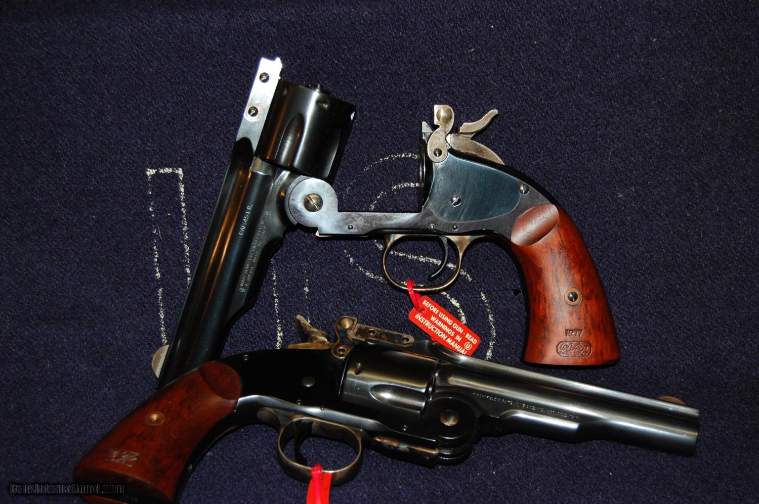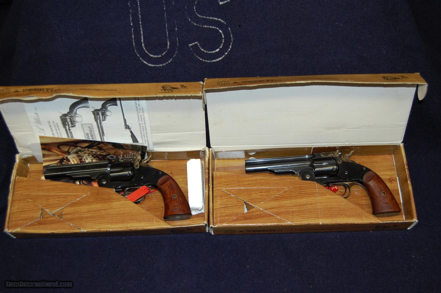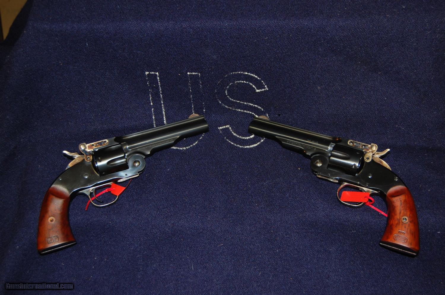 Description: Schofield 1875 Revolver Sold pending funds. This is a pair of Uberti Schofield 1875 revolvers with consecutive serial numbers. They are chambered in 45 Long Colt with 5 ½” barrels. These revolvers are unfired and have been setting in a safe for over ten years. Free Shipping. SOLD |