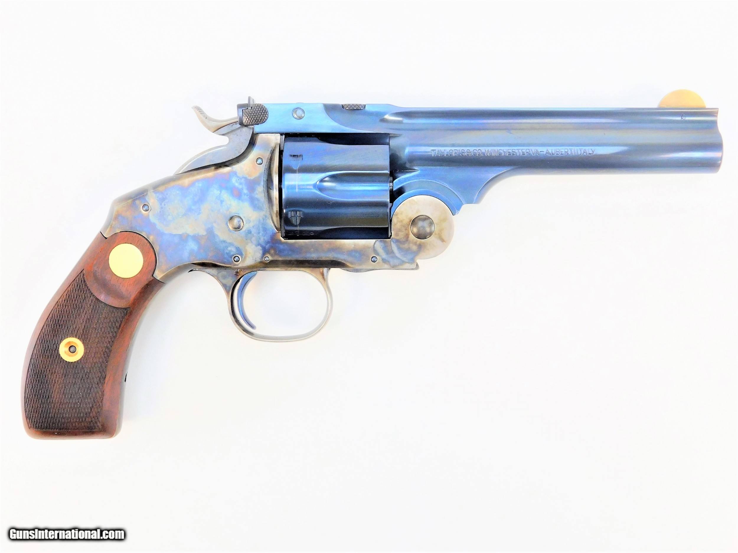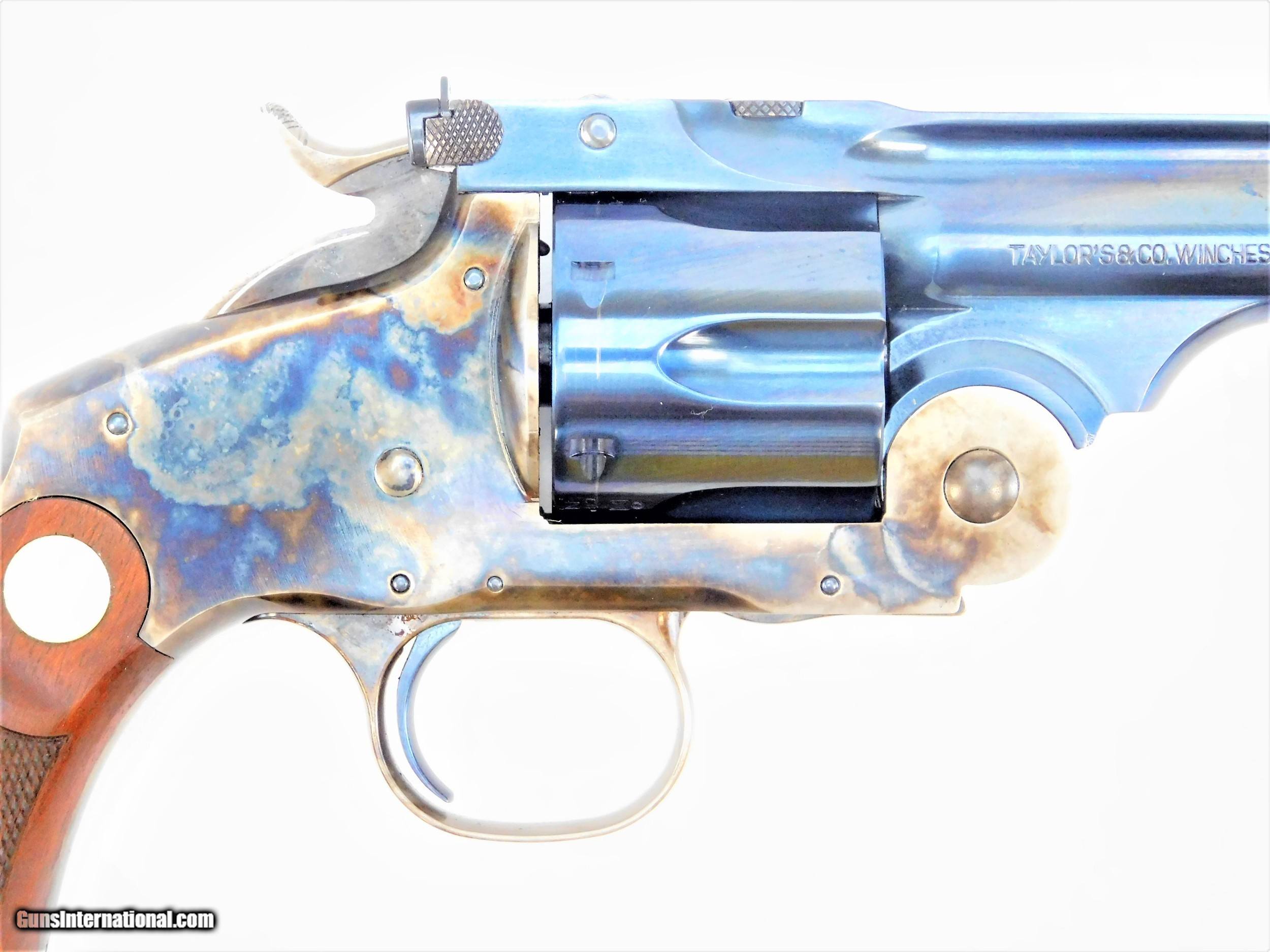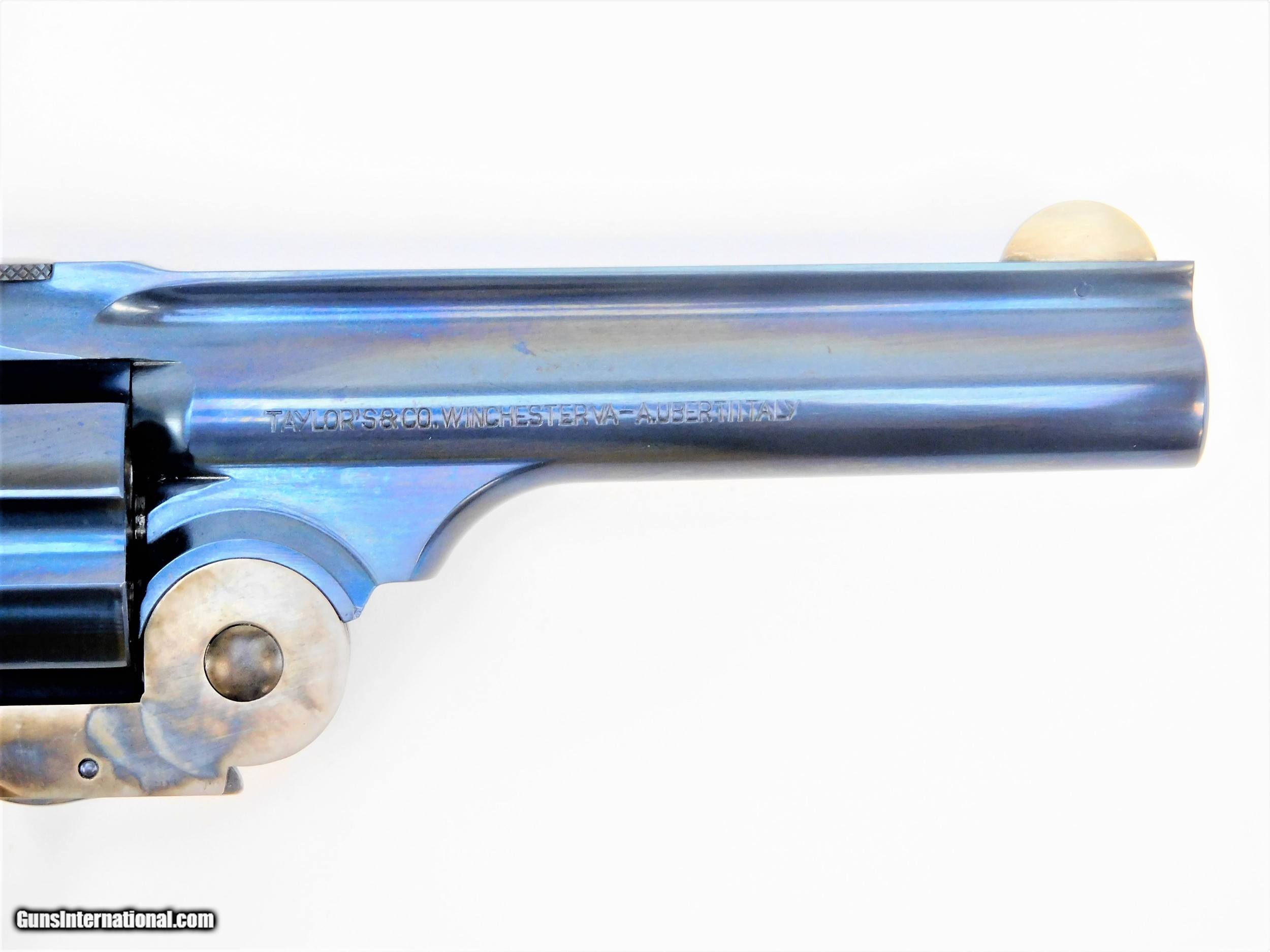 Description: BRAND NEW IN THE BOX AND READY TO SHIP! BUY IT NOW!! Manufacturer: Taylor's & Co. / A.Uberti Model: Frontier SKU: REV8654C09G27 Caliber: .45 LC Capacity: 6 Rounds Barrel Length: 5" Finish: Charcoal with Case Hardened Frame Grip: 2-Piece Checkered Walnut Overall Length: 10.66" Sights: Adjustable Rear, Front Blade Introduced by Smith & Wesson in 1885, the New Model No. 3 Frontier had a long cylinder that could fire a .44 Winchester® cartridge. Initially, 2,072 were produced. When sales did not take off as expected, almost 40 percent of those were modified and sold to a Japanese customer, Takata & Company. That left only 1,286 original revolvers in circulation. The company discontinued the model in 1908. This reproduction is chambered in modern cartridge options and its unique two-piece walnut grip includes brass medallions. The frontier barrel latch opens up and forward similarly to the Russian design, but includes a target sight blade for improved accuracy. KNOW YOUR LOCAL AND STATE LAWS!! ORDERS WILL ONLY BE ACCEPTED FROM US RESIDENTS OF THE LOWER 48 STATES, ALASKA AND HAWAII. OUR FFL CLASS DOES NOT ALLOW FOR THE EXPORT OF FIREARMS, THEREFORE WE CANNOT SHIP OUT OF THE US. IF YOU ARE INTERESTED IN PURCHASING THIS ITEM, PLEASE COMPLETE YOUR ORDER BY REFERRING TO THE "SELLER'S INFORMATION" ABOVE. SOLD |