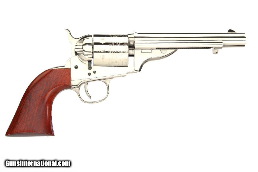 Description: Manufacturer: Taylor's & Company / A. Uberti of Italy Model: 1851 Navy Open Top Revolver SKU: 550703 Caliber: .38 Special Capacity: 6 Round Cylinder Barrel Length: 5.5" Engraving on Cylinder Overall Length: 11.03" Weight: 2.40 lbs Frame: Steel Finish: Nickel Plated Grips: Walnut Sights: Blade Front, Rear Sight on Back of Barrel All items are factory new in box unless otherwise stated. Based on the information available to us, the above specifications describe this item to the best of our knowledge. For further information, please contact or visit the manufacturer's . SOLD |