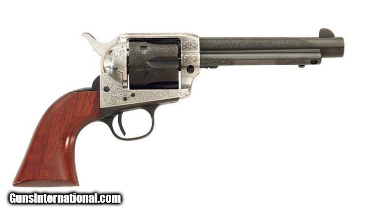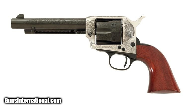 Description: Manufacturer: Taylor's & Co. / Uberti Model: 1873 Cattleman Photo Engraved - Taylor Tuned SKU: 706AWEDE Caliber: .45 Colt Capacity: 6 Rounds Barrel Length: 5.5" Finish: Coin Finish Hardened Frame With Blued Parts Weight: 2.5 lbs Grip: Walnut OAL: 11.10" Sights: Fixed Front Blade, Rear Frame Notch This cattleman is photo engraved and then hand-chased for extra depth at the factory. This particular model features a coin finish forged frame with steel blued parts over an all floral engraving pattern. The revolver comes with smooth walnut grips. SOLD |