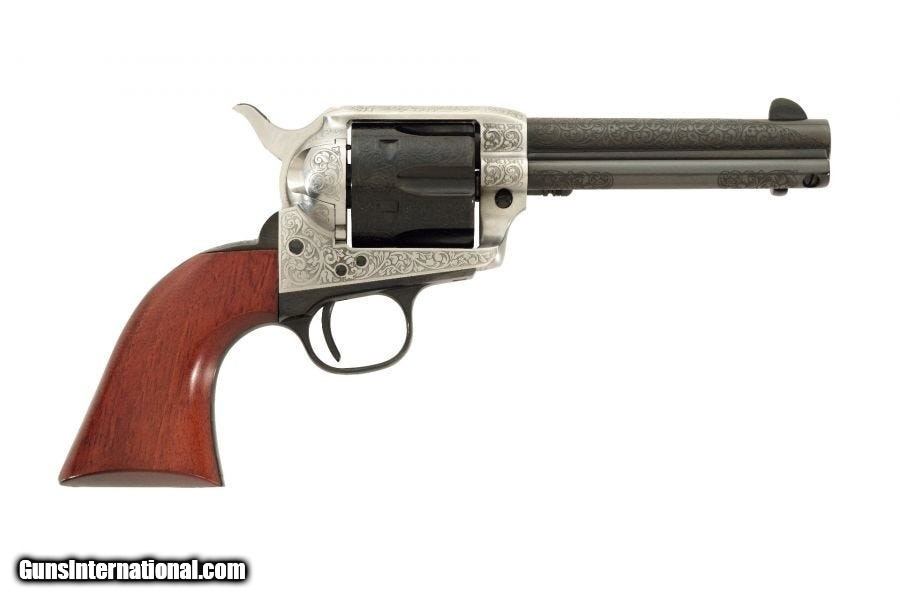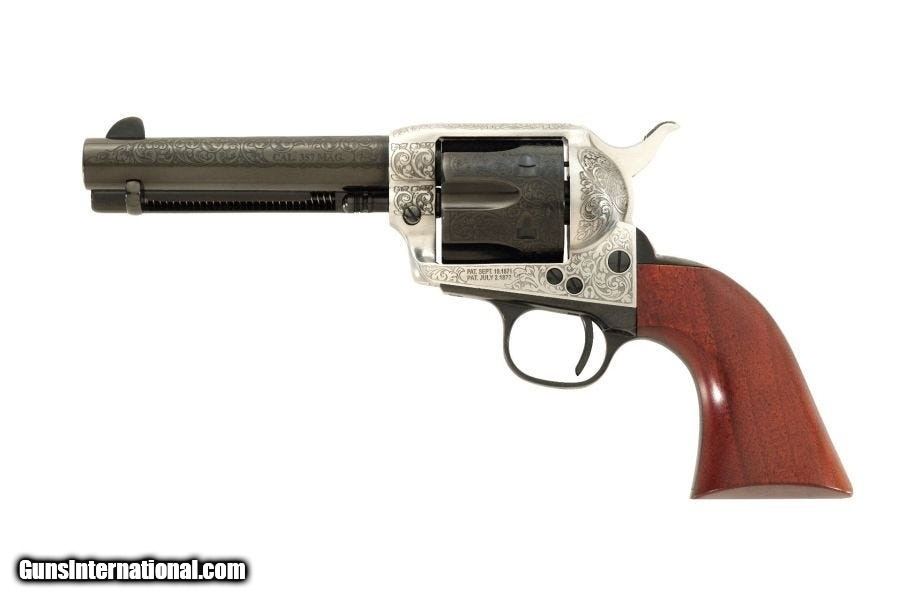 Description: Manufacturer: Taylor's & Co. / Uberti Model: 1873 Cattleman Photo Engraved SKU: REV/708AWE Caliber: .357 Magnum Capacity: 6 Rounds Barrel Length: 4.75" Finish: Coin Finish Hardened Frame With Blued Parts Weight: 2.45 lbs Grip: Walnut OAL: 10.35" Sights: Fixed Front Blade, Rear Frame Notch This special finished cattleman is floral photo engraved and then hand-chased for extra depth at the factory. It also features a coin finish forged steel frame, blued steel parts, and a walnut Navy size grip. SOLD Handgun Caliber: .357 Magnum |