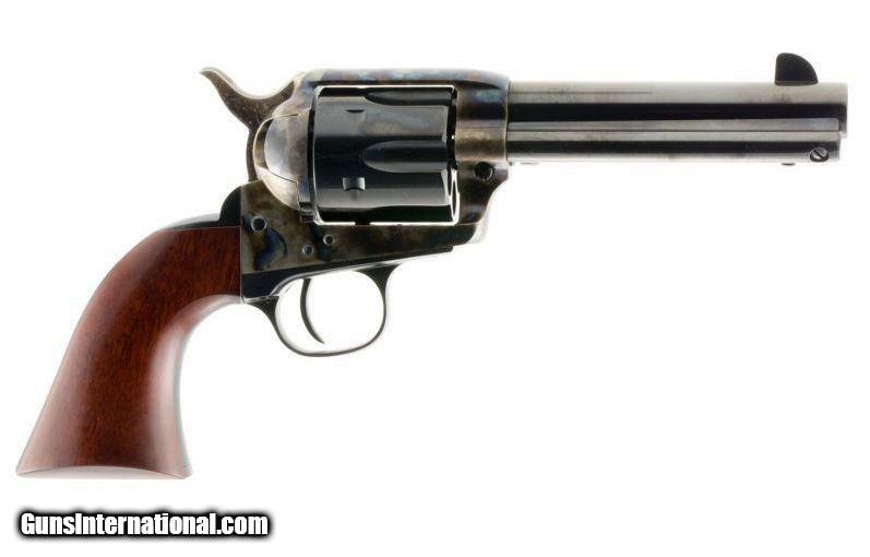 Description: Manufacturer: Taylor's & Co. / Uberti Model: Cattleman Standard Finish SKU: REV/700A Caliber: .45 LC Capacity: 6 Rounds Barrel Length: 4.75" Finish: Blued Finish with Case Hardened Frame Grip: Walnut Overall Length: 10.35" Sights: Front - Fixed, Rear - Notch Weight: 2.45 lbs The New Model frame Cattleman is the most accurate reproduction of the peacemaker that won the west. New Model frame Cattlemans in the standard finish feature: case-hardened forged steel frame, blued steel parts, smaller Navy-size grip, wider front fixed blade & rear sight frame notch, and spring-retained quick release cylinder pin. SOLD |