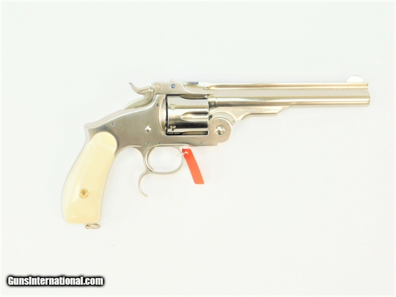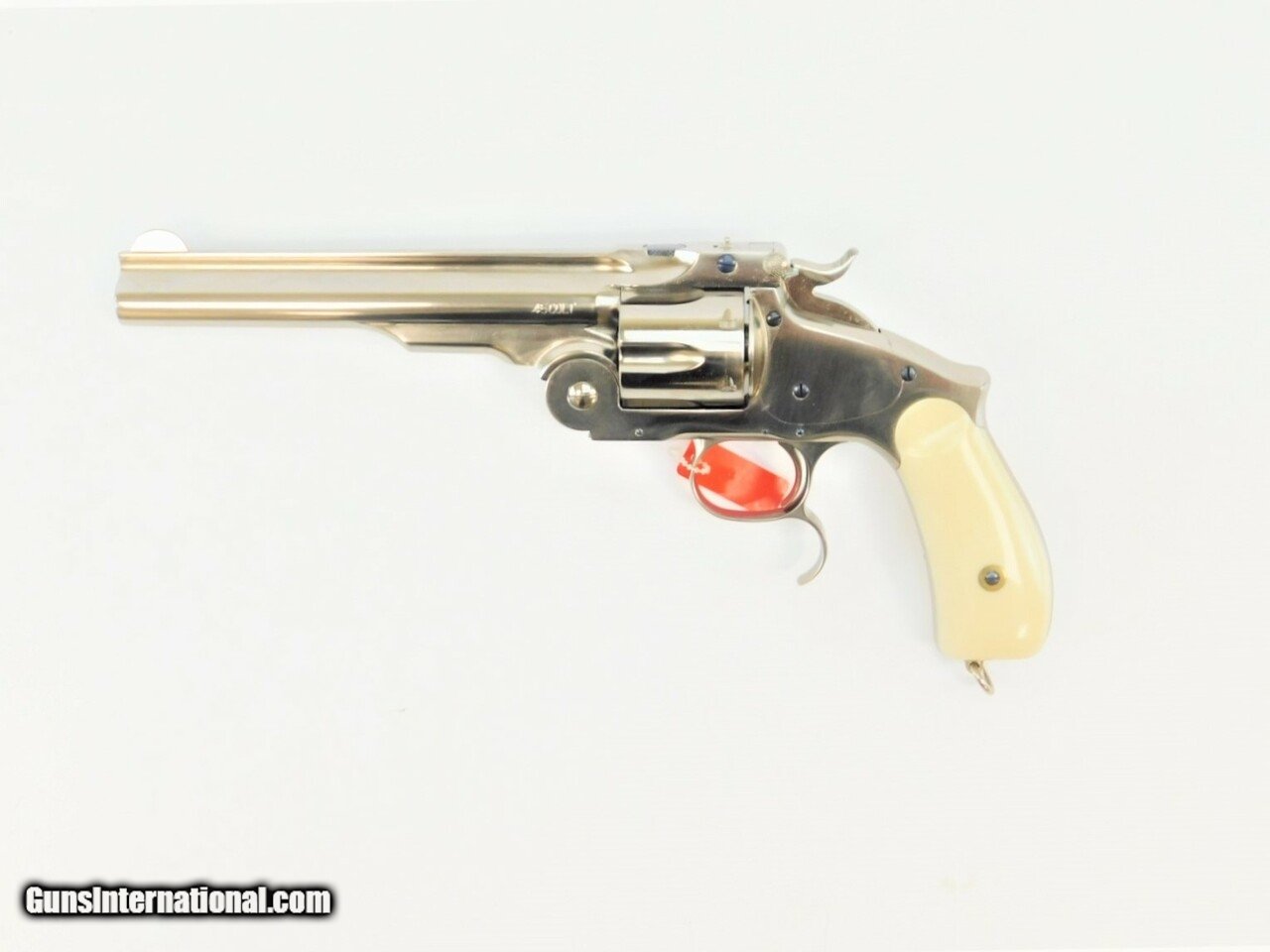 Description: Manufacturer: Taylor's & Co. / Uberti Model: Russian SKU: REV/0867N04G13 Caliber: .45 Long Colt Capacity: 6 Rounds Barrel Length: 6.5" Finish: Nickel Weight: 2.82 lbs Grip: Ivory OAL: 13.38" Sights: Blade Front, Rear sight on back of barrel Taylors and Company 0865: The Russian was a favorite side arm of the Russian government and is the largest of the top-break revolvers. Modeled after the Smith & Wesson Schofield this revolver features a hump-backed frame two-piece walnut grips lanyard ring and triggerguard with a spur. The Russian barrel latch opens up and forward with a rear sight notch incorporated into it. SOLD |