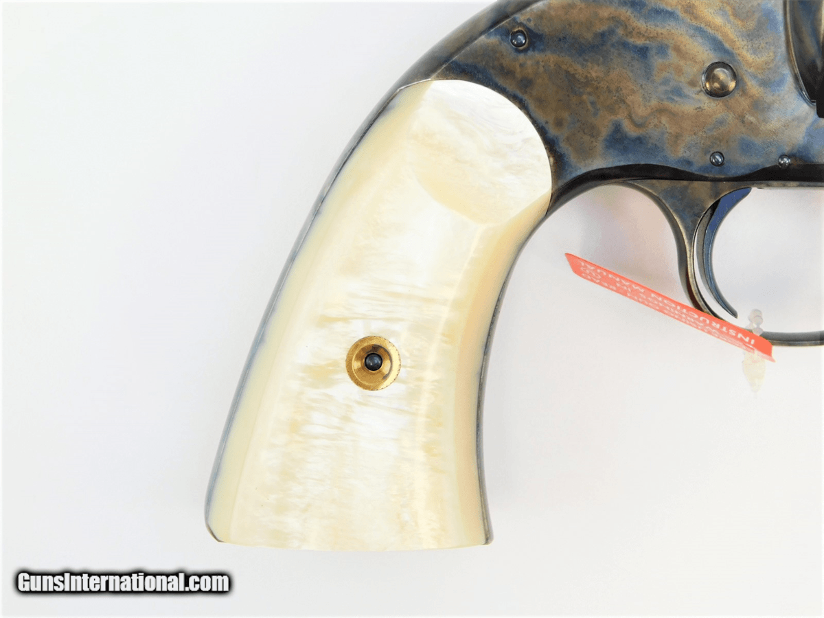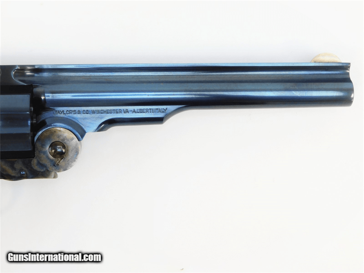 Description: Manufacturer: Taylor's & Co. / Uberti Model: Schofield SKU: 550641 Caliber: .45 Colt Barrel Length: 7" Finish: Charcoal Blue Barrel and Cylinder Capacity: 6 Rounds Frame: Color Case Hardened Overall Length: 12.75" Grips: 2-Piece Pearl Sights: Fixed Front Blade, Rear Sight on Back of Barrel Weight: 2.97 lbs All items are factory new in box unless otherwise stated. Based on the information available to us, the above specifications describe this item to the best of our knowledge. For further information, please contact or visit the manufacturer's . SOLD |