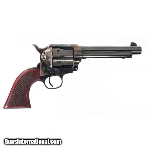 Description: Manufacturer: Taylor's & Co. / Uberti Model: The Smoke Wagon SKU: REV/4108DE Action: Single Caliber: .357 Magnum Capacity: 6 Rounds Barrel Length: 5.5" Round Finish: Blue Finish with Case Hardened Frame Weight: 2.50 lbs. Grip: Checkered Walnut OAL: 11.10" Sights: Fixed Front Blade, Rear Frame Notch Exclusively from Taylor's & Co., The Smoke Wagon® is a second-generation, stagecoach-style, single-action revolver. It boasts a low-sitting hammer and wider-style sights that allow for faster sight acquisition. It also features a blue finish with a case-hardened frame, and a thin, richly detailed, checkered grip for comfort and improved aim. All of the previous features are available on both the standard and Taylor Tuned version of The Smoke Wagon®. The Taylor Tuned model also includes hand polishing, custom hammer and trigger springs, trigger pull set at three pounds, jig-cut, positive angles on all triggers and sears for a crisp, reliable action. The Taylor Tuned Smoke Wagon® features one of the smoothest hammer and trigger pulls on the market. SOLD |