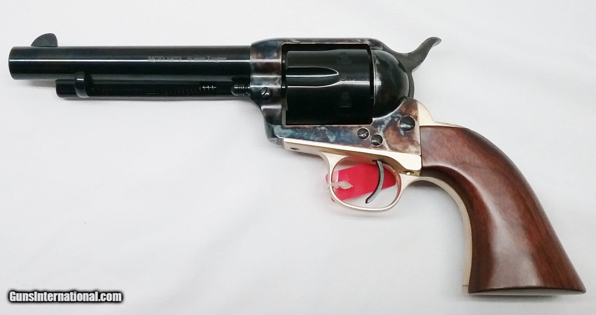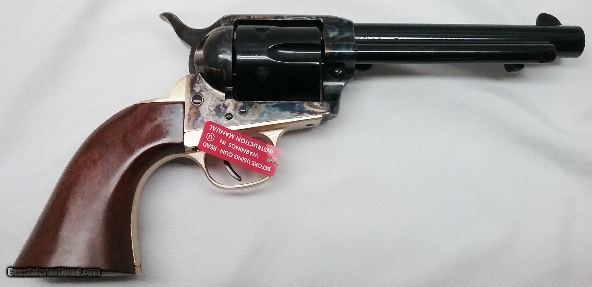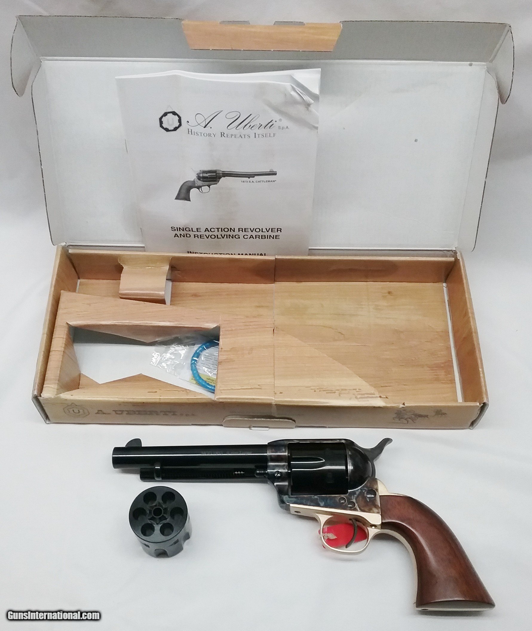 Description: C419 Uberti - 1873 Cattleman – 9MM / .357 - Stk #C419 This conversion Uberti 1873 Cattleman 9MM / .357 Colt has a 5-1/2” blued barrel mounted with a blade front sight. The bore is new unfired. The Walnut grips are attached to the color case hardened frame. Comes with two cylinders; one 9MM and one .357 magnum. This revolver is in NIB. The weight is 2 lbs, 5 oz. Our stock number is C419. Will ship to any FFL in the United States, buyer pays freight and insurance. SOLD Handgun Caliber: .357 Magnum, 9x19mm Parabellum (9mm Luger, 9x19mm NATO) Manufacturer: Uberti Model: 1873 Bore: Rifled Chambers: 6 Condition: New Metal Condition: New Wood Condition: New Bore Condition: Excellent - Unfired Barrels: One Barrel Type: Tapered Round Action: Single Action Triggers: 1 Finish: Blued/Color Case Hardened Weight: 2.3 lbs. Sights: Fixed Extras: .357 cylinder Case: Factory Box Item Location: OR - Oregon |