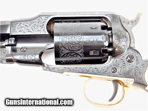 Description: Manufacturer: Uberti Model: 1858 Deluxe SKU: 341011 Caliber: .44 Cylinder: 6-Shot Barrel Length: 8" Octagonal Overall Length: 13.6" Grooves: 7 Material: Blue Steel Frame and Backstrap, Brass Trigger Guard Finish: Blue Steel Engraved Grips: Ivory-Style Weight: 2.7 lbs Uberti exclusive edition of this legendary firearm has been lavishly engraved by the atelier of Master Cesare Giovanelli, a renowned name in the world of premium firearms. The engraving is hand-chased, making each revolver unique; the floral design comes from an original 19th century pattern and covers the entire metal surface of the revolver – from the hammer to the backstrap and trigger guard, from the cylinder to the barrel and loading lever. Uberti 1858 Deluxe Edition is chambered in the original .44 caliber cap-and-ball round and features a deep blue finish, color-case hammer, brass trigger guard and textured, simulated ivory grips. SOLD |