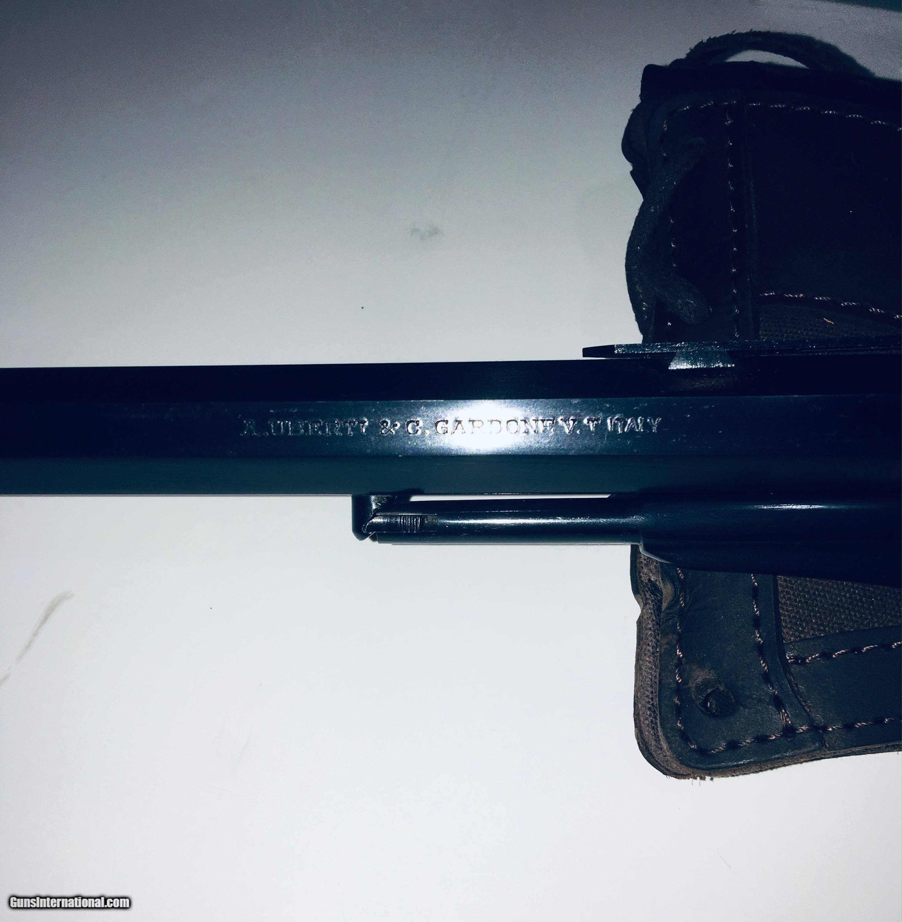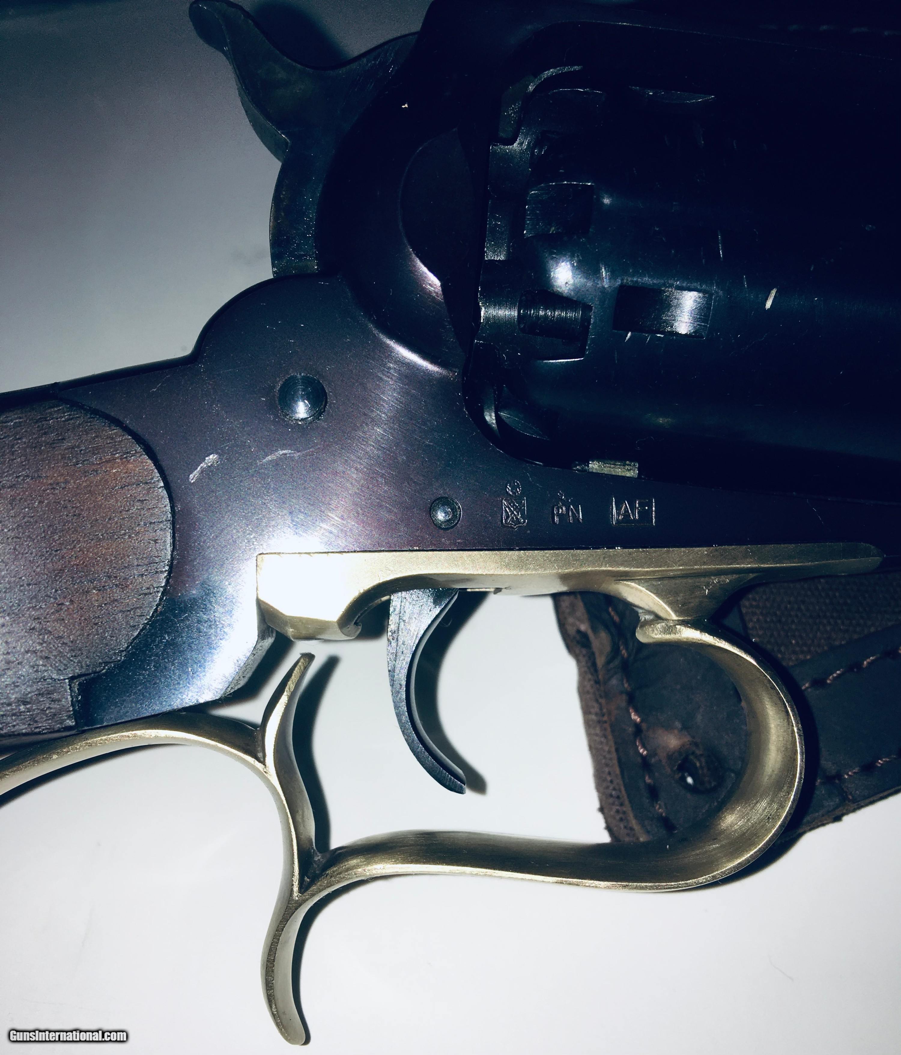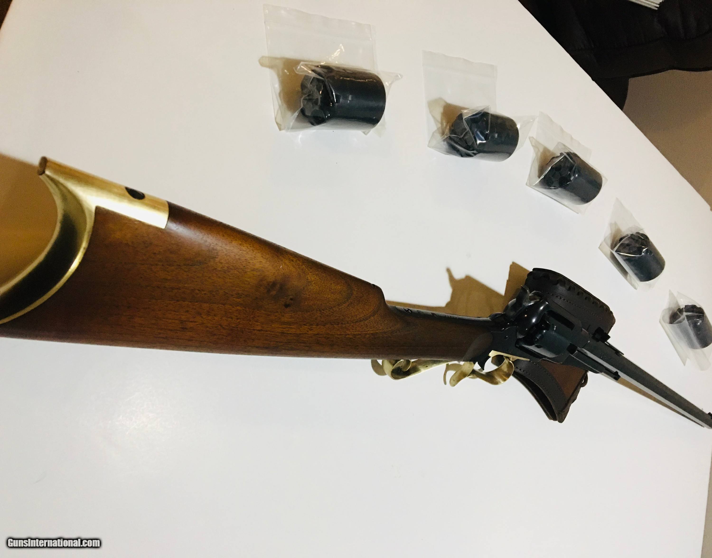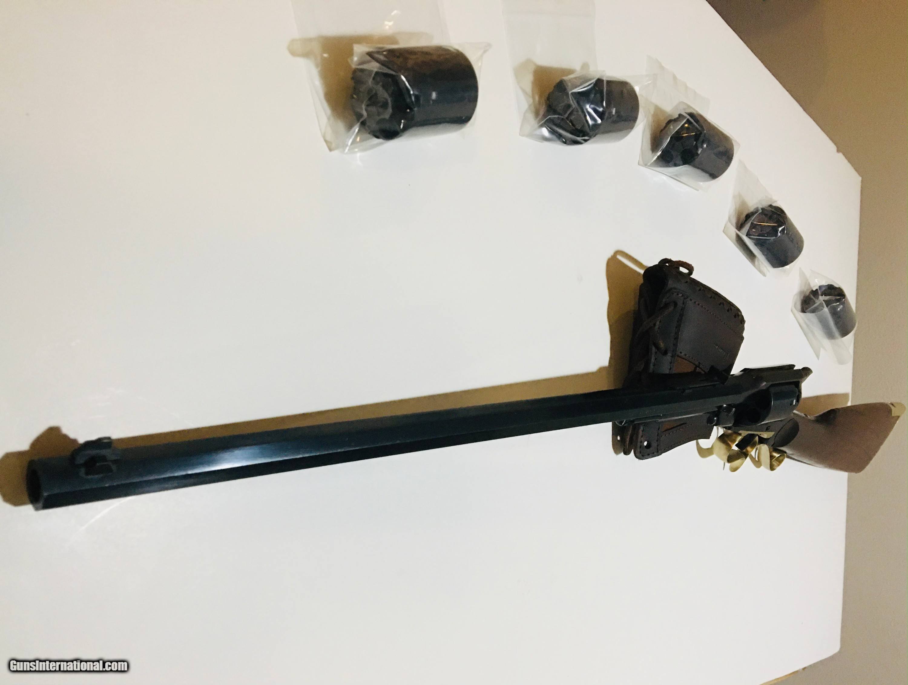 Description: Pistol carbine with five extra brand new cylinders SOLD Handgun Caliber: .44 Manufacturer: Uberti Model: 1858 Remington Barrel Length: 20” Condition: Very Good Metal Condition: Excellent Wood Condition: Very good Bore Condition: Excellent |